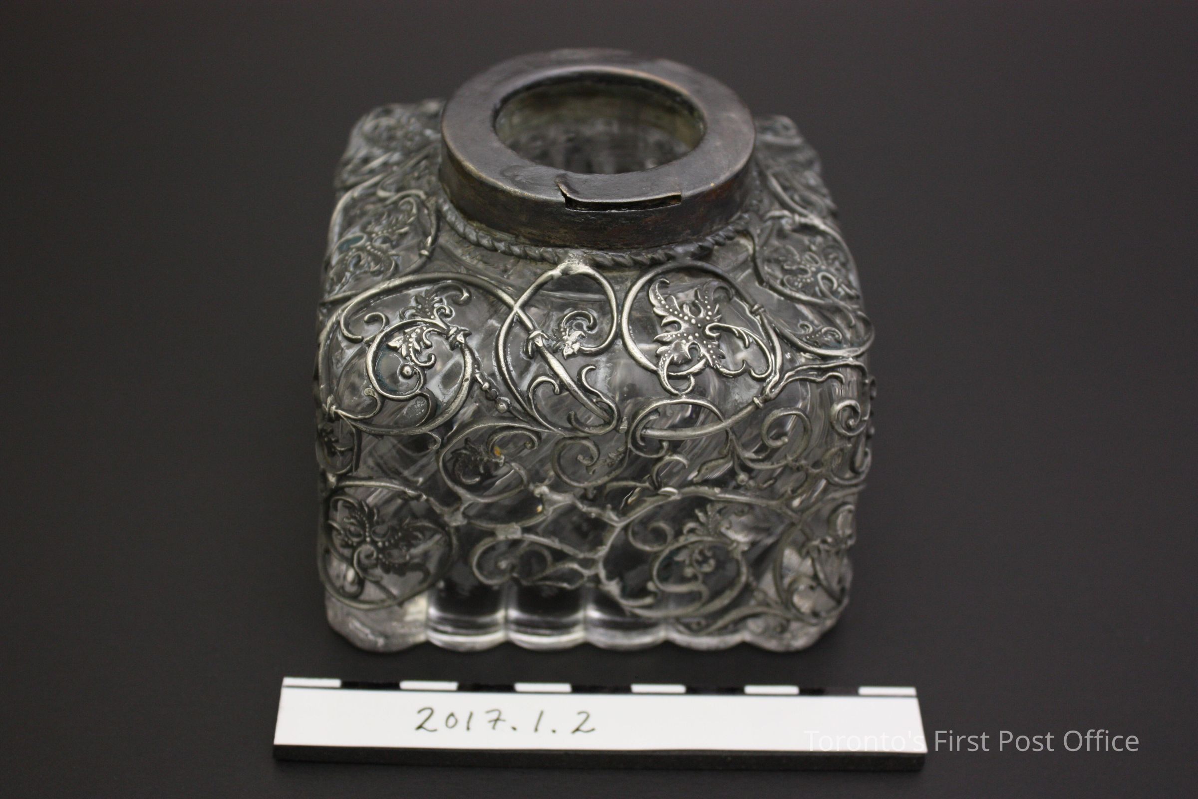 Glass square inkwell. Covered with fine metal scrollwork, with floral/leaf design. Missing the top cap.Dimensions