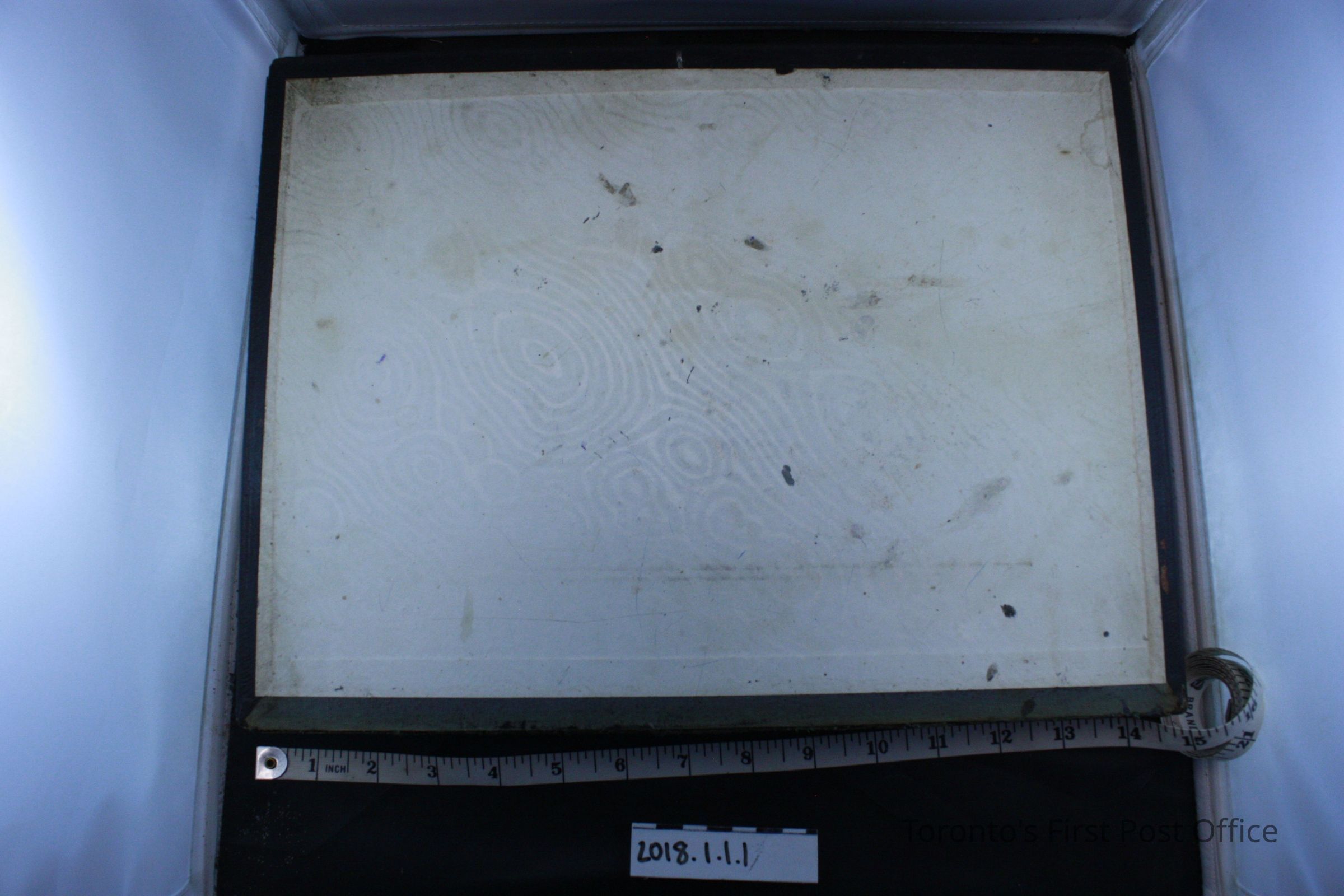 Wood and leather postal lap desk with key that opens the box. Inside the box has 4 compartments, with 2 compartments at the right side labelled "Postage Stamps" and "Pens". Contents in the box include: Used red sealing wax partially stamped "Sutton", two pieces of black sealing wax, bag of assorted clips and caps, used eraser printed "A.W Faber's Improved Artists' Rubber" on one side, stamp head with "C.G.H" stamped on front plate, two travelling inkwells, black vulcanized India rubber ruler with one side stamped "Goodyear's Patent 1849-1851 Poppenhusen & Konig", metal pen nib case that contains 6 pen nibs, box of pen nibs titled "100 Pens, A.W Faber" that contains 10 pen nibs, dark red pencil with ivory cap and brass tip with label "No. 3 * A.W Faber's Patent Aug. 13th 1861", and wooden straight pen with brass nib case stamped "Faber N.Y".Dimensions