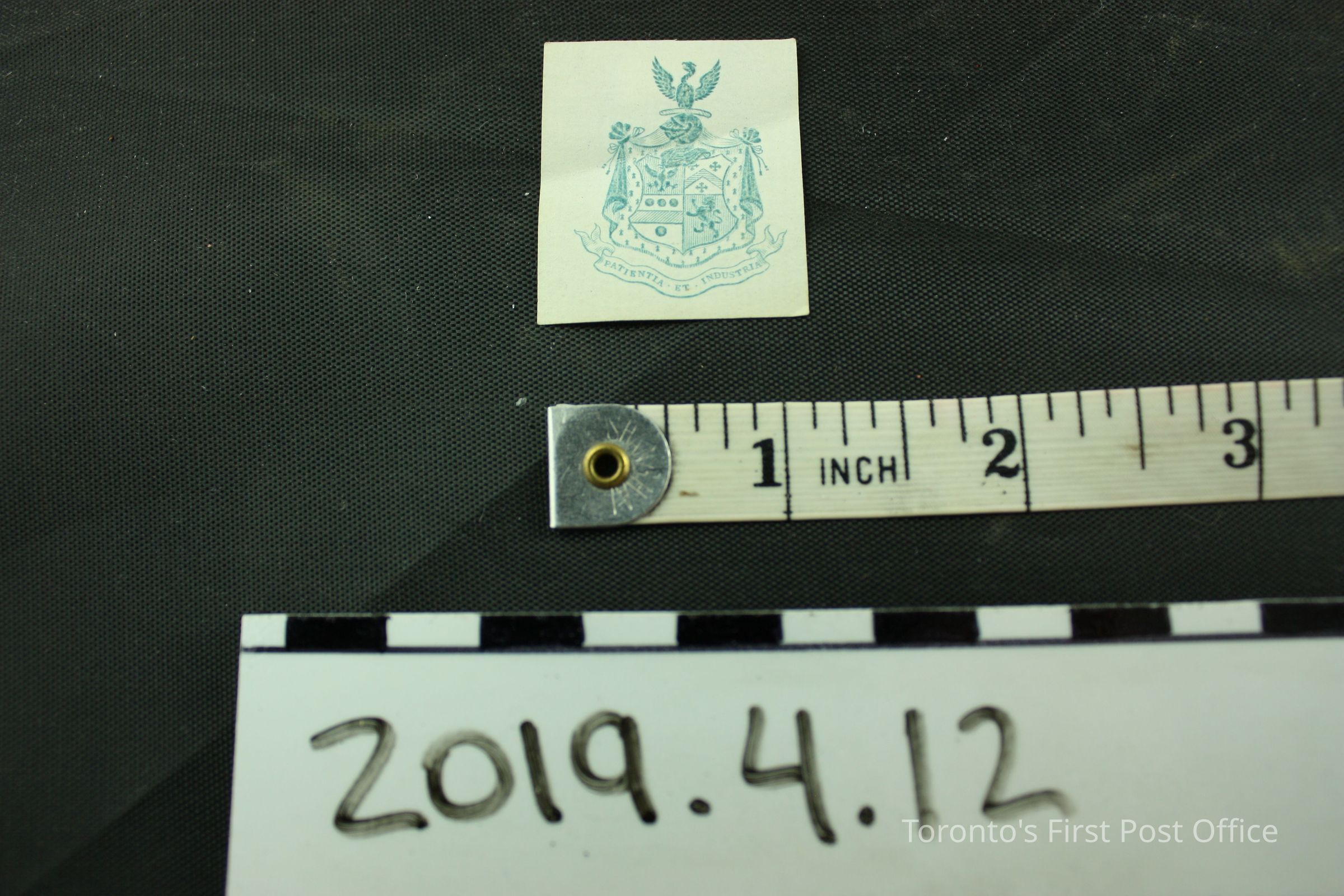 Rectangular letterhead cutout (?) showing coat of arms with armour helmet, eagle, and lion. Printed with blue ink, inscription: " PATRIA ET INDUSTRIA". Paper "flap" on back (common for stamp collecting) with glue residue.Update Date