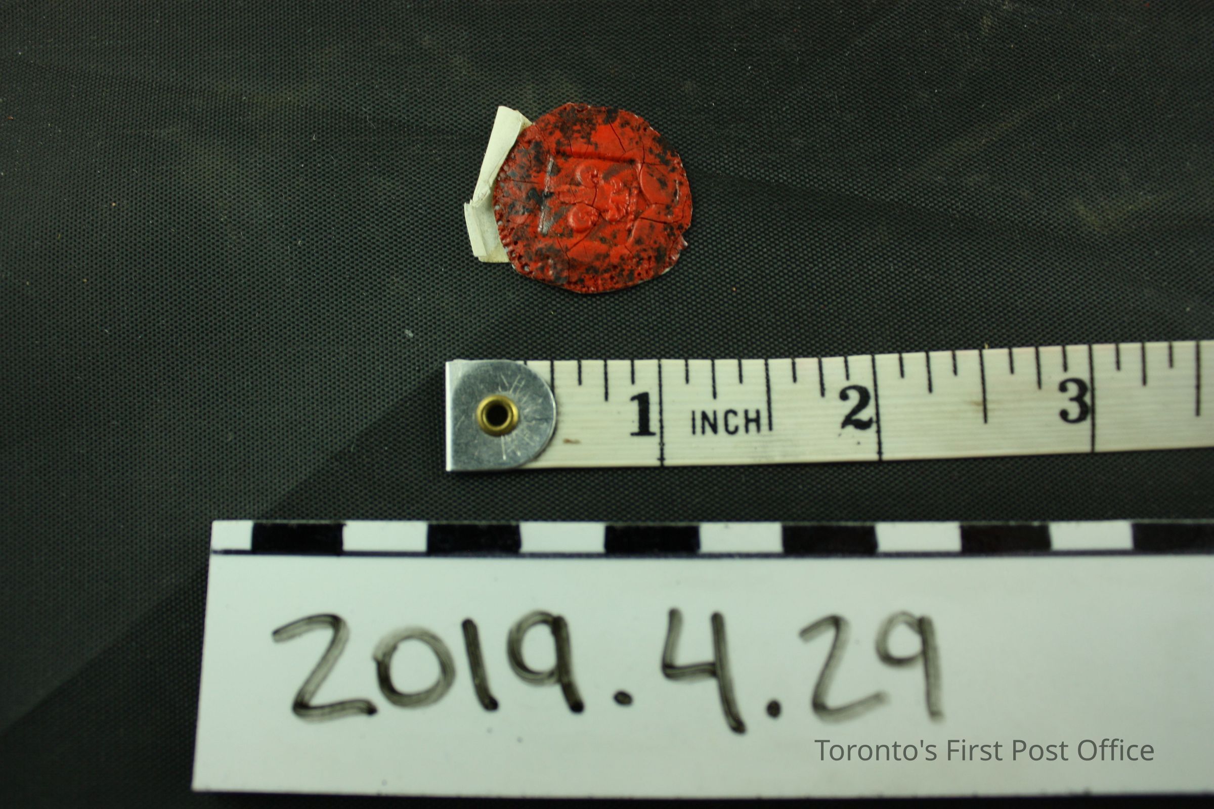 Cut out of red wax seal on paper with many black wax spots throughout, seal design: fleur de lisDimensions