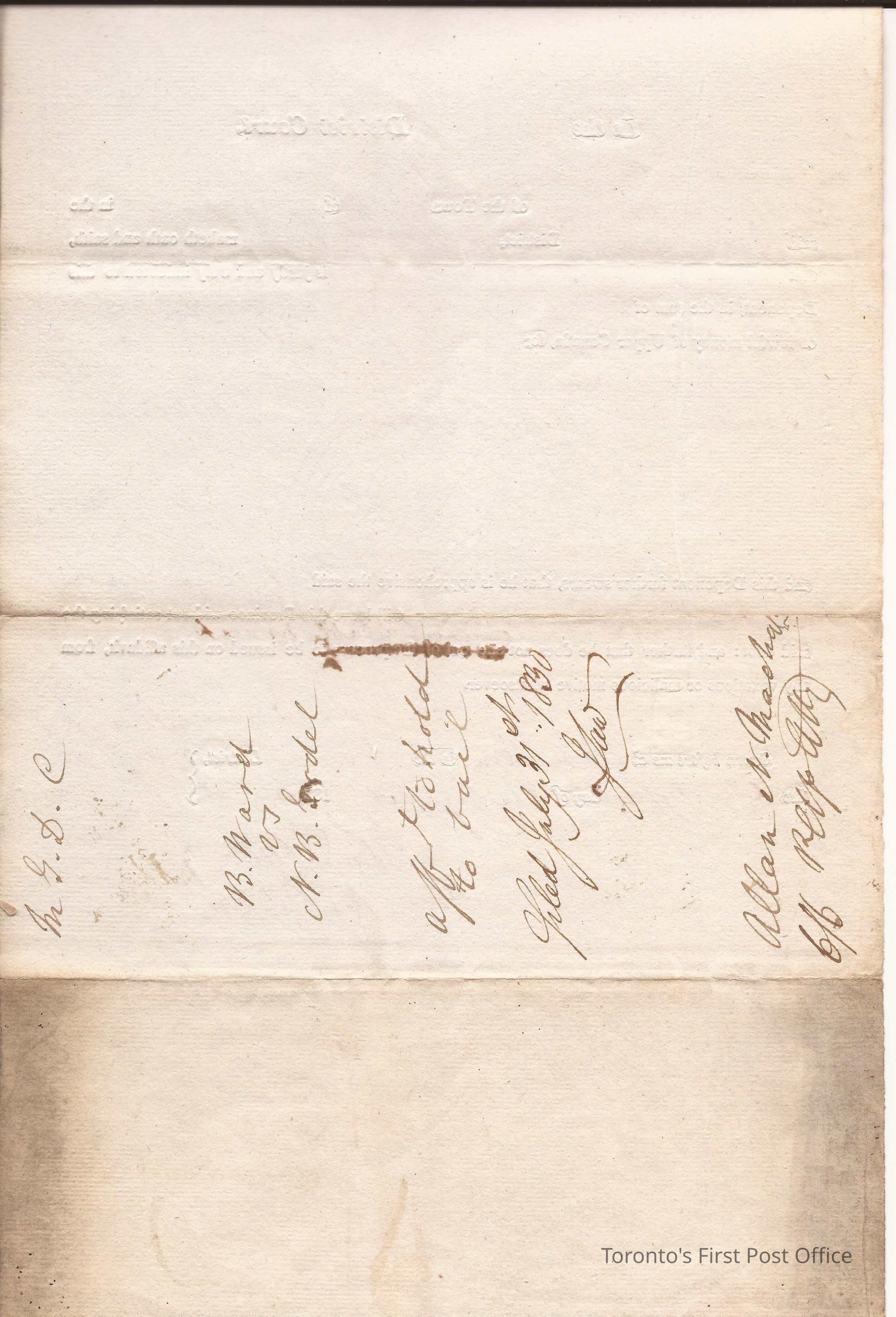 Affidavit to hold bail in case of B. Ward vs. N.B. Goodel; re: Goodel indebted to Bernard Ward for 2 pounds, 3 shillings, and 6 pence; signed Bernard Ward; signed John Saw clk GD ct (Clerk Gore District Court); filed July 31st 1830; signed Allan N. MacNabb Pltfs Atty.Update Date