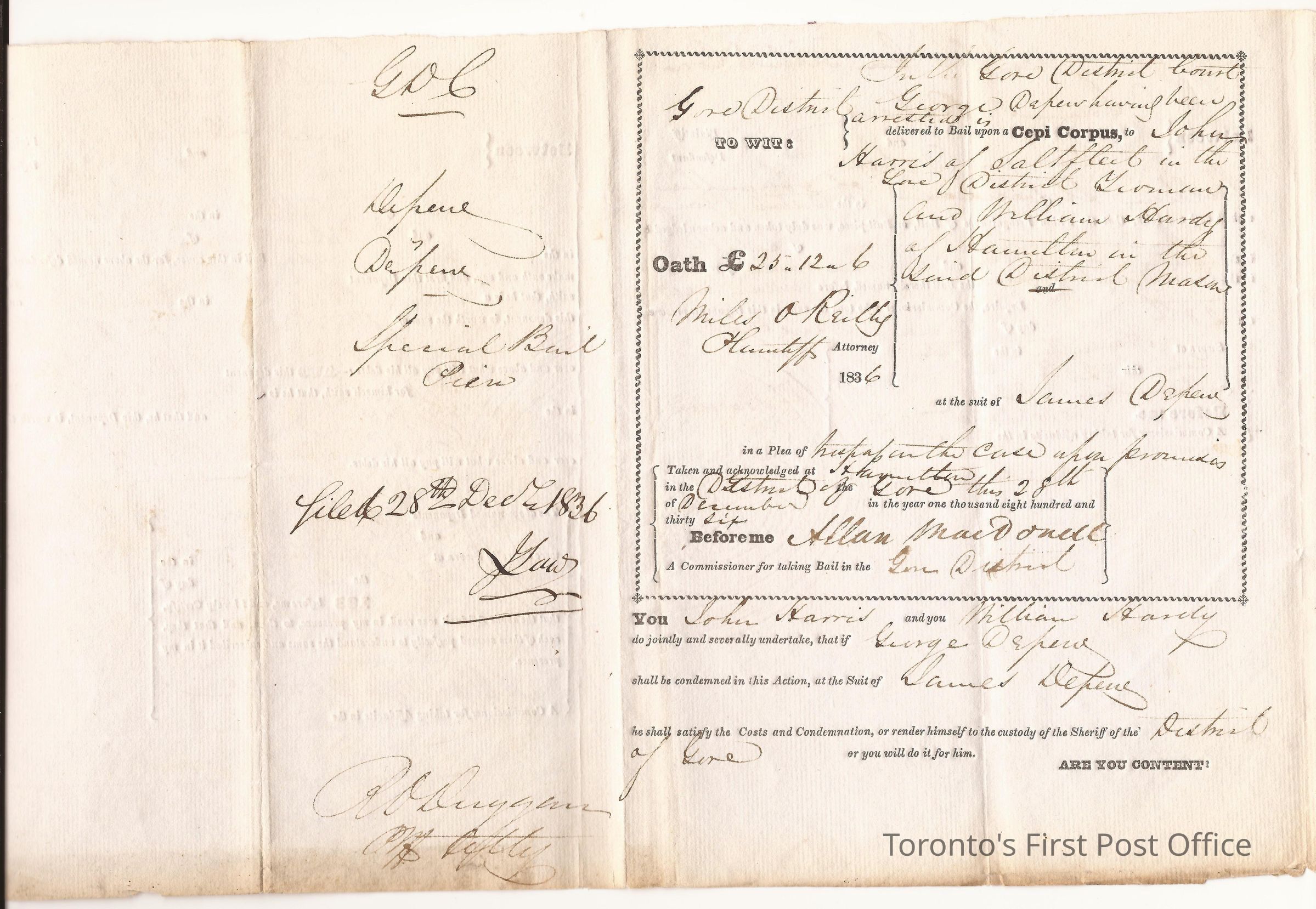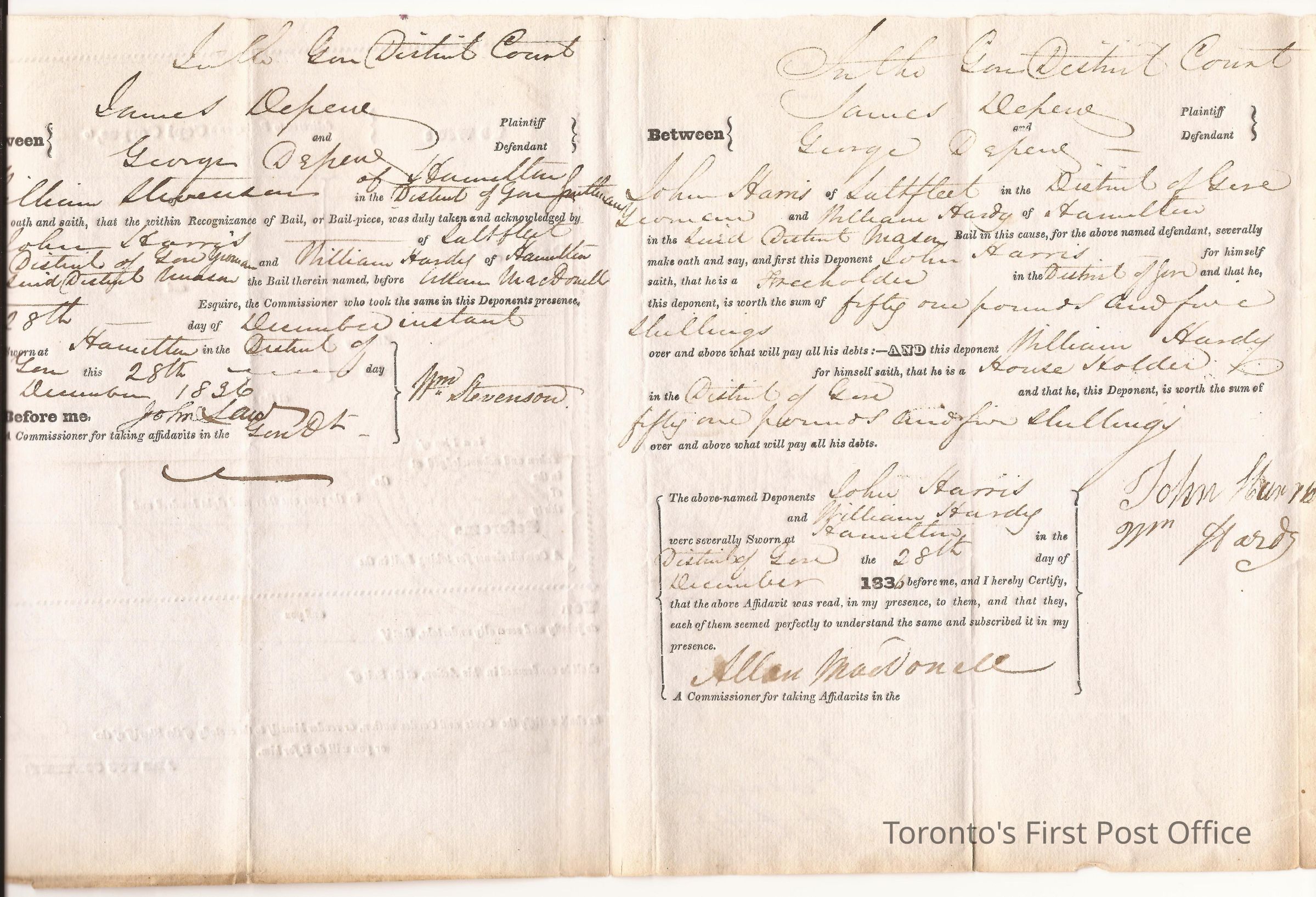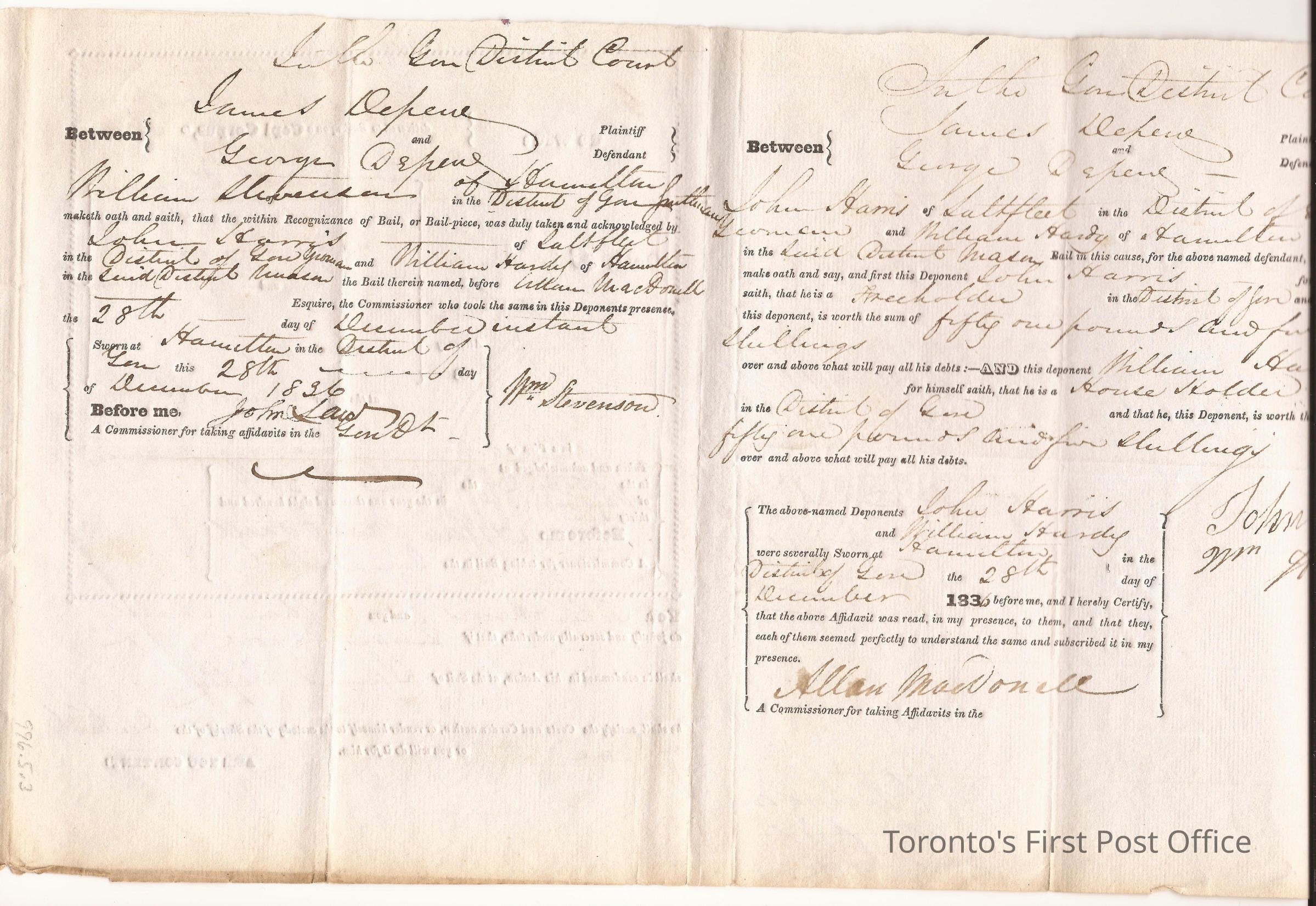 Affidavit; in matter of George Defresne vs. James Defresne; re: debts; affidavit taken by Allan MacDonell and Wm. Stevenson; also signed by John Sturb(?) and Wm. Handy; printed and manuscript; watermark: Britannia; dated Gore District Court filed 28th Decr 1836.Dimensions