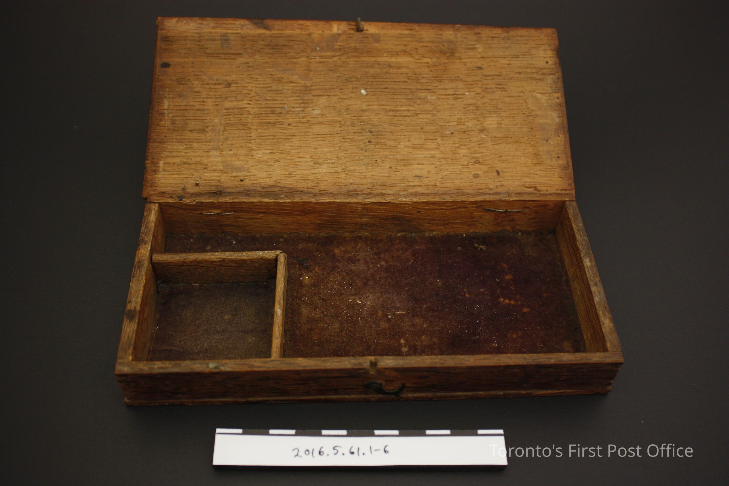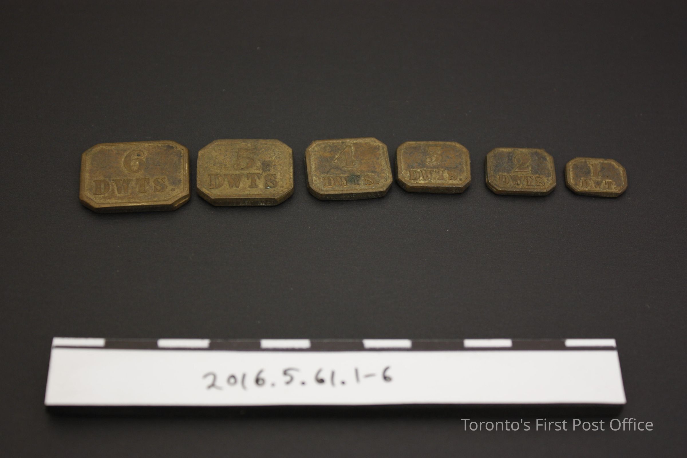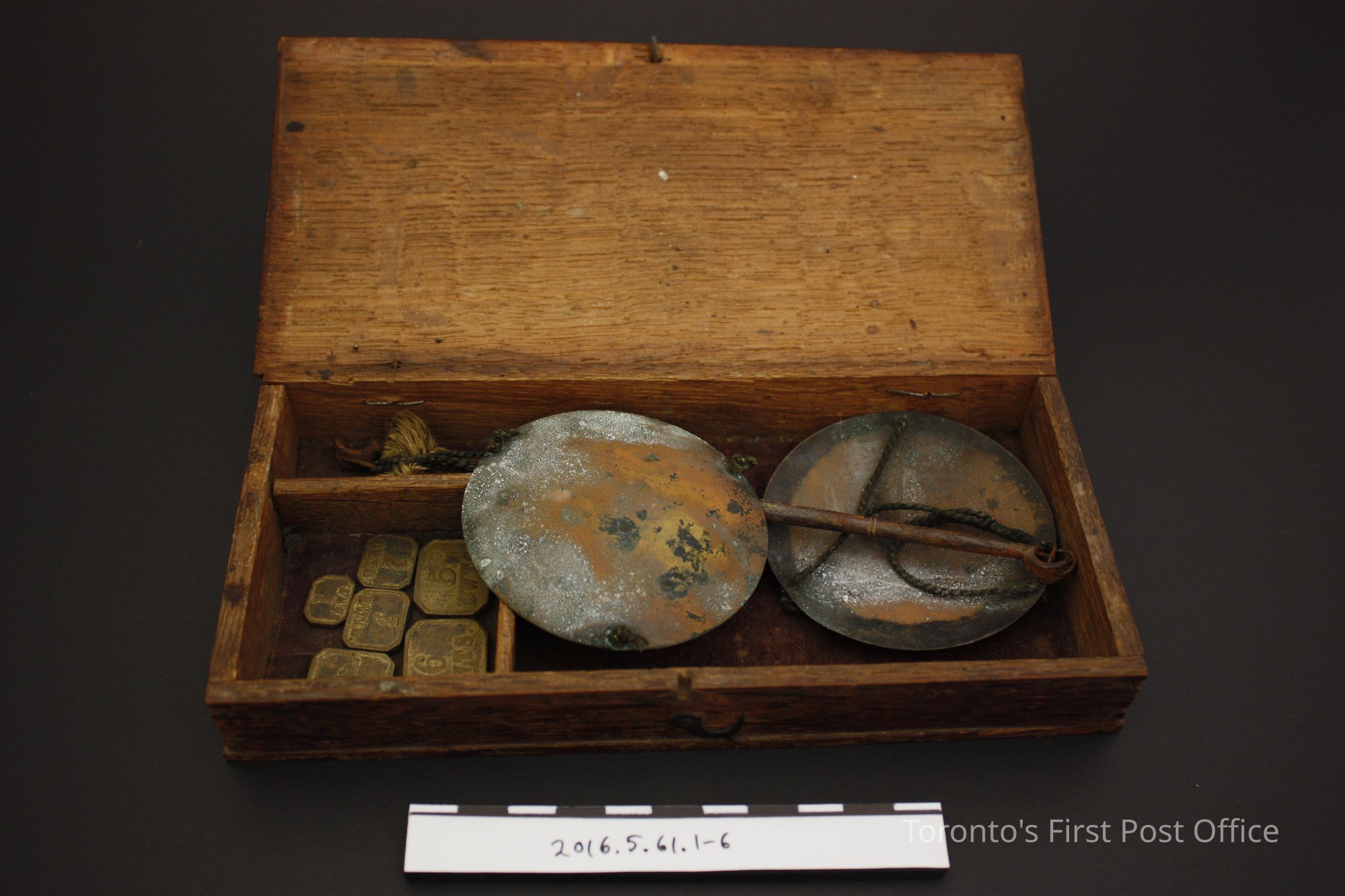 Travelling apothecary scale. Wooden box with light borwn velvet lined bottom. Set includes a balance and zinc?/copper? scale pans attached by dark green cord and six brass weights. Each weight is marked with its amount and 'DWTS' on the obverse, and cicles corrosponding to the amount number on the reverse. The box lid and base are connected with wire to the front wall of the base.Dimensions