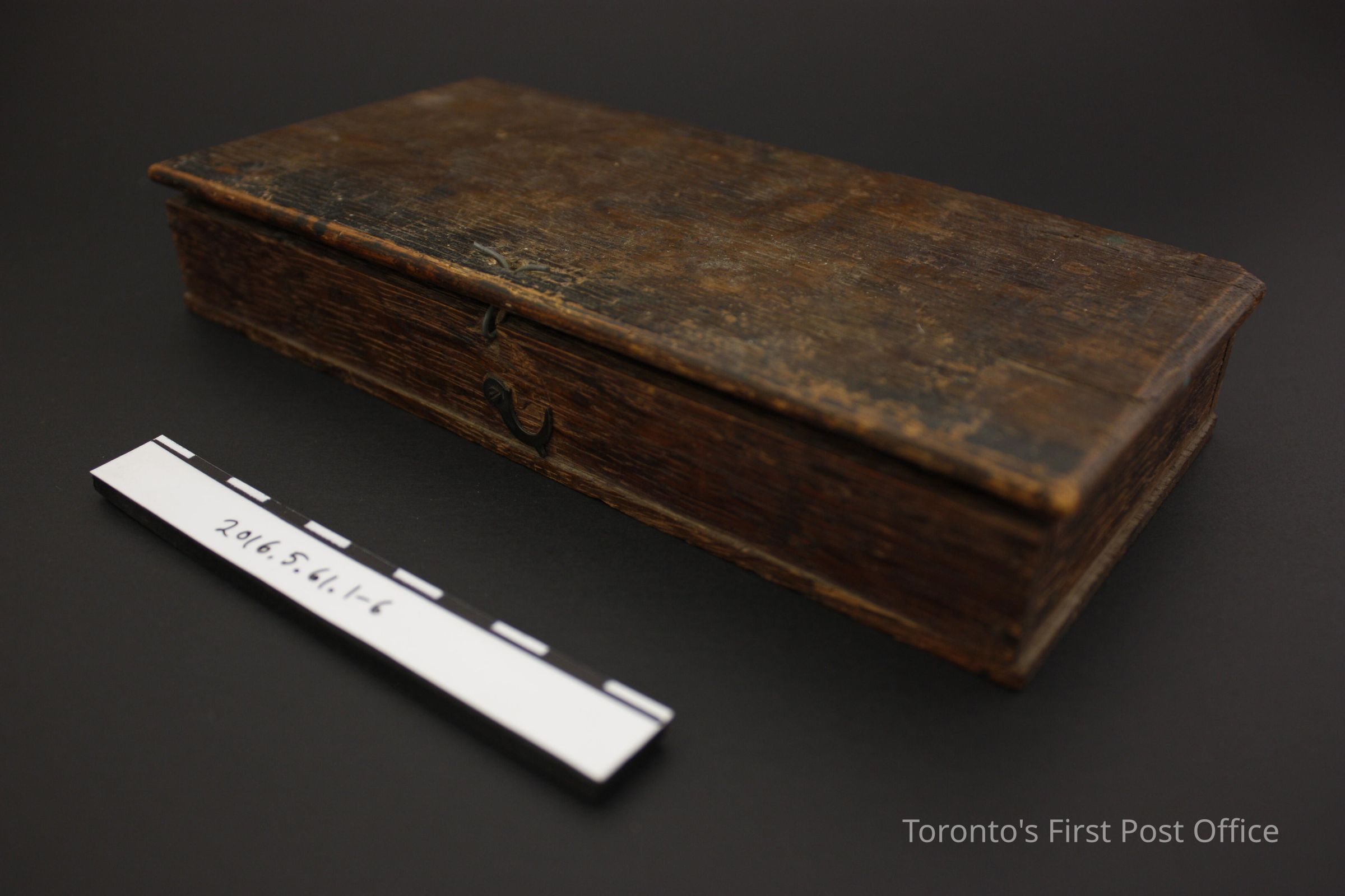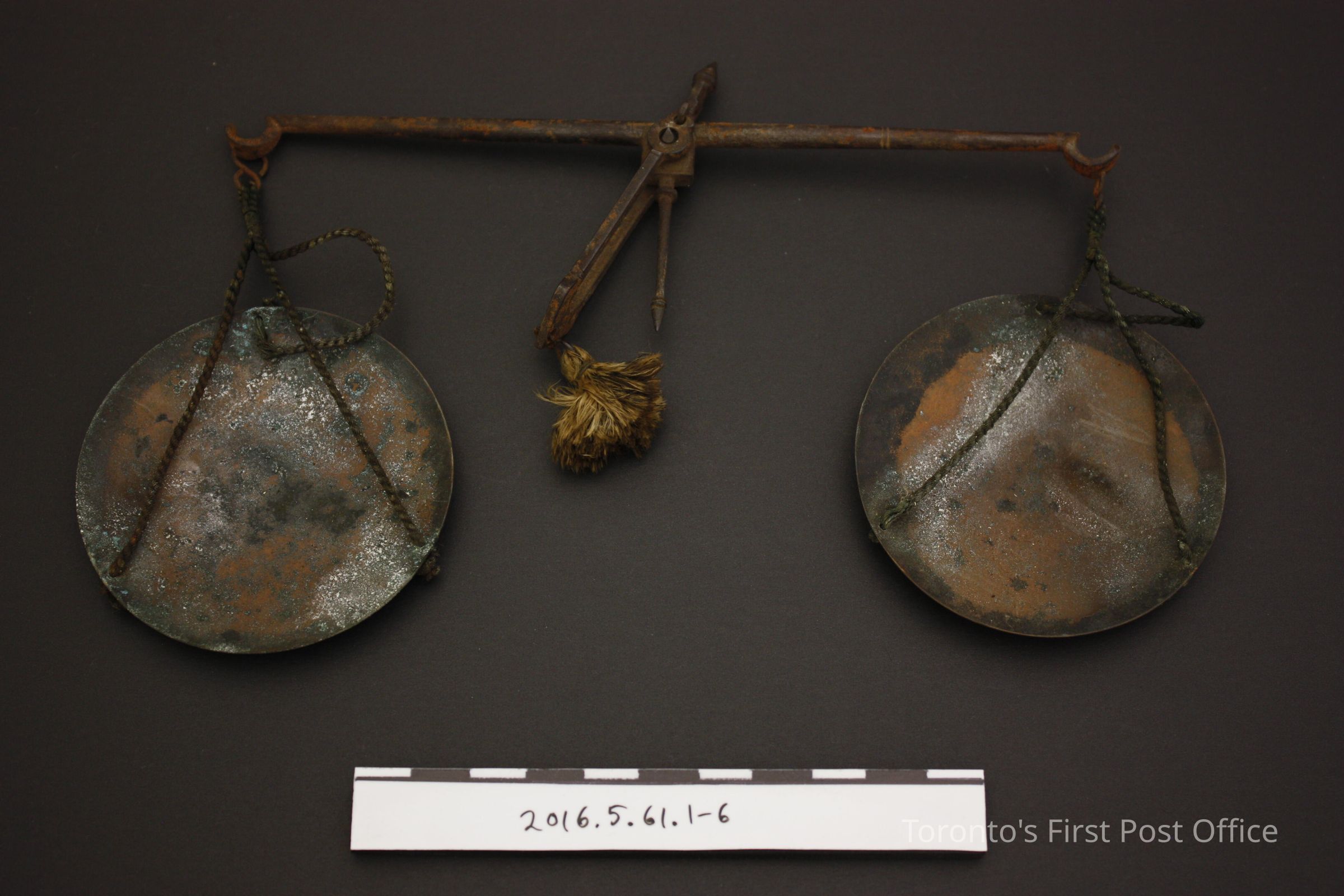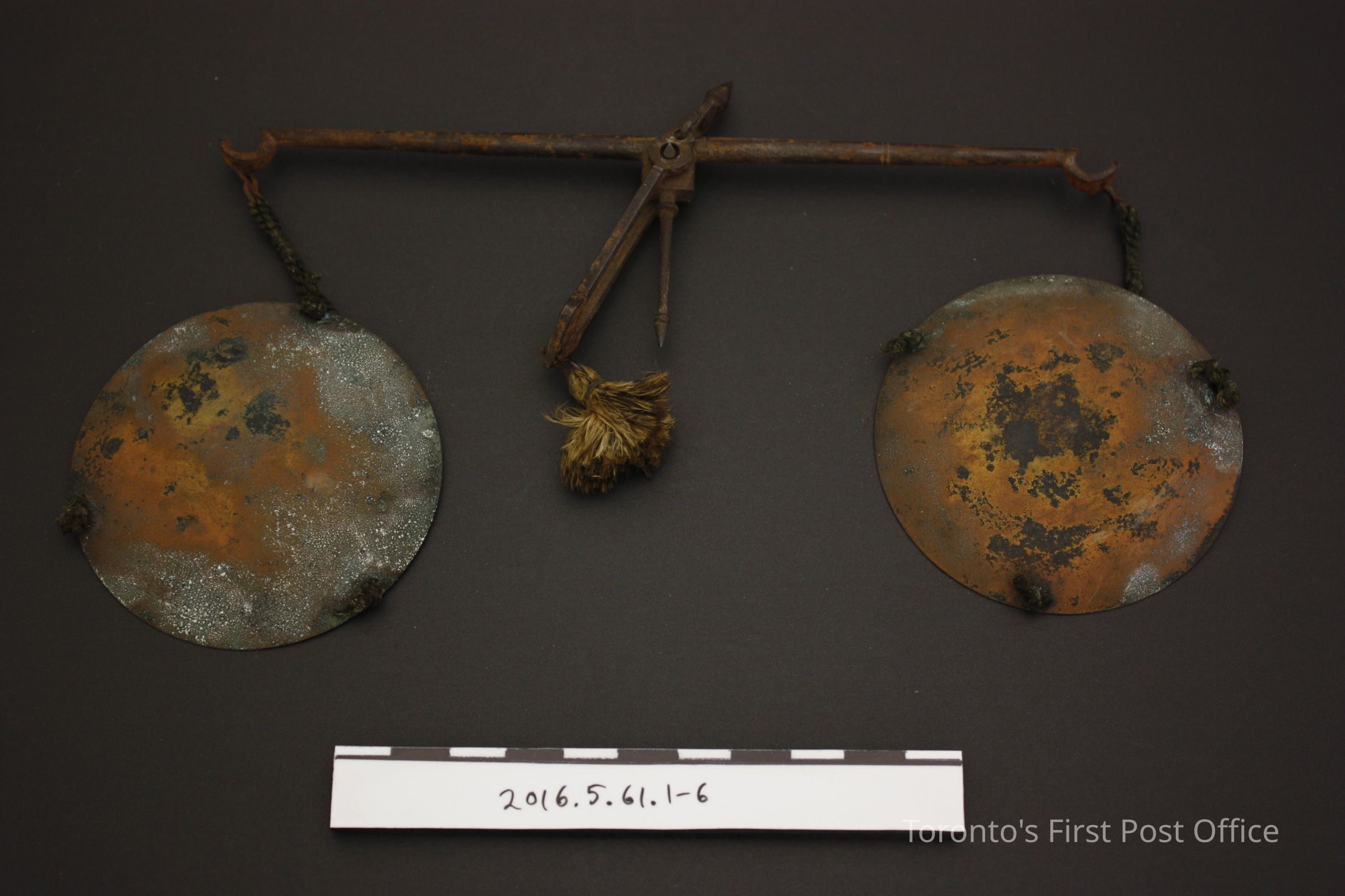 Travelling apothecary scale. Wooden box with light borwn velvet lined bottom. Set includes a balance and zinc?/copper? scale pans attached by dark green cord and six brass weights. Each weight is marked with its amount and 'DWTS' on the obverse, and cicles corrosponding to the amount number on the reverse. The box lid and base are connected with wire to the front wall of the base.Dimensions