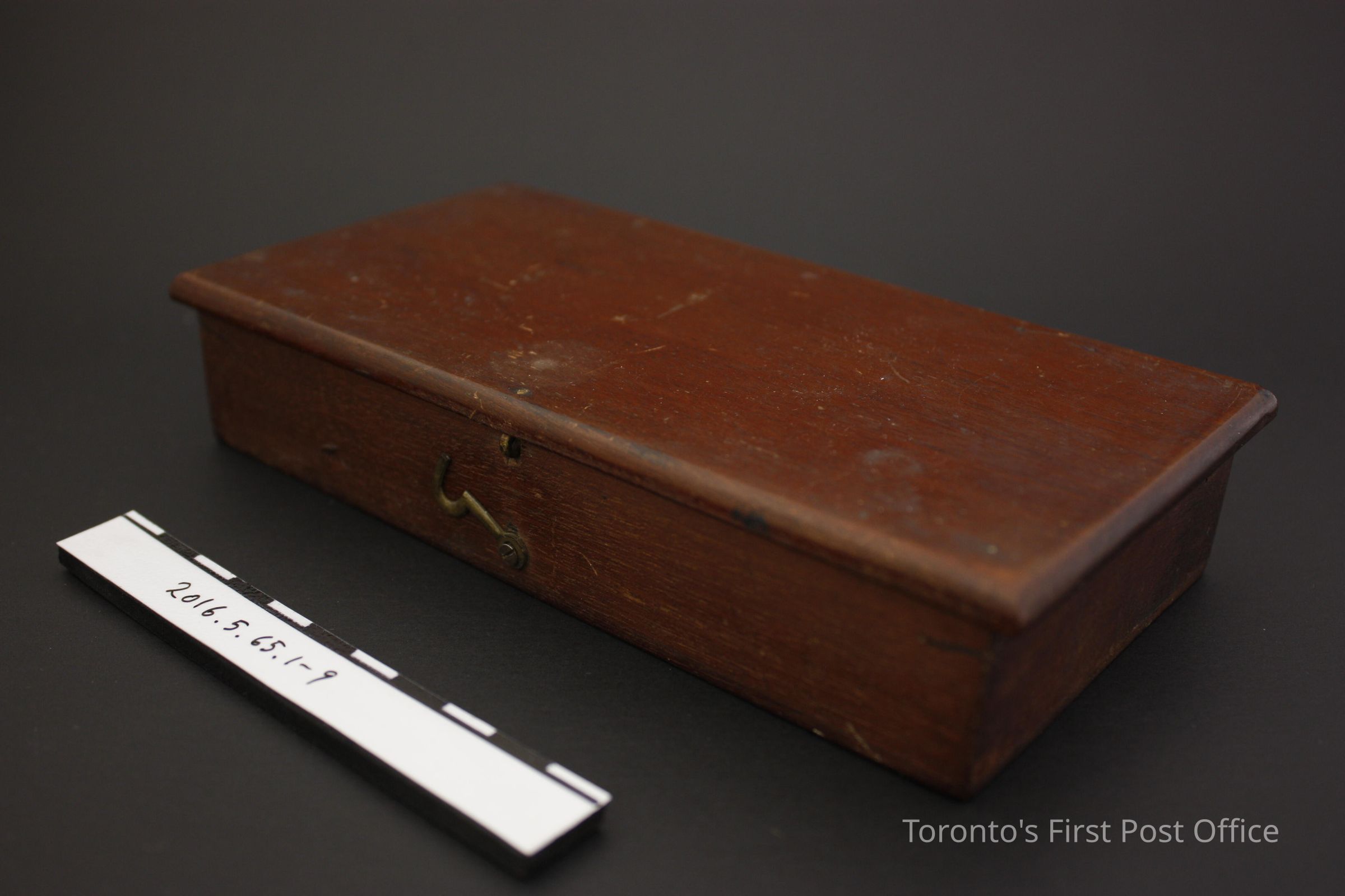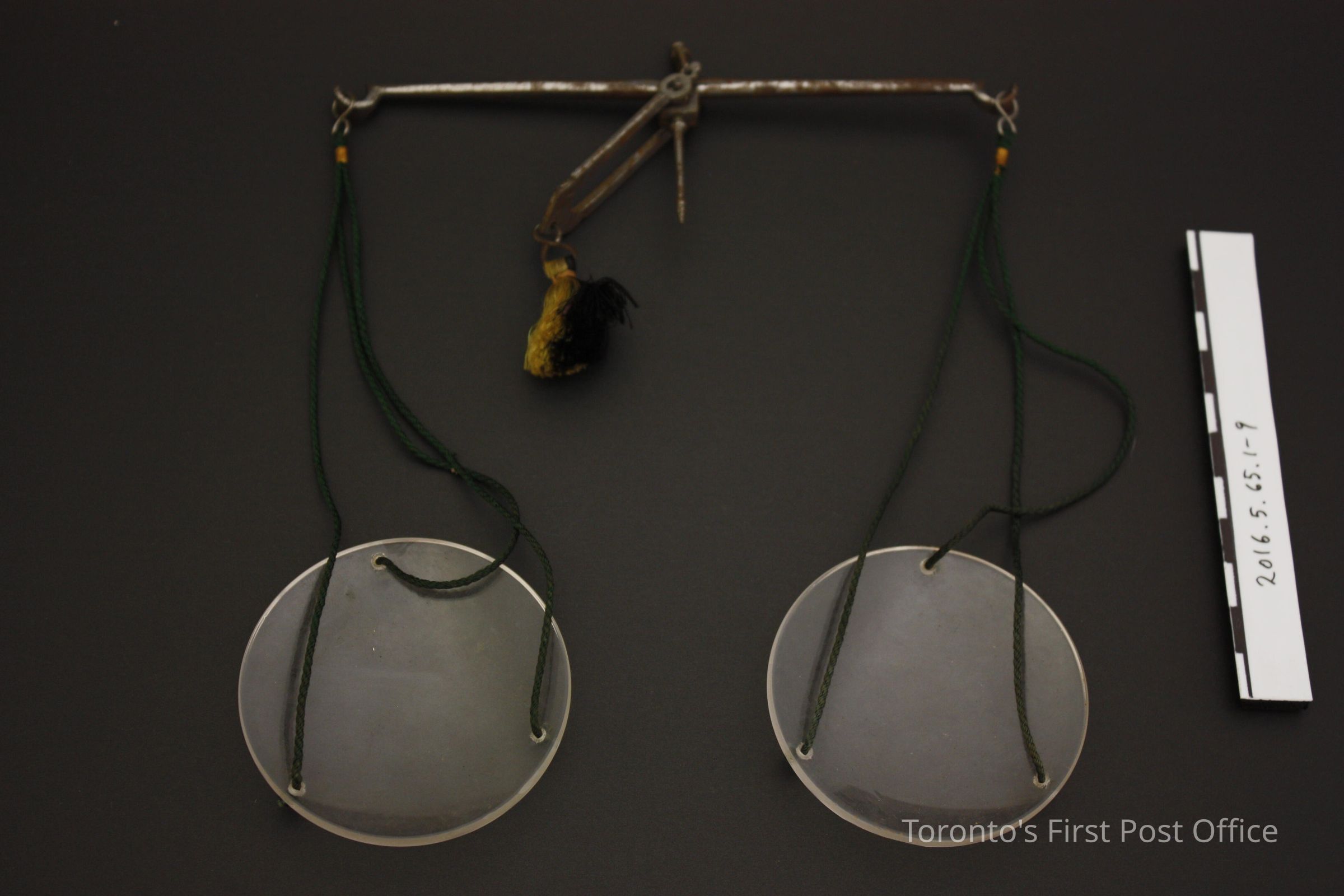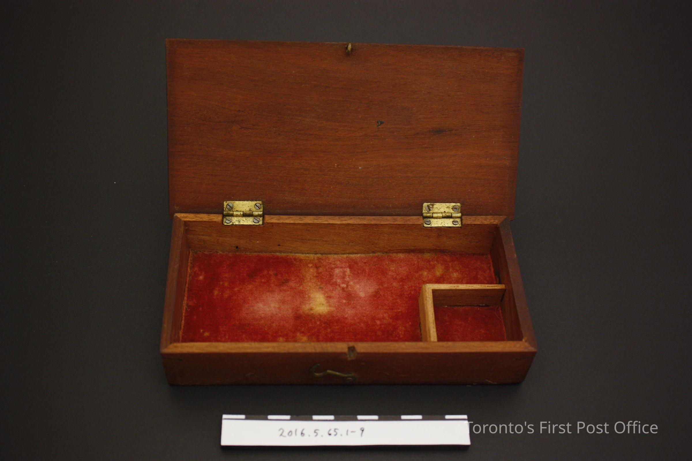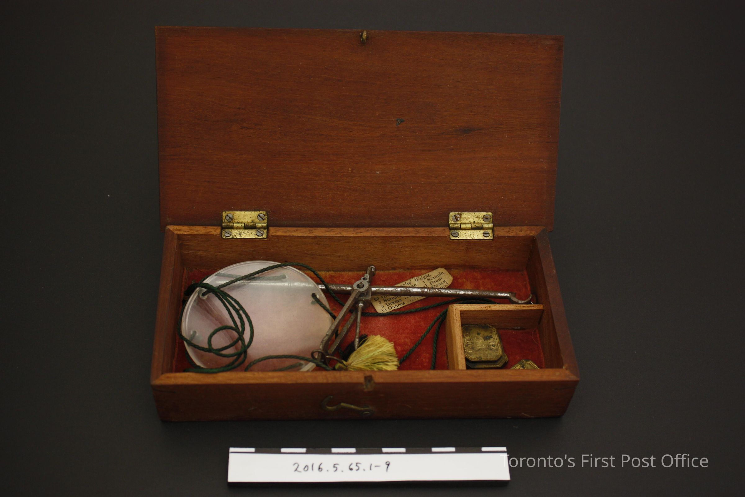 Travelling apothecary scale in dark wood box. Red velvet lined bottom of interior, short wooden pieces, butt joined at an angle to create a weight compartment, in the proper front left corner of the box. Lid and base are attached by plate hinges. Hook and loop closure on front of box. Set consists of steel balance, glass scale pans attached to balance with green silk (?) cord, and six metal weights; one (1) two drams weight, one (1) one dram weight, one (1) two scruples weight, one (1) half dram weight, one (1) scruple weight, and one (1) half scruple weight. The small paper label in the compartment is printed with black ink on with paper, with grain to scruples, scruples to drams, drams to ounces, and ounces to pounds conversions.Dimensions