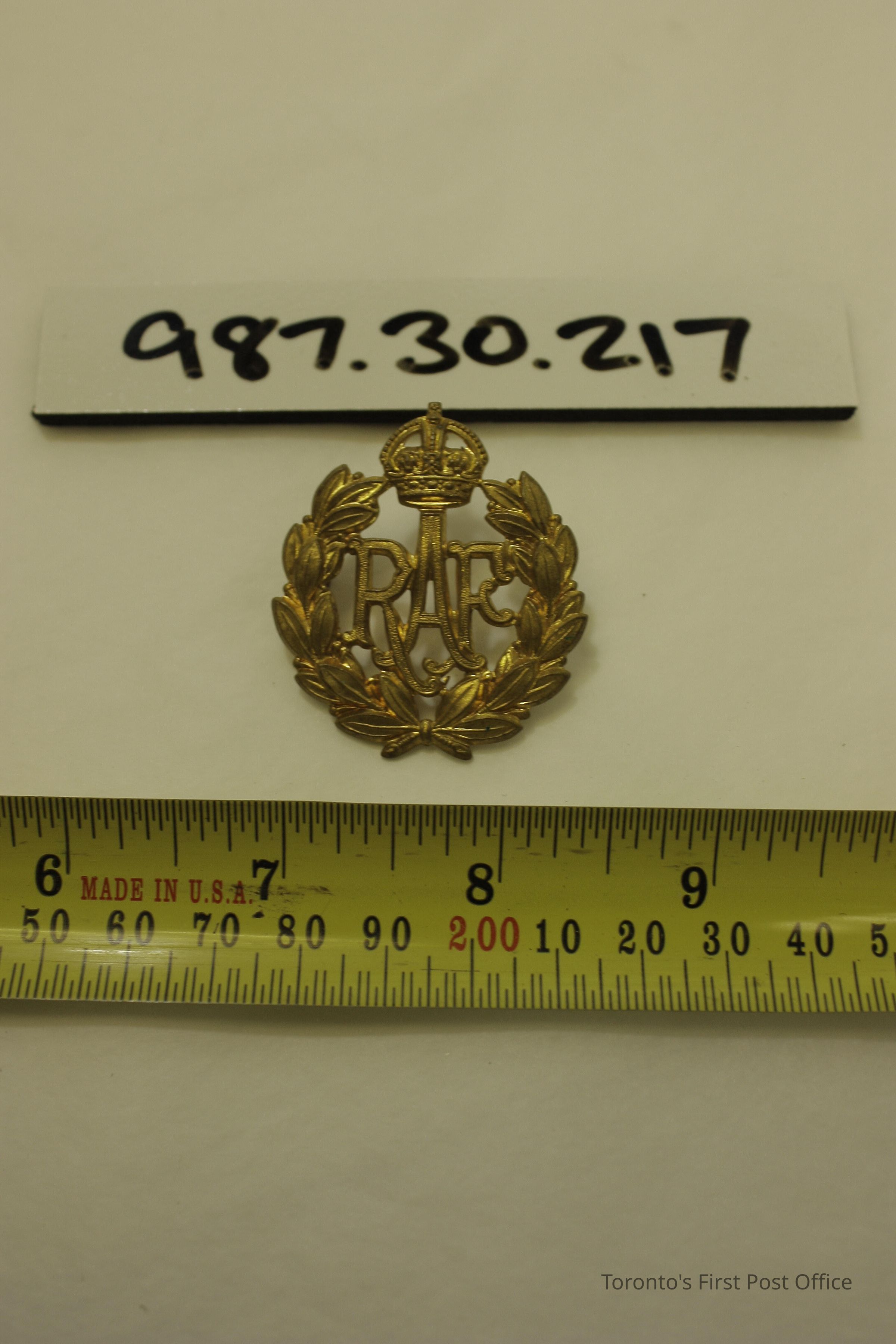Brass cap badge; "RAF" within wreath, topped by crown (Royal Air Force); circa 1918.
