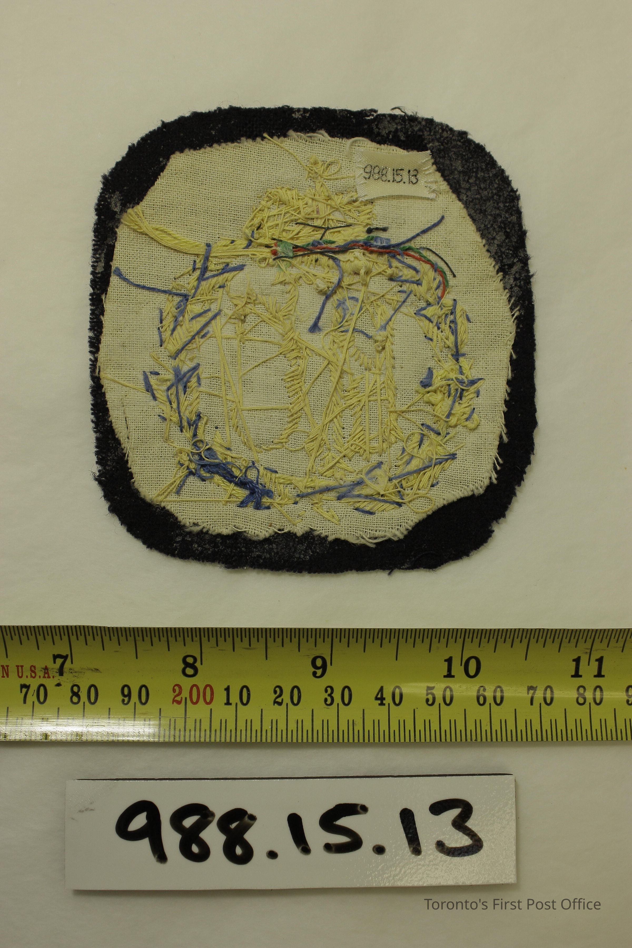 Badge; navy blue woolen square patch with rounded corners; heavy embroidery of "RFC", a crown and surrounding laurels.