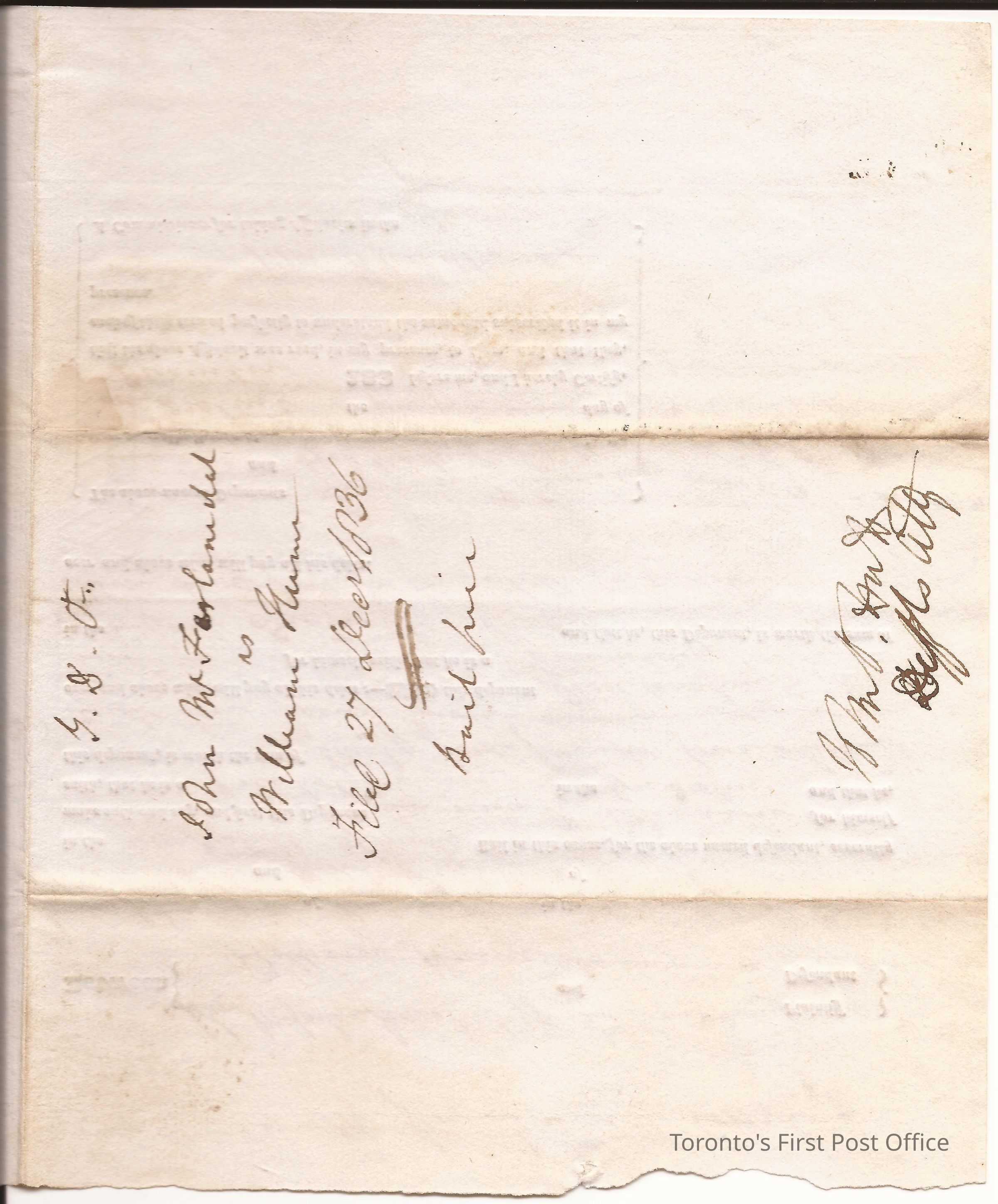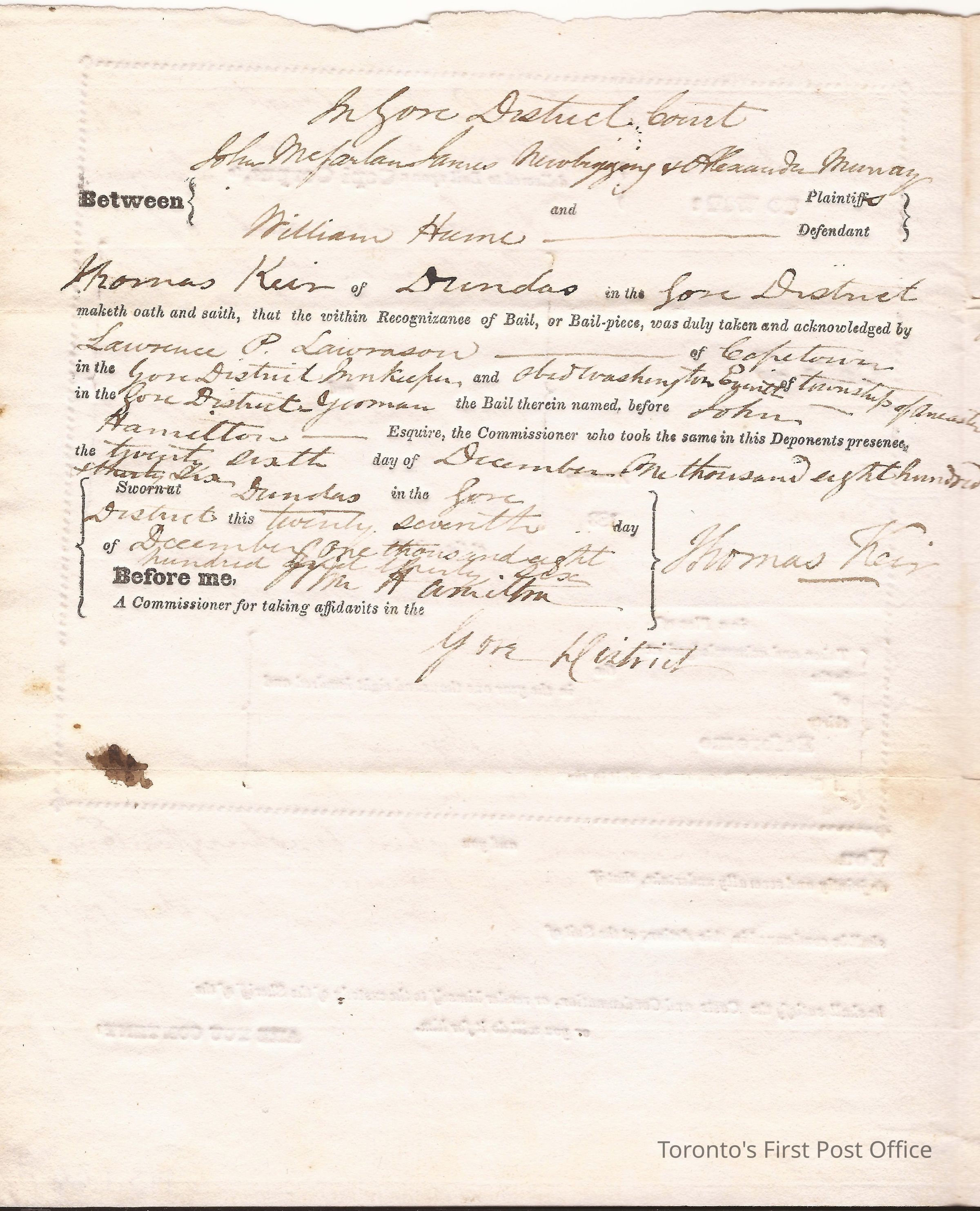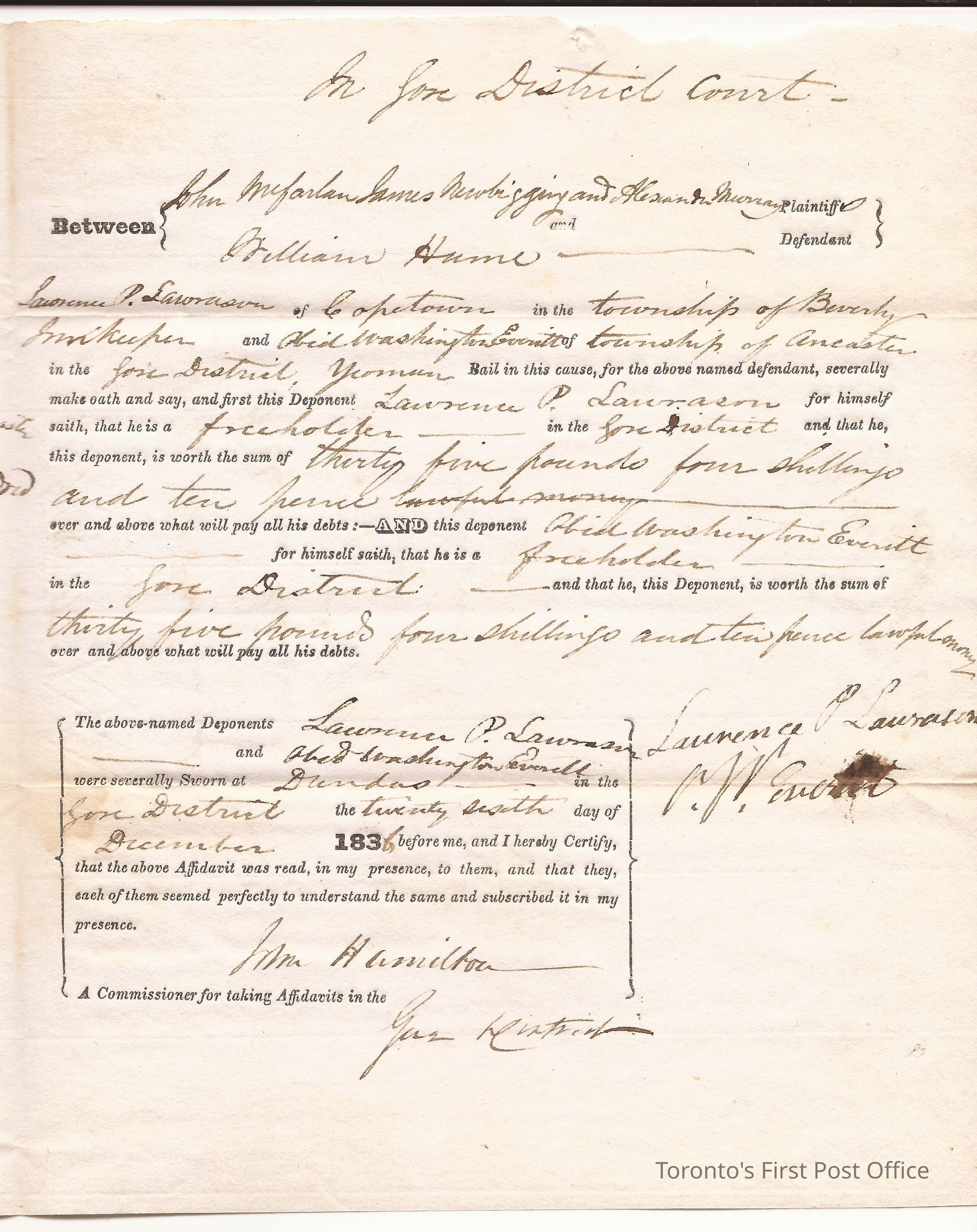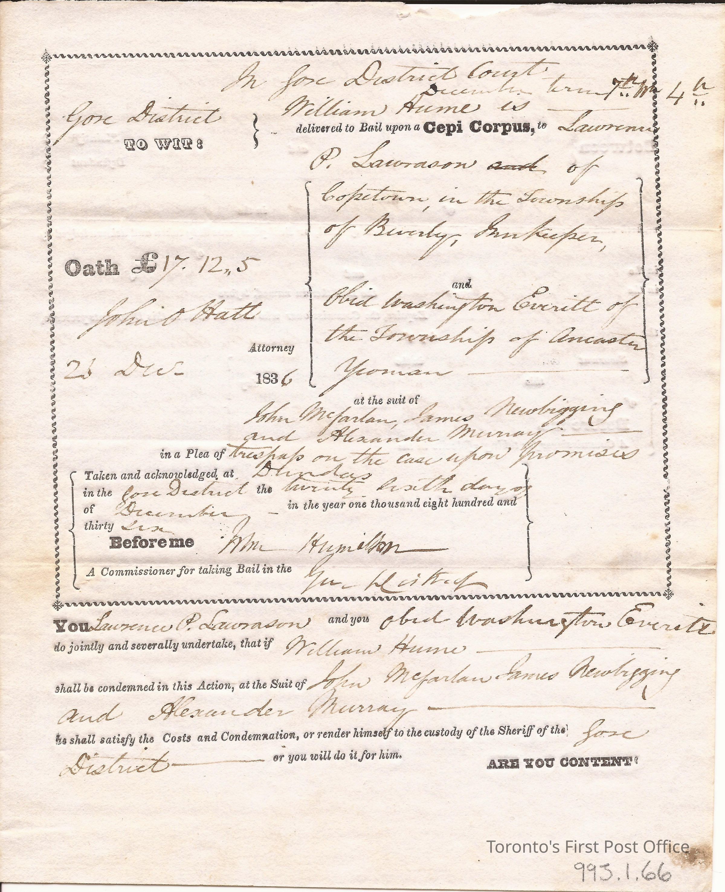 Evidence of bail; Gore District; in the matter of Lawrence P. Lawrason of Copetown, Innkeeper vs. Obid Washington Everitt of the Twp. of Ancaster, Yeoman; 27 Dec. 1836; 1 p.; manuscript and print; unbleached laid paper; watermark: "WE 1831"Dimensions