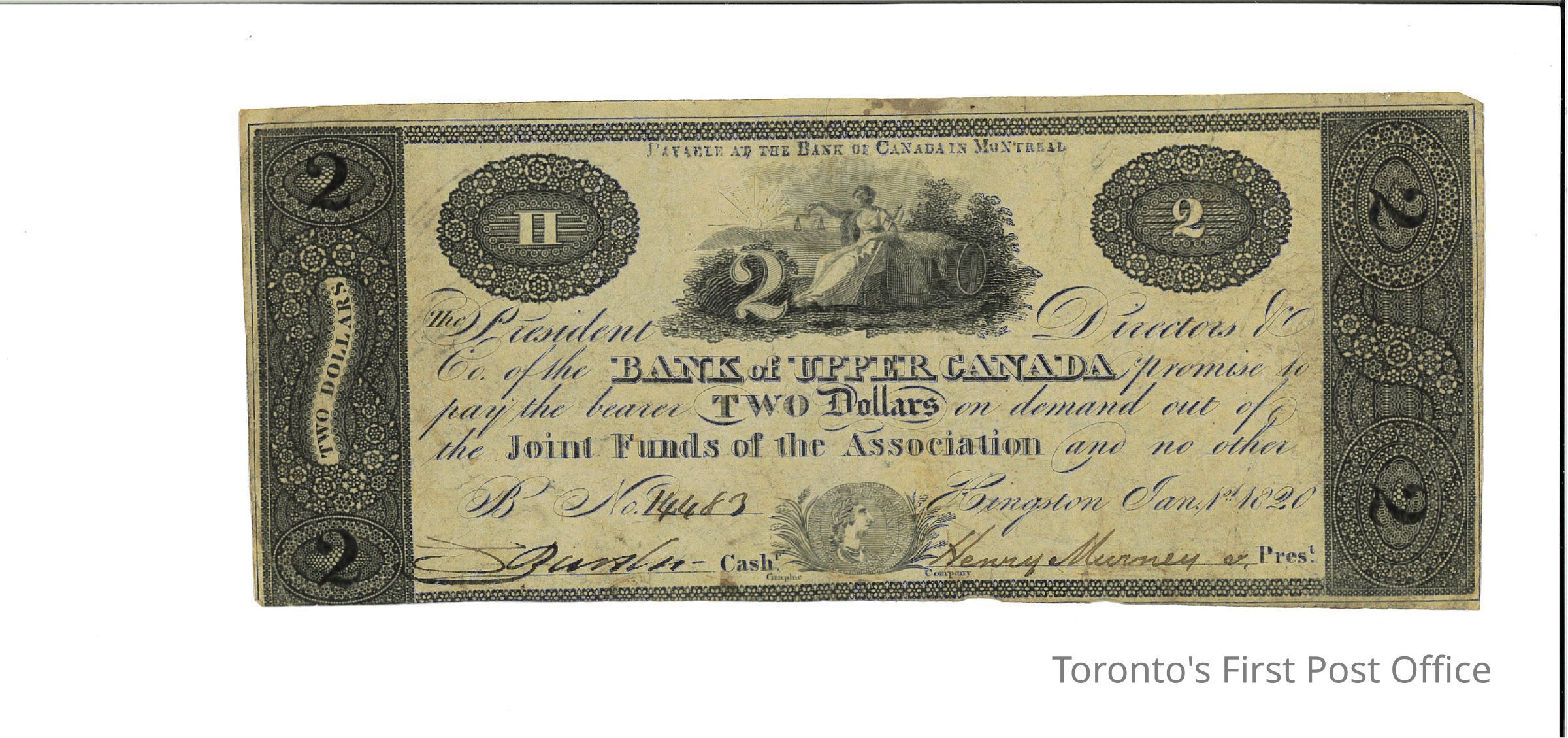 One banknote from the Bank of Upper Canada in Kingston; a two dollar note; #14483; uniface; vignette at centre top includes a numeral 2, seated Justice figure and barrels; two coins at centre bottom; black with no tint; "PAYABLE AT THE BANK OF CANADA IN MONTREAL" above vignette; initials in manuscript on reverse; engraved 1820.Update Date