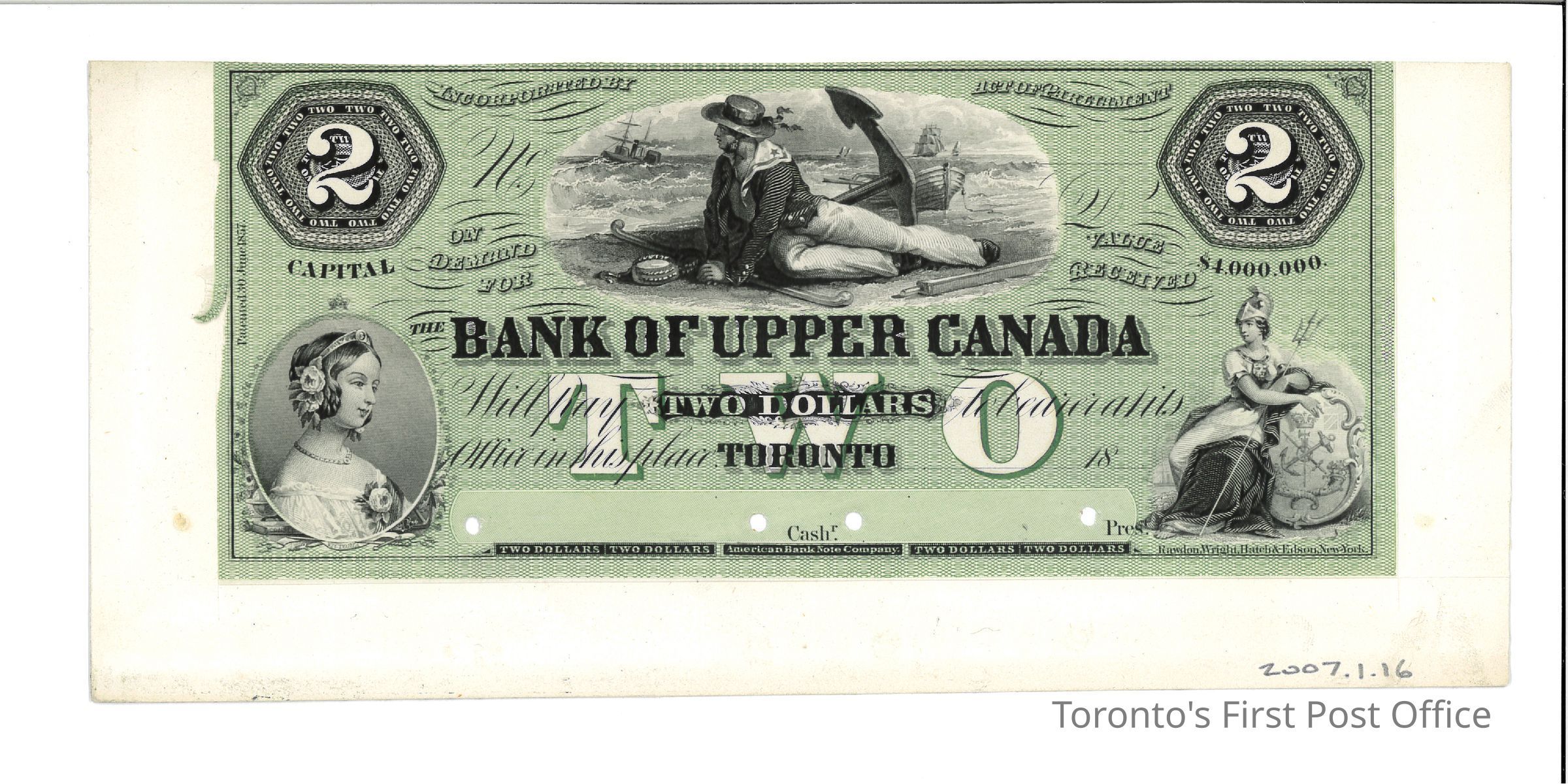 One face proof of Bank of Upper Canada (Toronto) two dollar banknote; in colour of issue (green tint on white with black print); mounted on white card; at centre bottom: "American Bank Note Company"; serial # and date not filled in; unsigned; note in pencil on reverse; vignettes: bottom left: portrait of Queen Victoria as a young girl, centre: sailor reclining on shore with anchor, bottom right: seated Britannia with crest of Upper Canada; punch (x4) cancel at bottom; issue of 1859 and 1861.Dimensions