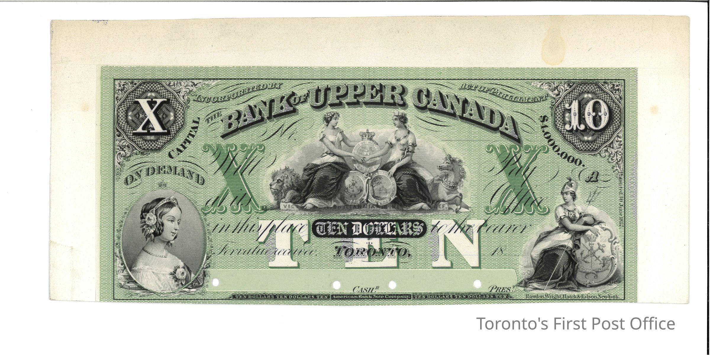 One face proof of Bank of Upper Canada (Toronto) ten dollar banknote; in colour of issue (green tint on white with black print); mounted on white card; at centre bottom: "American Bank Note Company"; serial # and date not filled in; unsigned; note in pencil on reverse; vignettes: bottom left: portrait of Queen Victoria as a young girl, centre: two women and crest, bottom right: seated Britannia with crest of Upper Canada; punch (x4) cancel at bottom.Dimensions