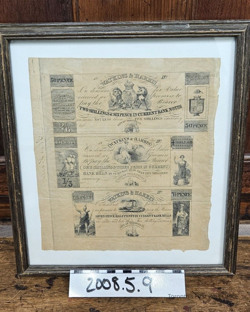 Three values of banknotes from "Watkins & Harris"; top: two shillings and sixpence in current banknotes; middle: one shilling and three pence in current bank bills; bottom: seven pence half penny in current bank bills; all from City of Toronto, U.C.; all unsigned; framed; bottom and right edges ragged; pencil mark in right upper corner: "150-" and "200".Update Date