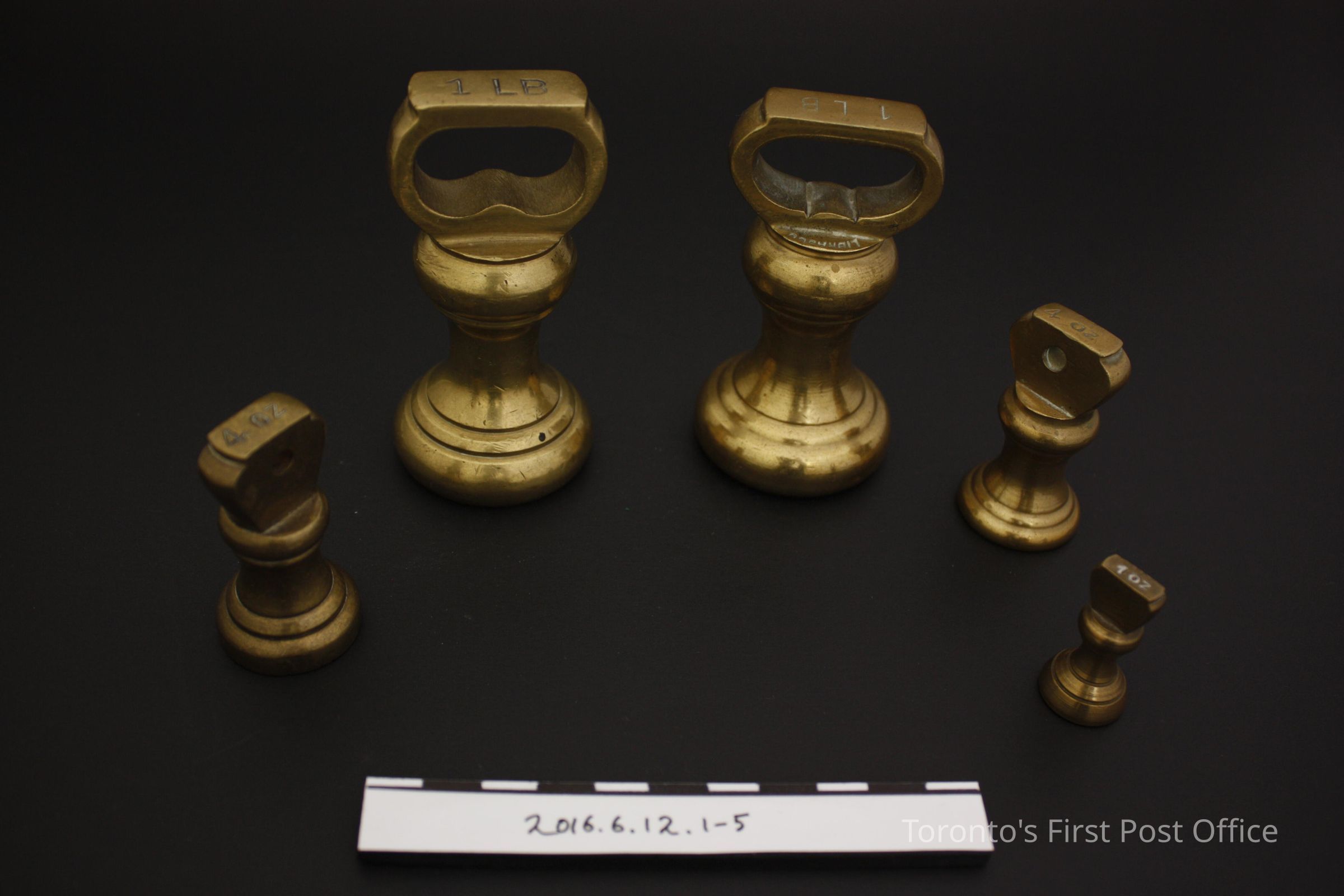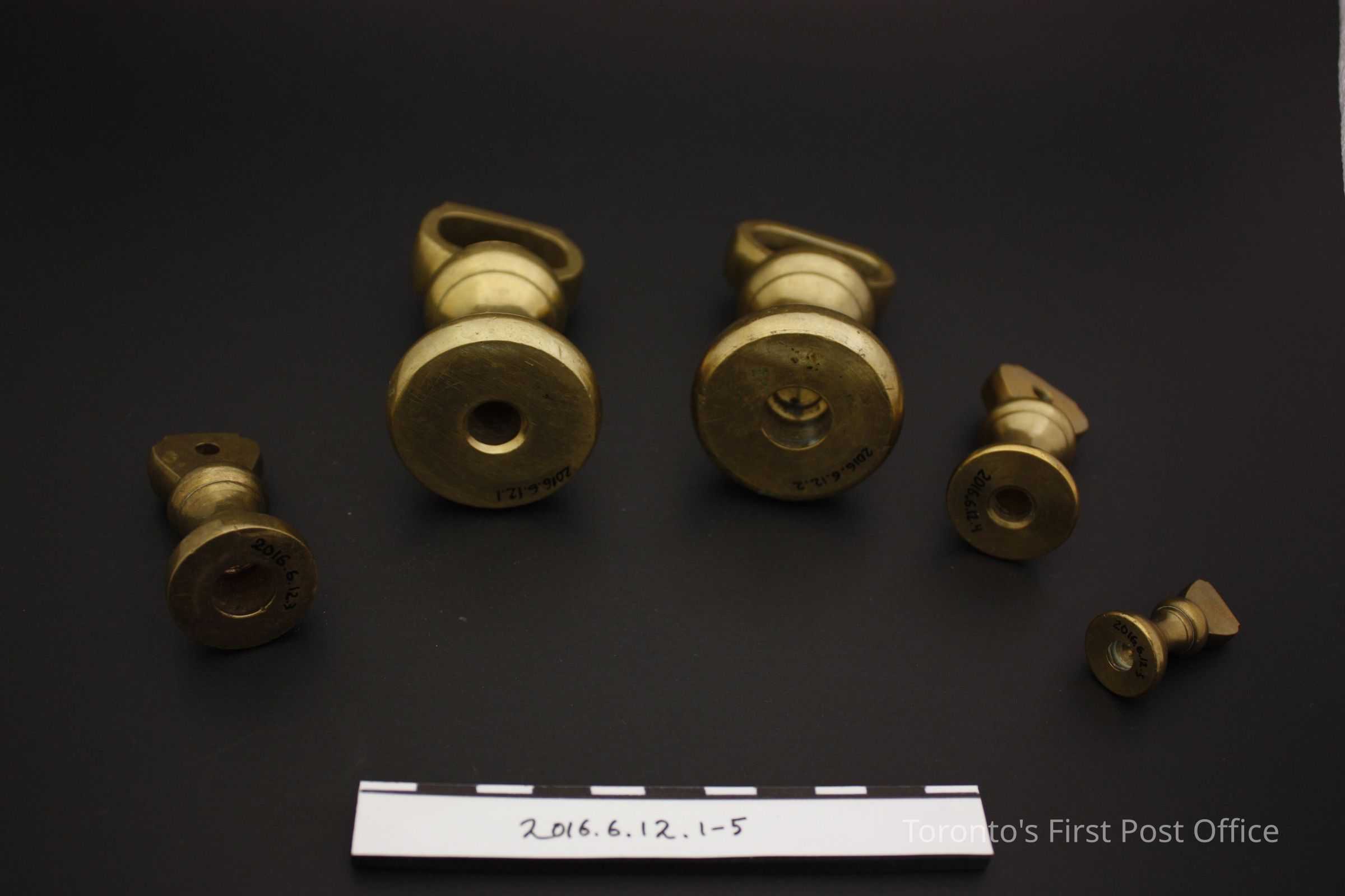 Set of five (5) brass bell weights in denominations of 1lb, 1lb, 4oz, 4oz, and 1 oz. The 1lb weights have handle loops on top, 4oz weights have loop-hole on top. Hole in bottom of all weights.Dimensions