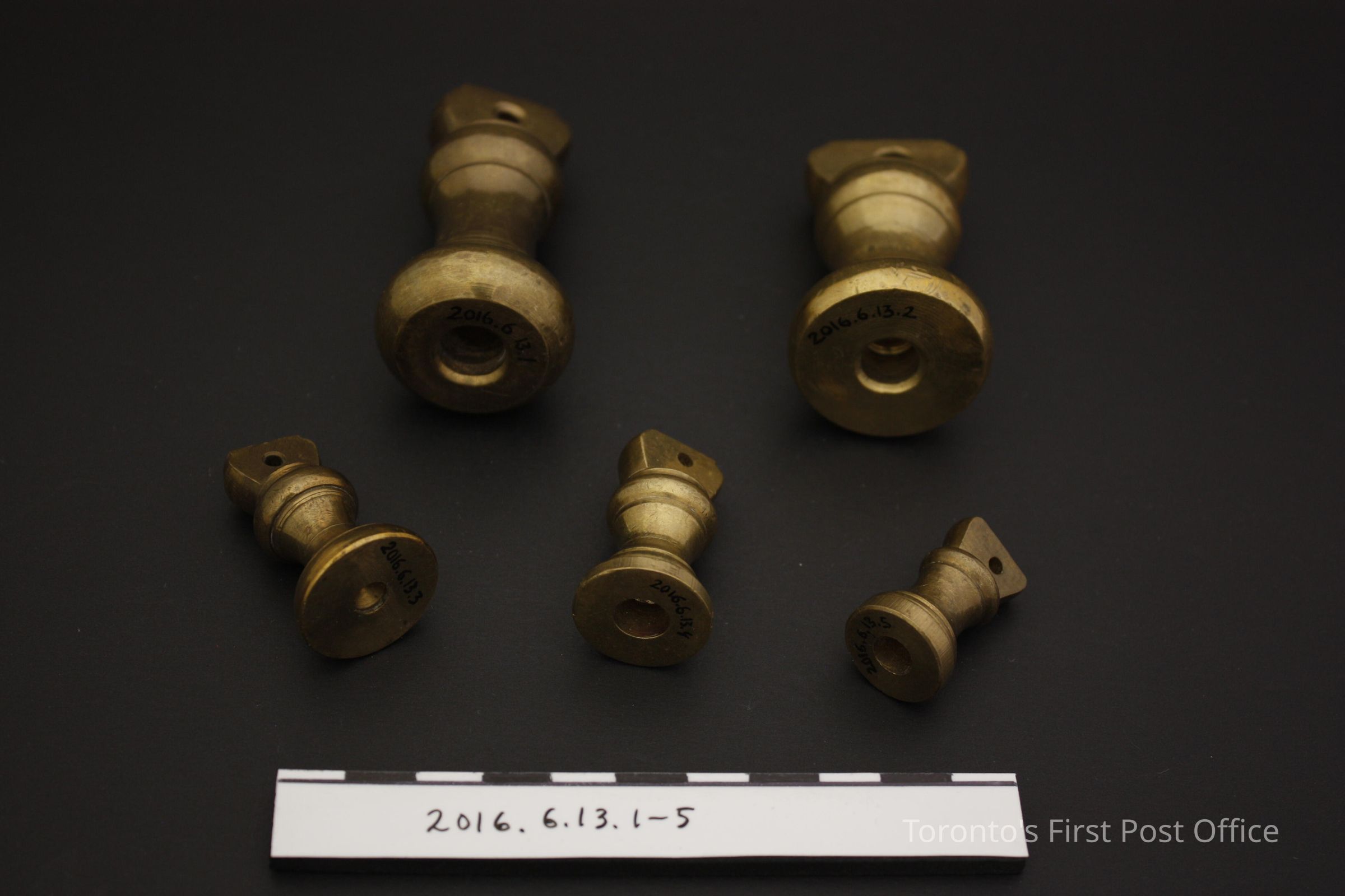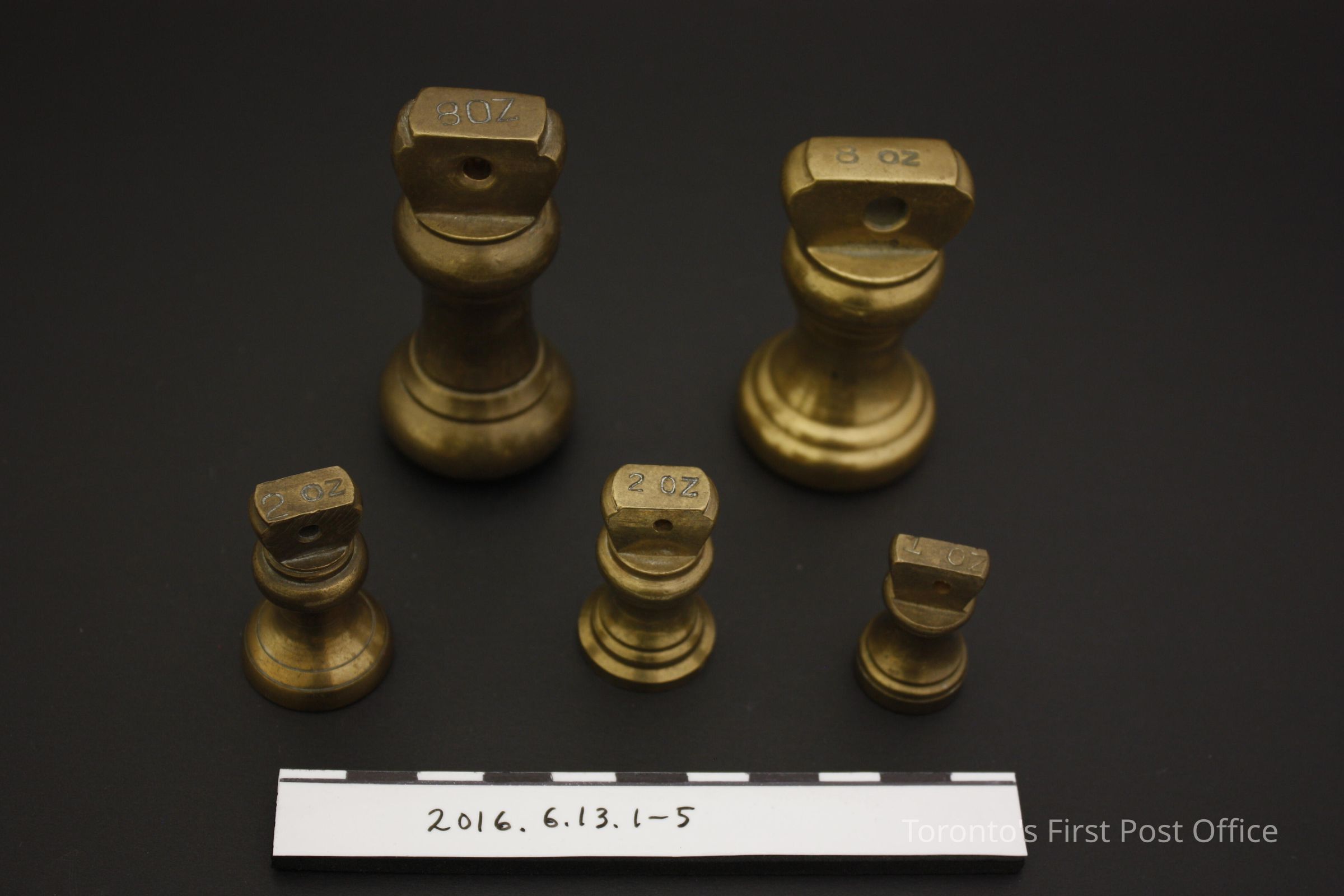 Set of five (5) brass bell weights. Denominations of 8oz, 8oz, 2oz, 2oz, and 1 oz weights. Loop-hole in top of all heights, hole in botton of each weight.Dimensions