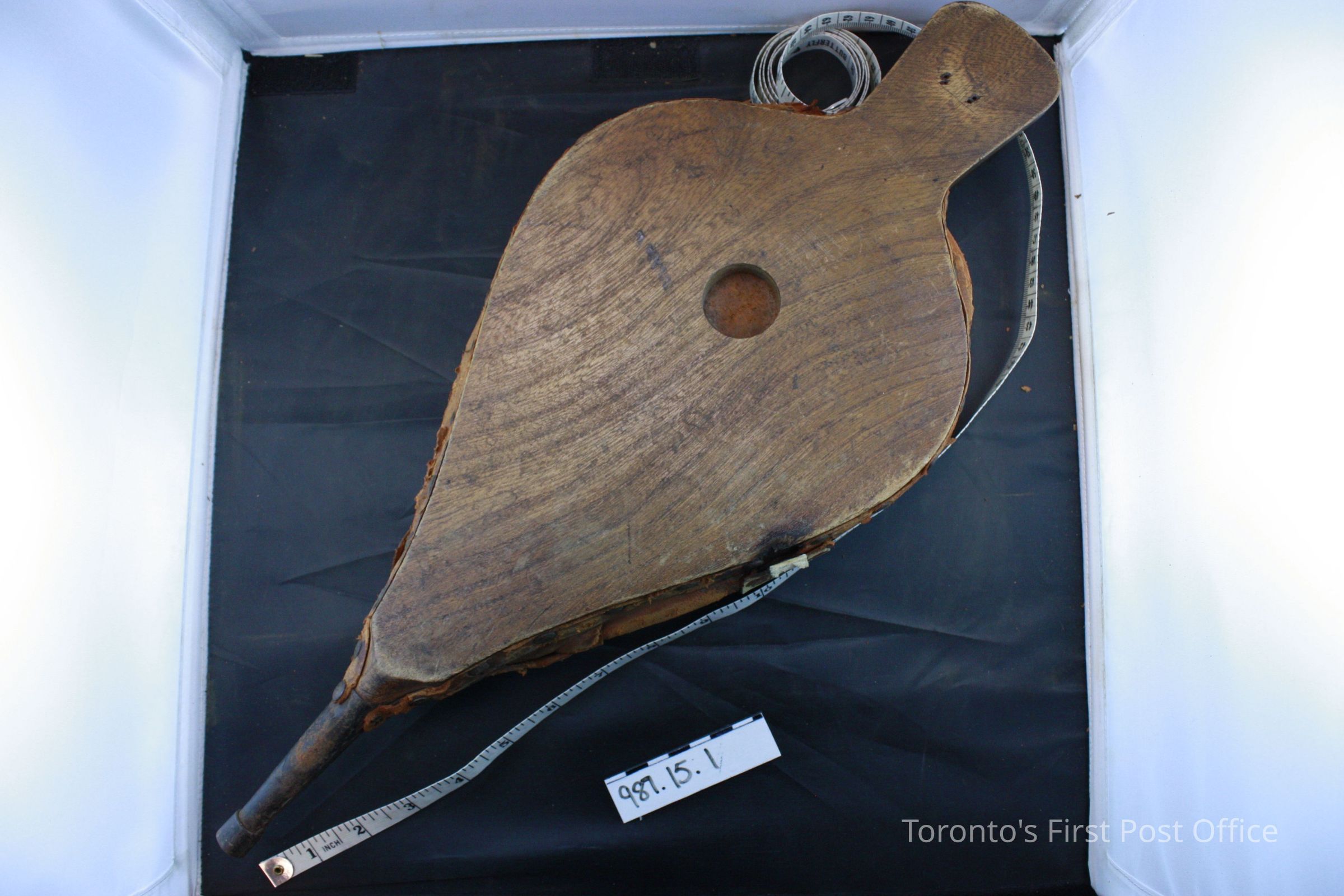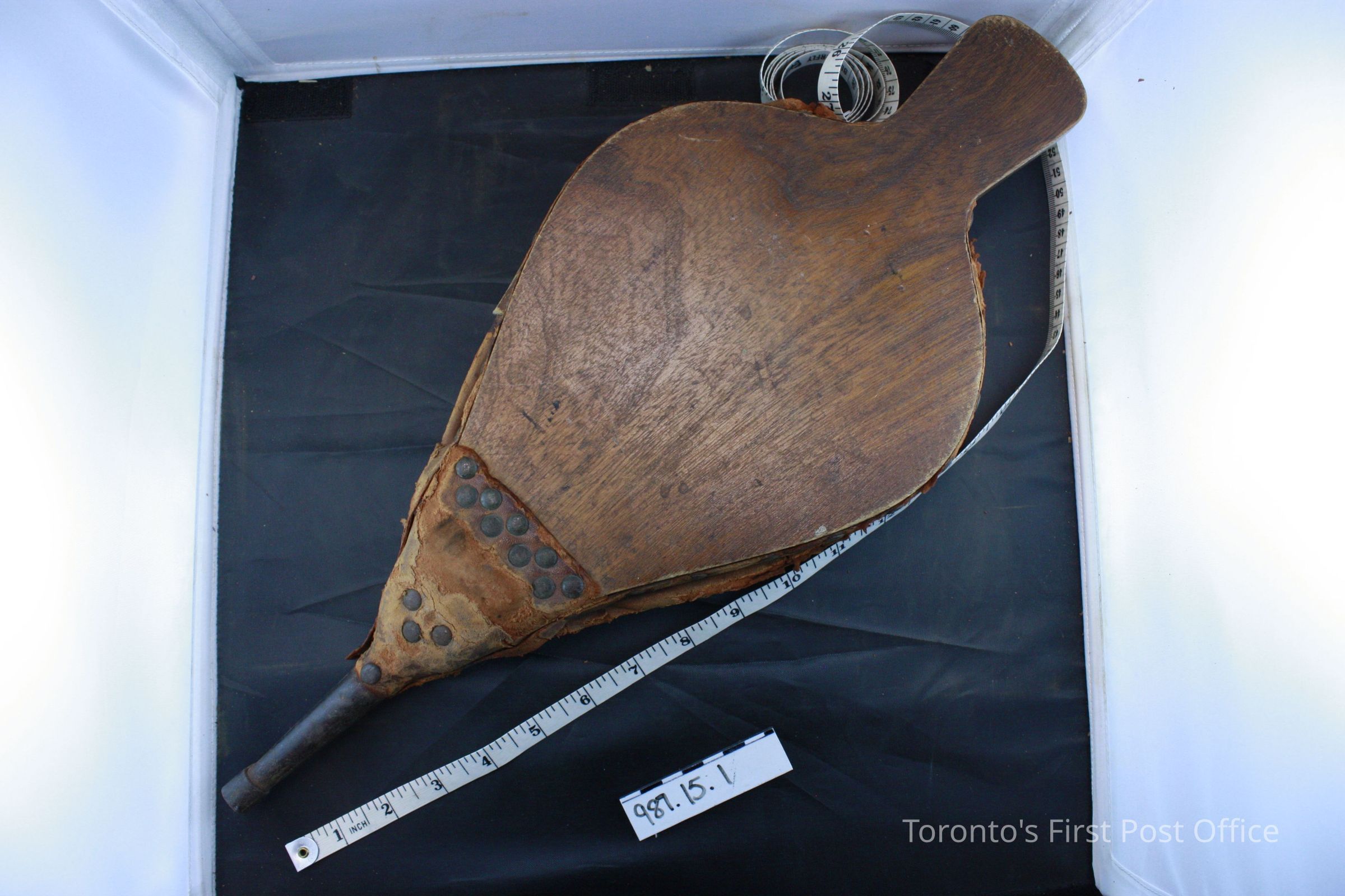 Fire bellows; elmwood; two stained tear-drop shaped sides with squared handles; hollow metal tip/ sides joined with folded leather which is fastened to wood with metal tacks.Dimensions