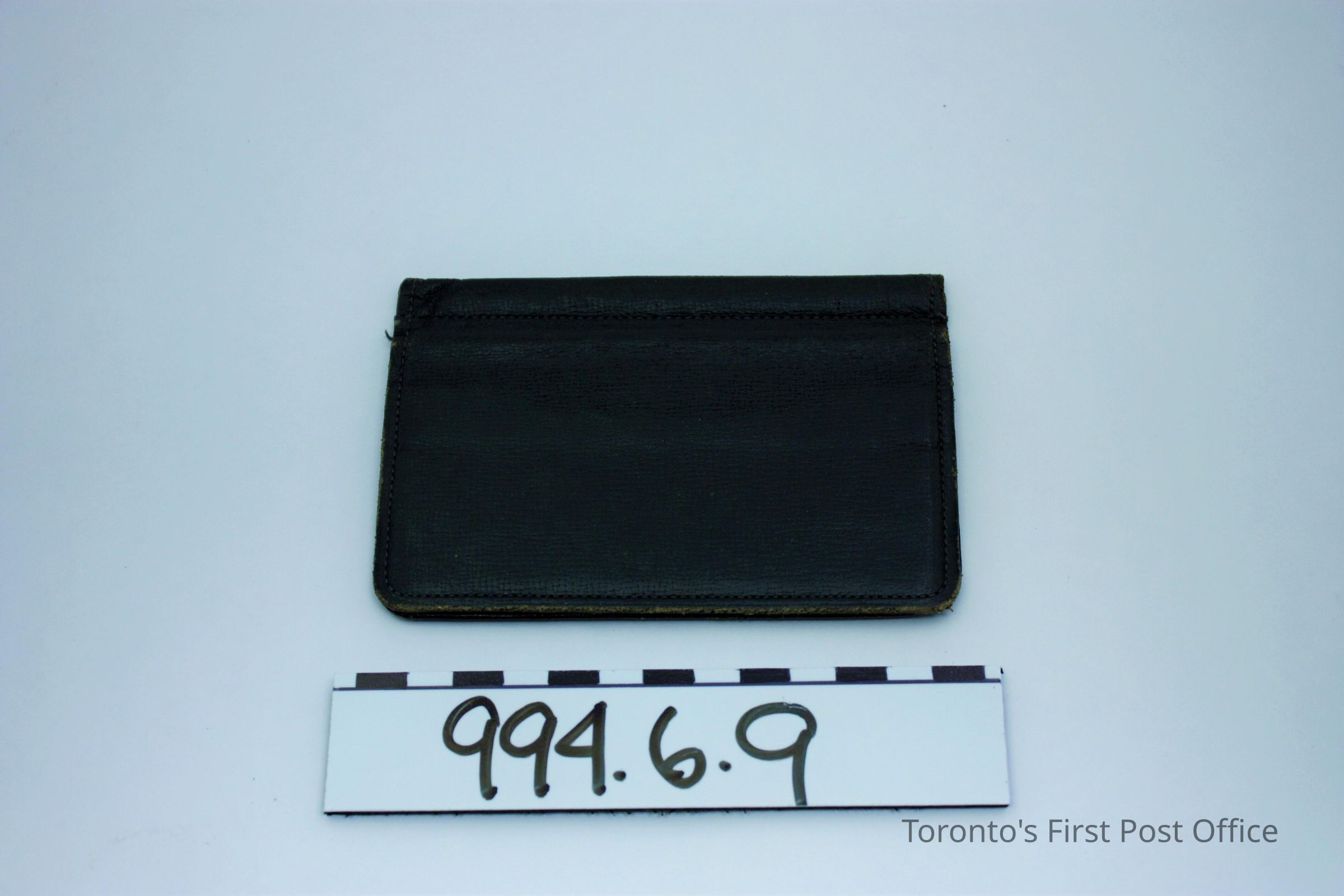 Bill fold; black leather; interior is medium brown leather; four compartments.