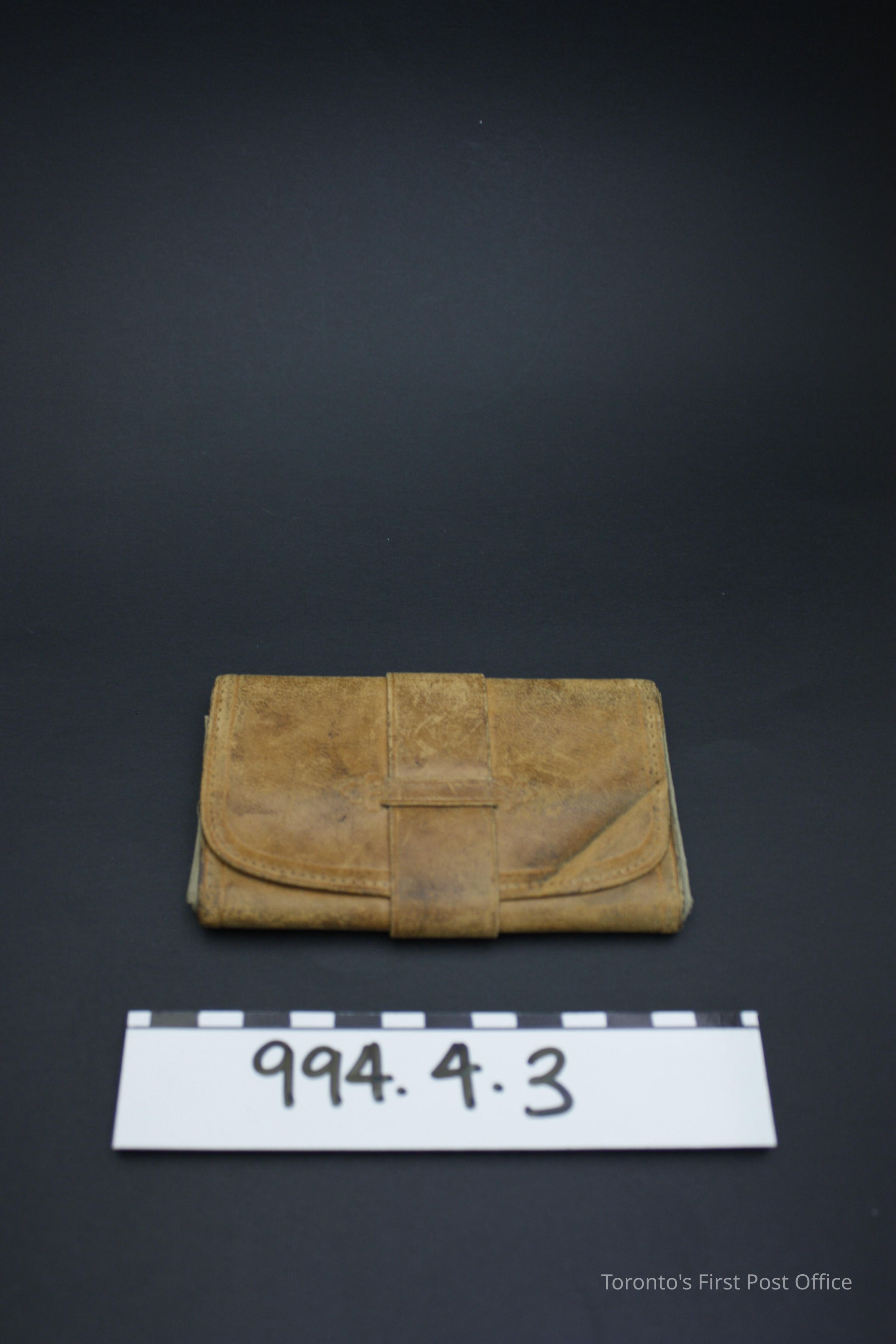 Bill fold; yellow-brown pigskin; machine-sewn; compartment with cotton lining; lining overlaps to hold bills; tag and loop closure; accordion-style change compartment (four compartments divided with stiffeners); small floral design on front flap and either side of loop.Dimensions