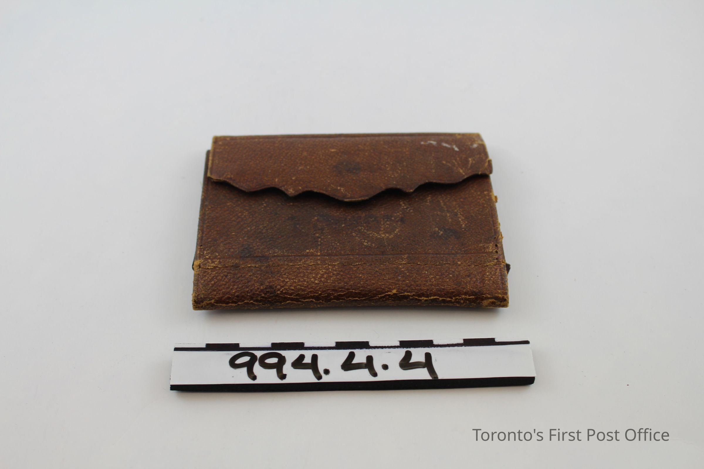 Bill fold; dark brown leather; scalloped design on closure flap; glued construction; three compartments with stiffener between each; closure tab missing.Dimensions
