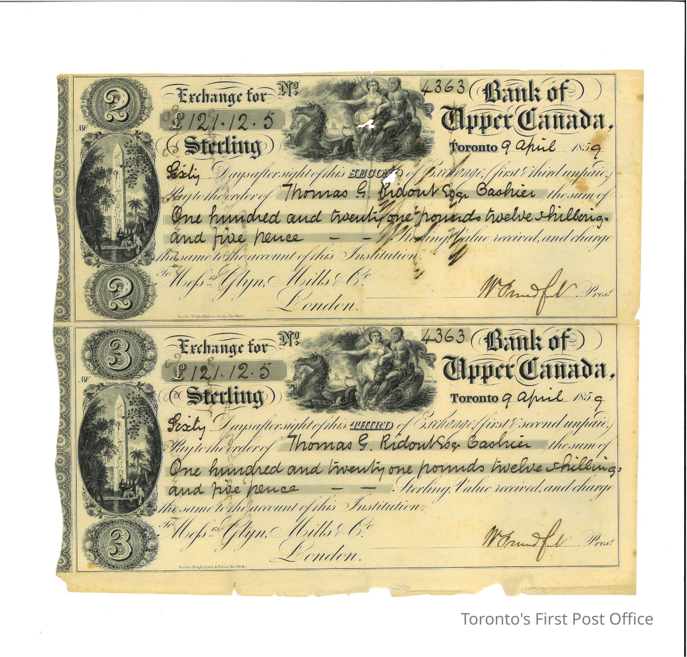 Second and third (attached) bill of exchange for sterling; from Bank of Upper Canada; to Thomas G. Ridout Esq. Cashier; bill #4363 for £121/12/5; signed by Wm. Proudfoot, Pres.; on each: two vignettes and two illuminated numbers (2s or 3s); on printed form with brown ink manuscript; notes on reverse in brown ink manuscript; dated Apr 9 1859.Dimensions