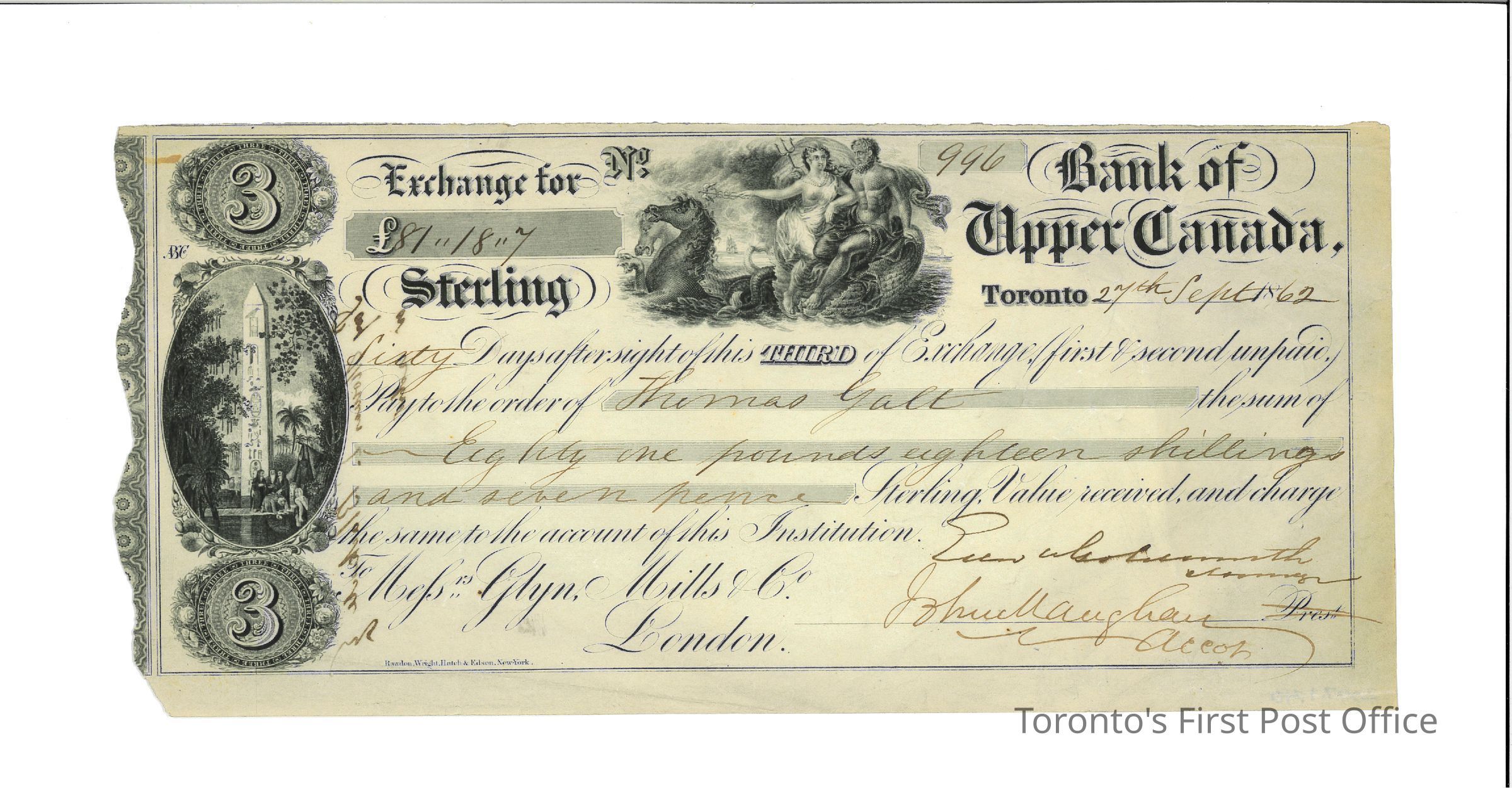 One bill of exchange for sterling from the Bank of Upper Canada; to Thomas Galt; bill #996 for £81/18/7; signed by Edward Goldsmith, Manager and John Maughan, Accountant; two vignettes and two illuminated "3"s; on printed form with brown ink manuscript; note on reverse in brown ink manuscript; dated Sept 27, 1862.Dimensions