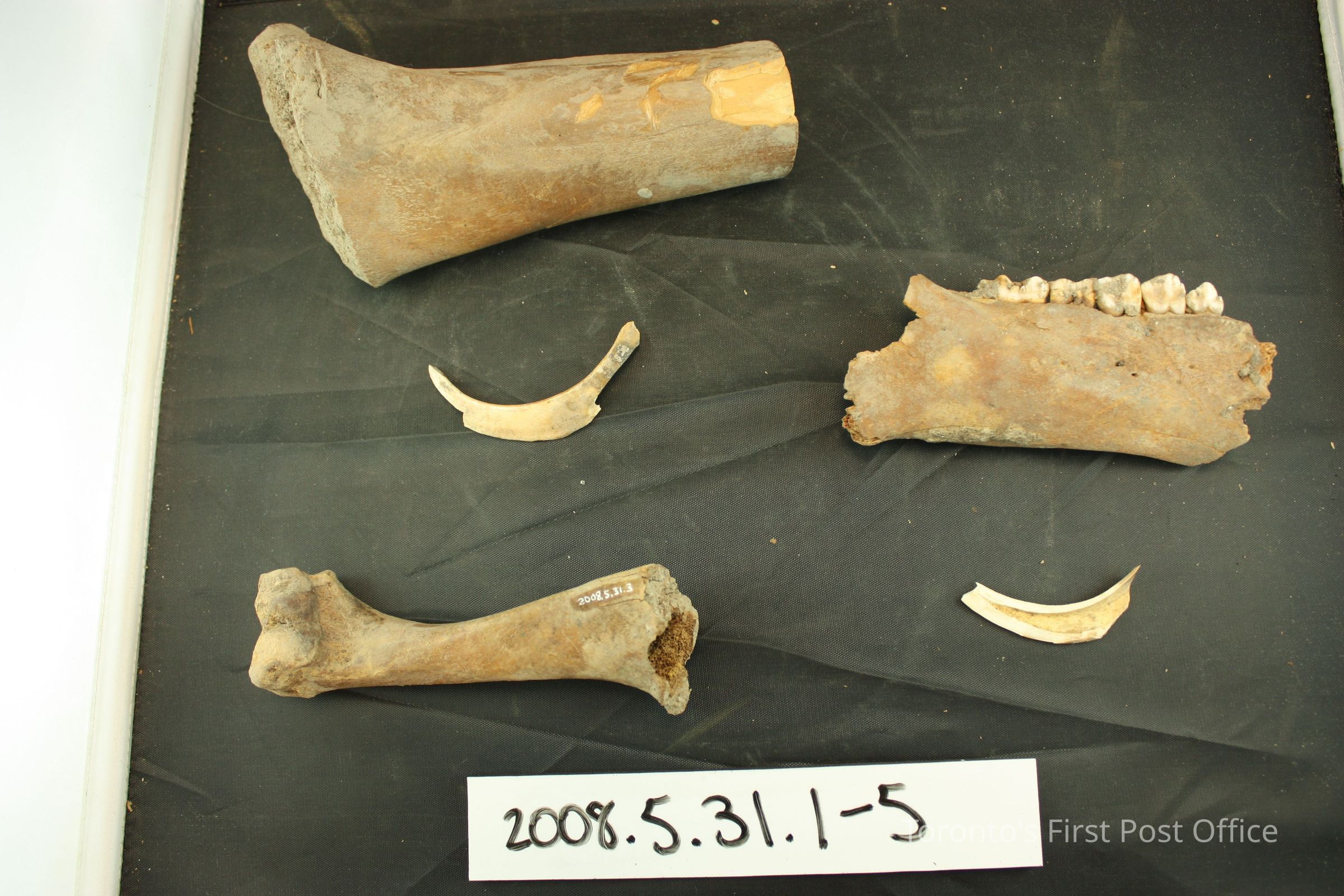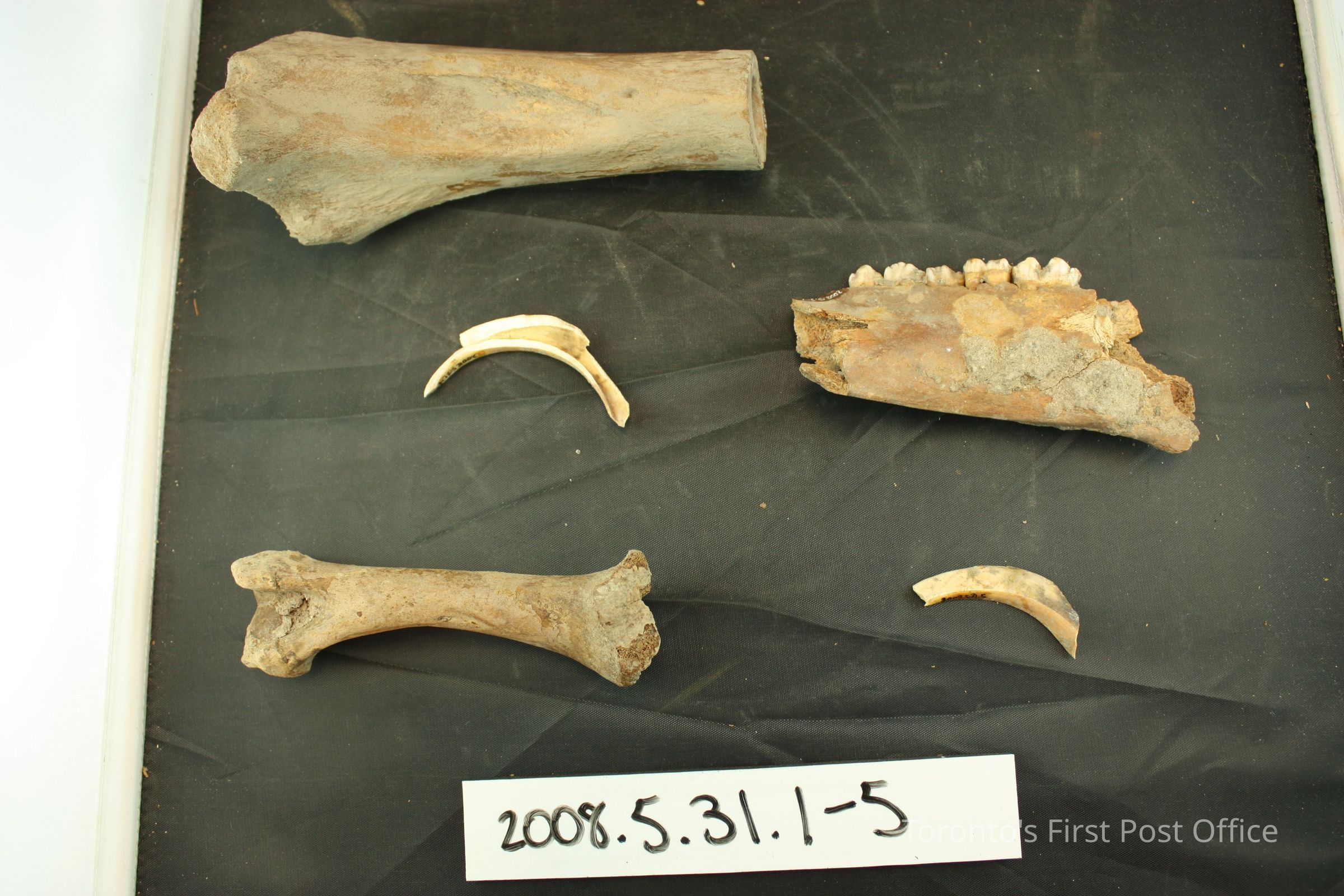 Five pieces of bone, probably from cattle, as follows: .1: jaw bone with five teeth, hole down centre; .2: large bone, seems to have been cut at one end, hole down centre, very porous interior; .3: bone with ball joint at one end, other end appears to be broken, very porous interior; .4: small bone, crescent shaped; .5: as above, one end broken; .4 and .5 appear to have been one bone split down centre.Dimensions