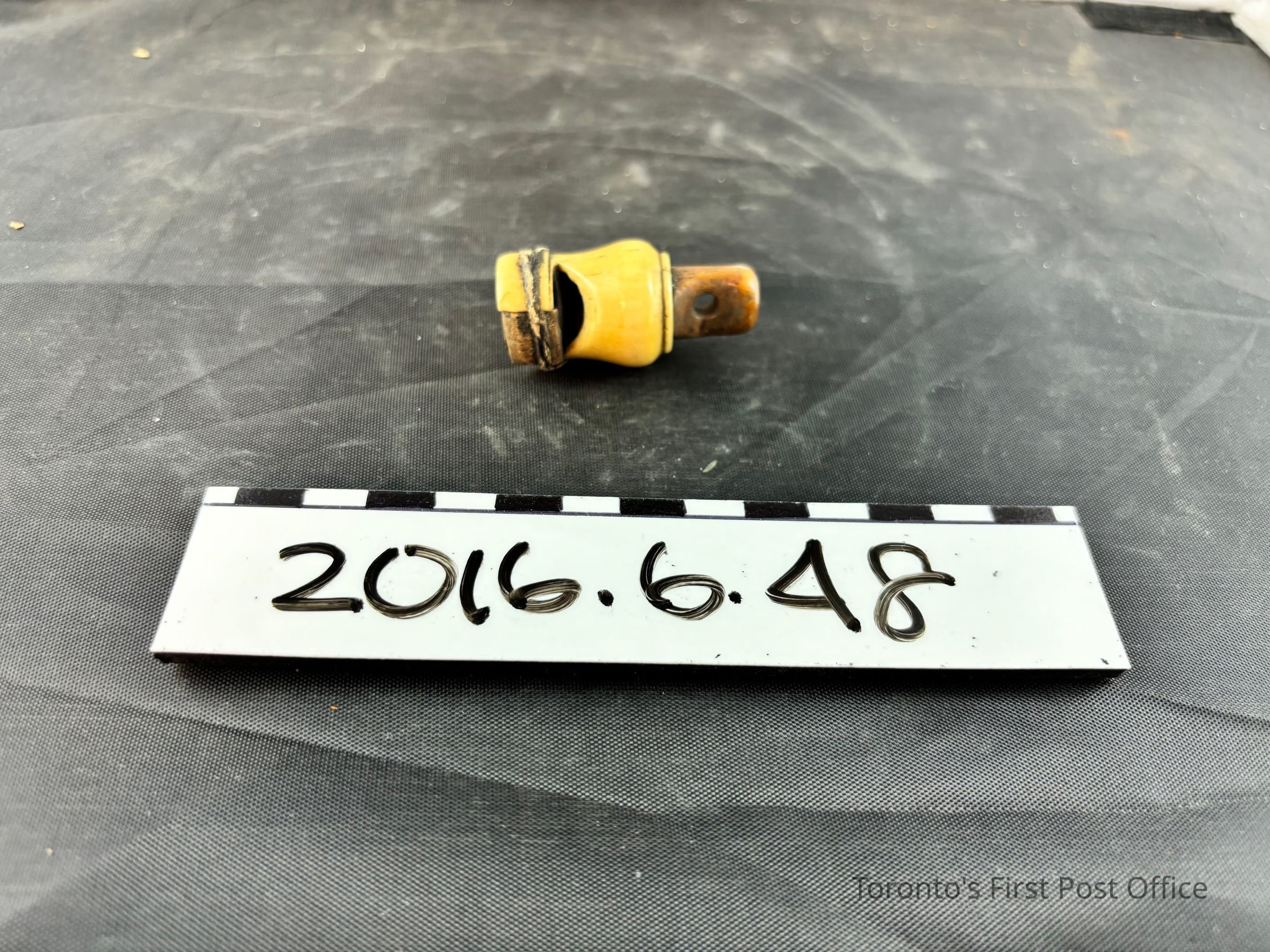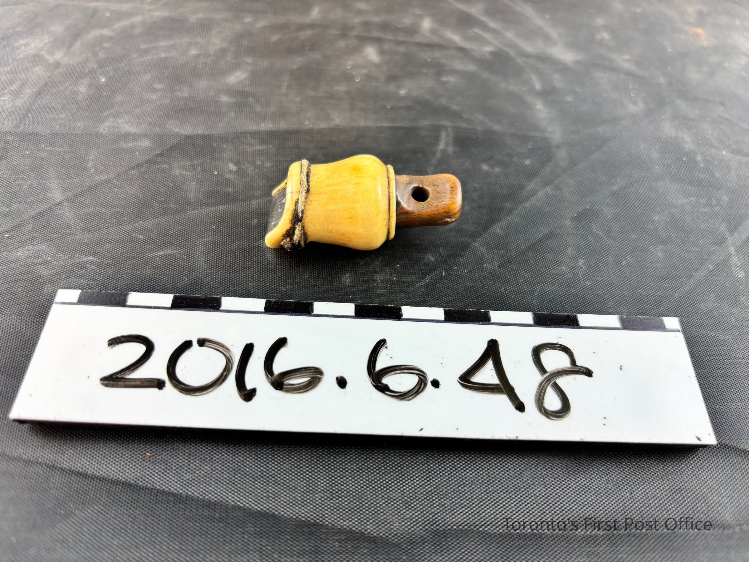 Whistle made out of either bone or ivory with wooden attachments and fipple. Has possibly a wooden pea ball inside.Dimensions