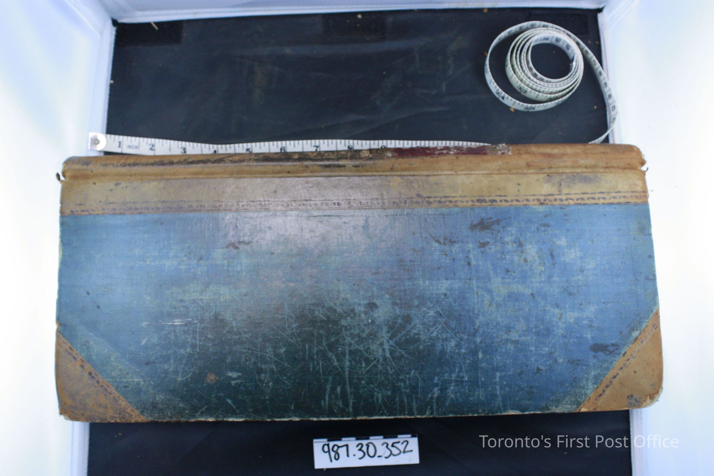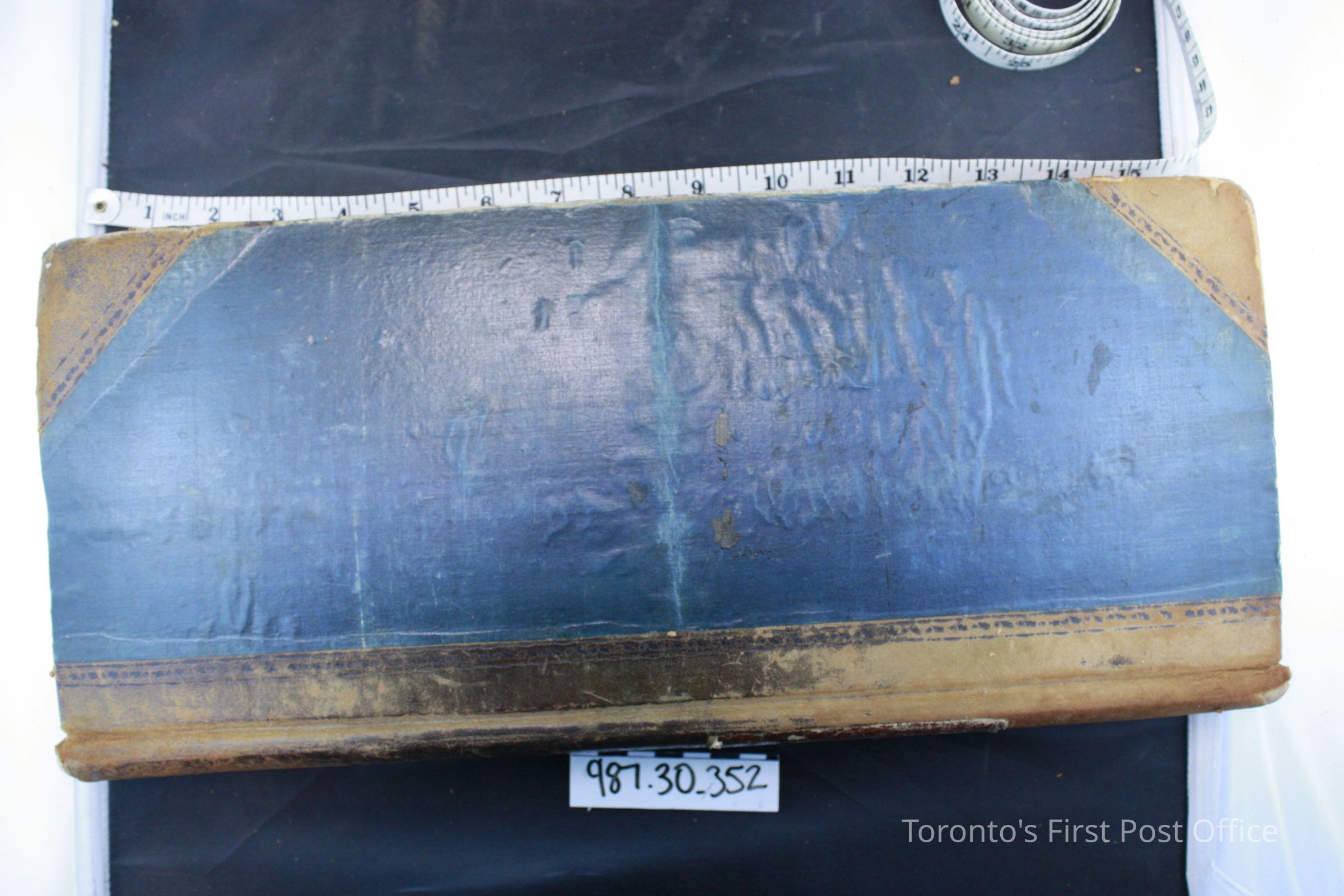 Ledger; leather spine; red and gold title: "ledger 183"; dark blue cover; inside cover is marbled; cotton thread binding; circa 1833-1892.