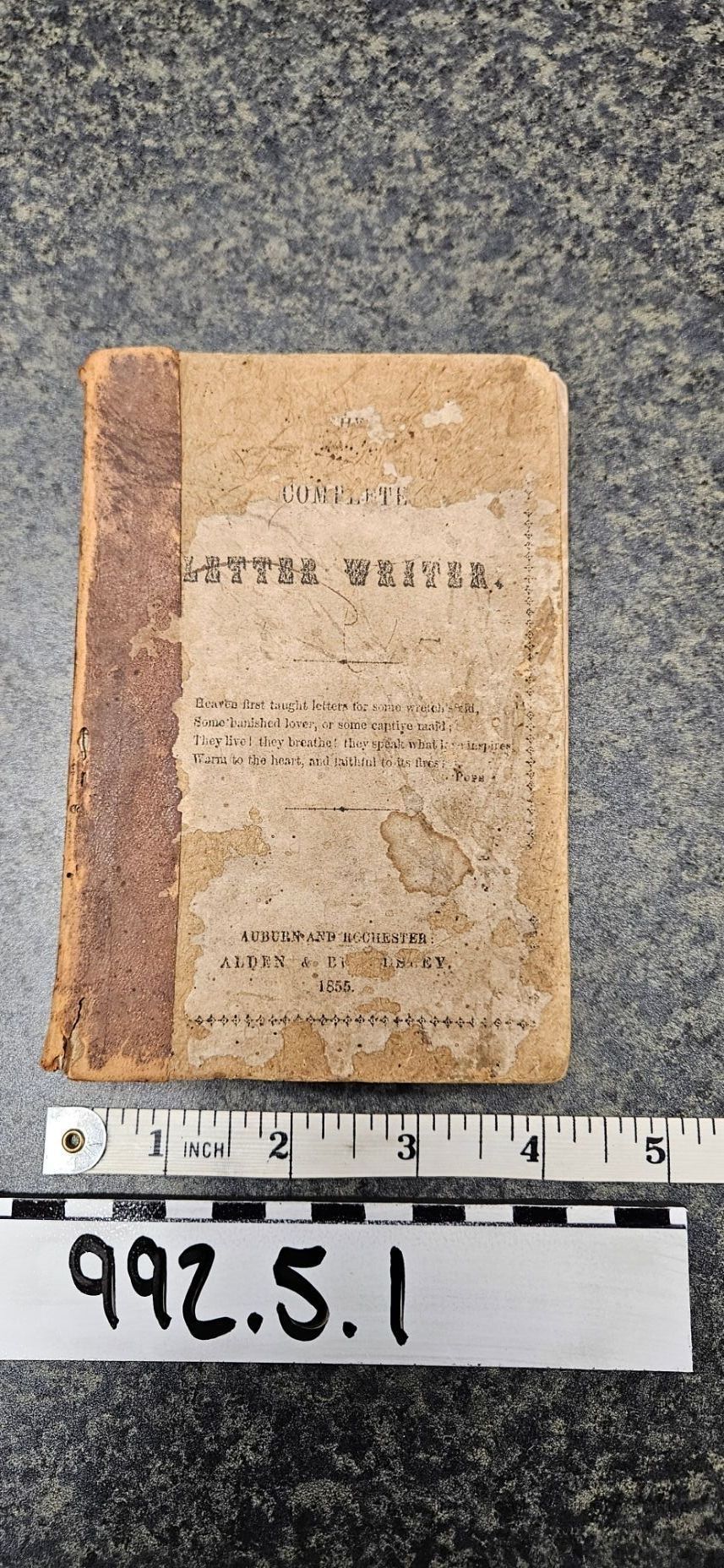Book; "Complete Letter Writer"; hard cover; black ink on white paper; beige cover; spine mended with brown leather; topic: pre-written letters for different occasions.Dimensions