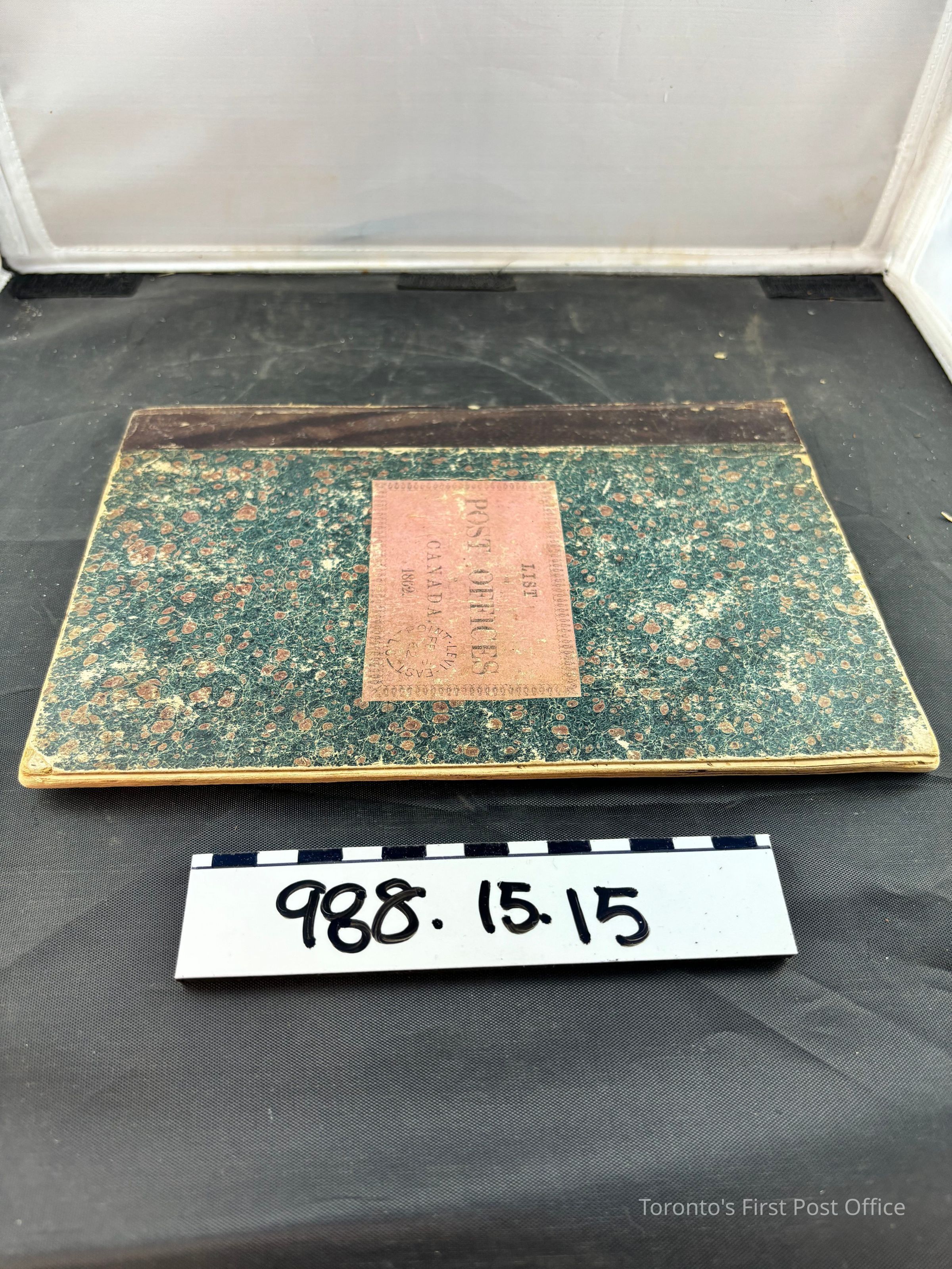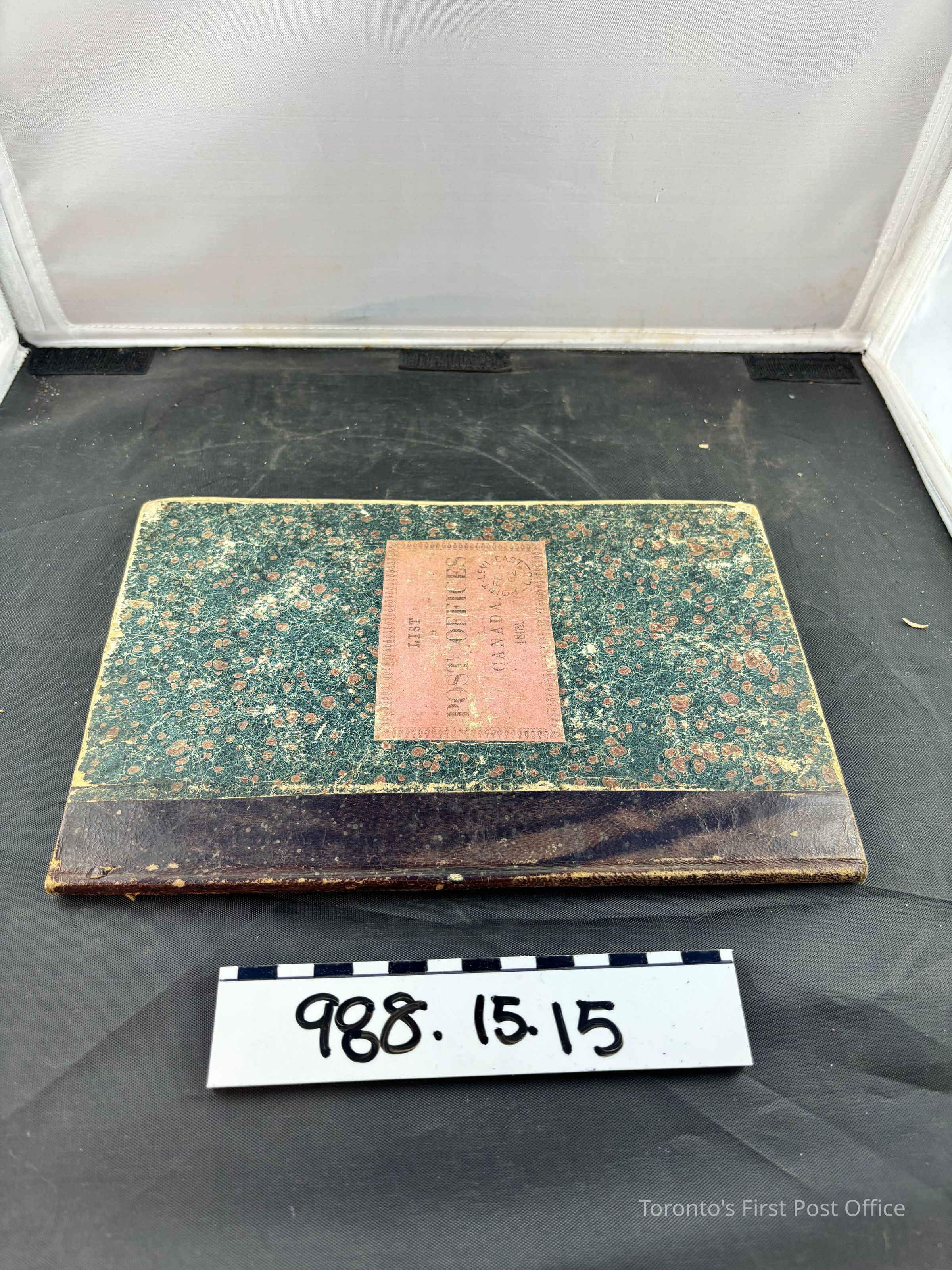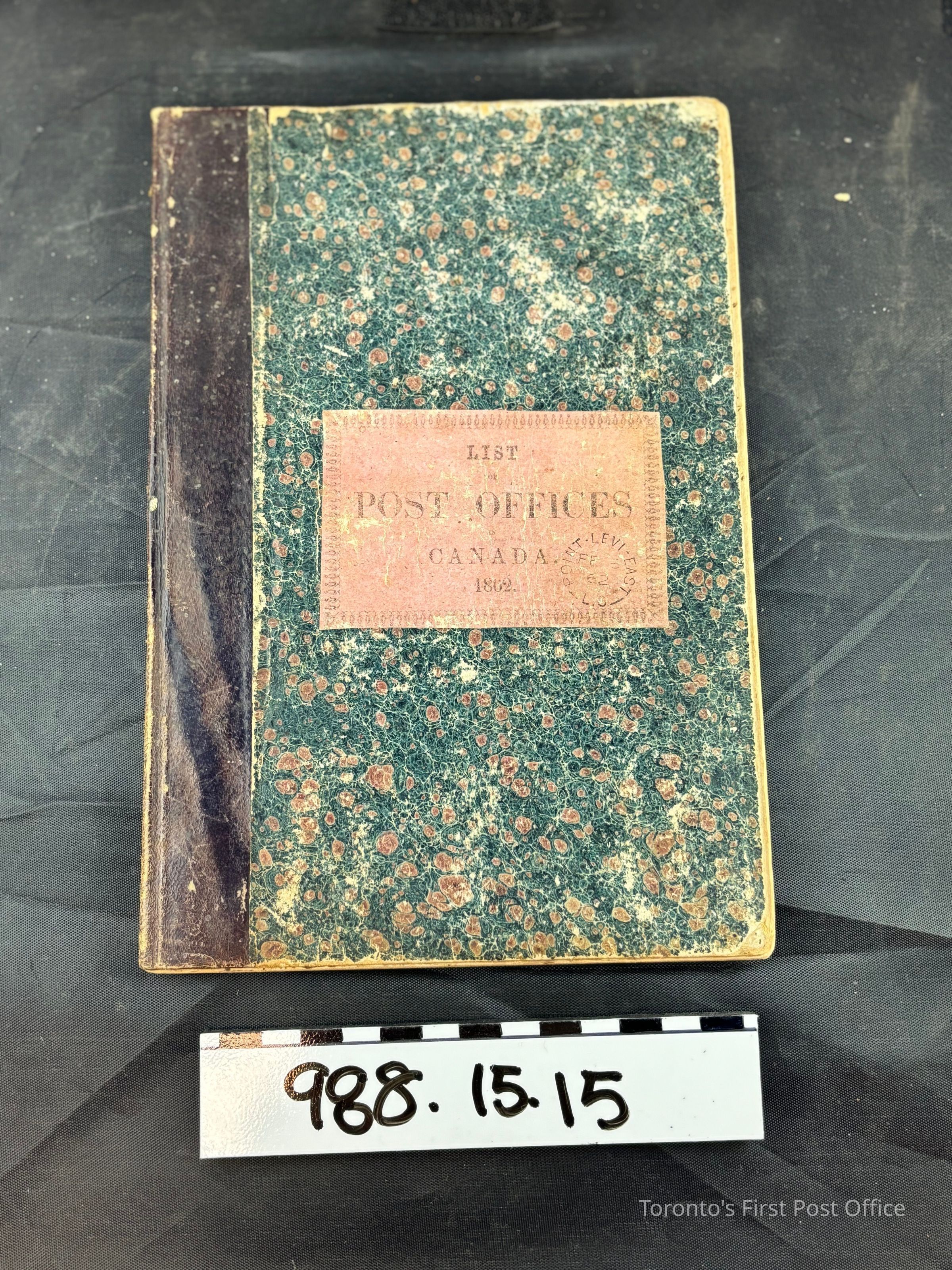 Book, "List of Post Offices in Canada"; Quebec, 1862; dark brown leather spine with blue-green marbled cardboard cover; inner printed pages are yellowed but legible; some French handwriting in browned ink.Update Date