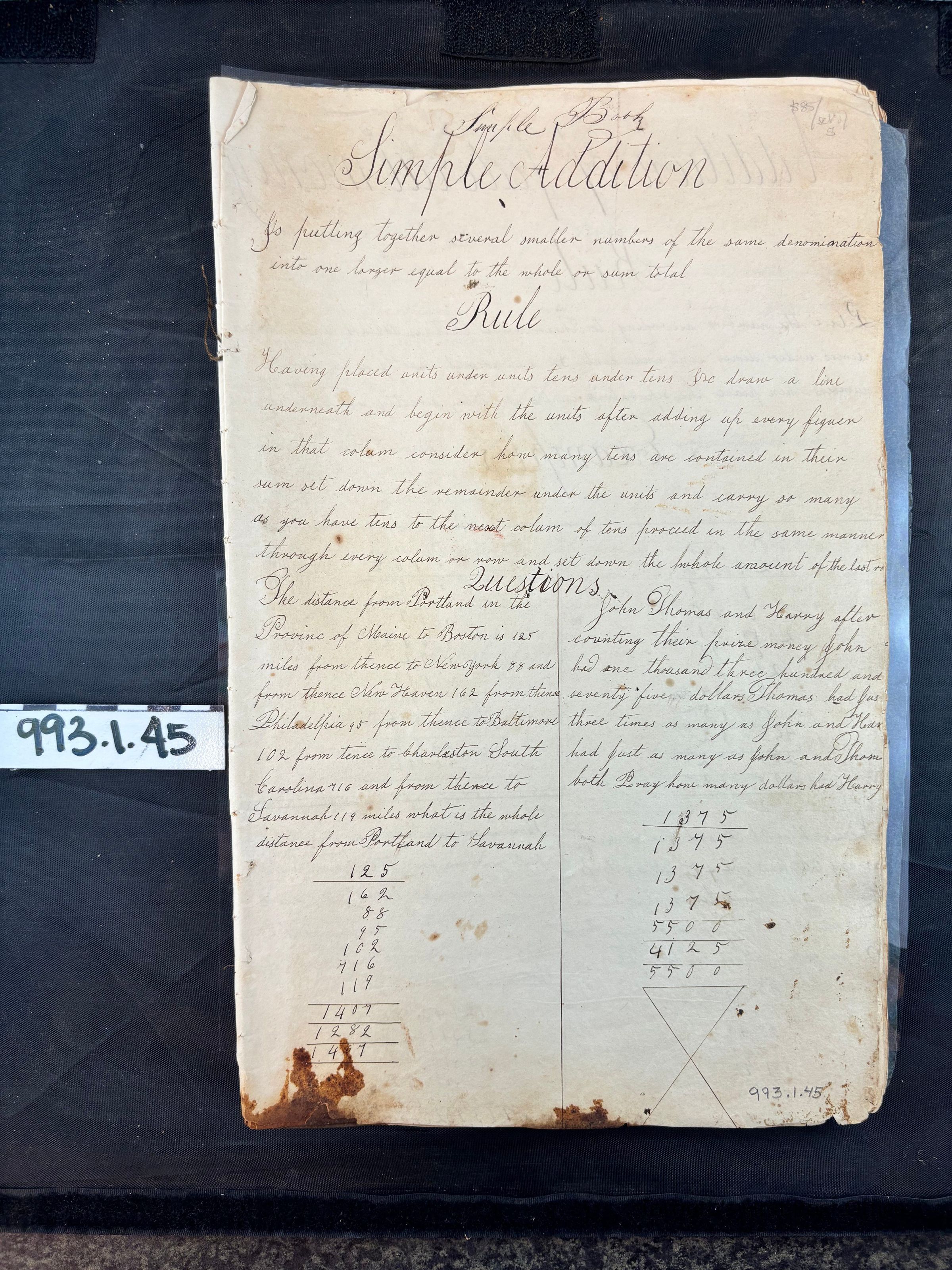 Student's book; 40 pp.; dividing line between each problem/section; thread bound; black and brown ink; belonged to Seleg and Robert Rose of New York, Norwich, Connecticut, and Sutton, Massachusetts; dated 1814-1837; math problems.Update Date