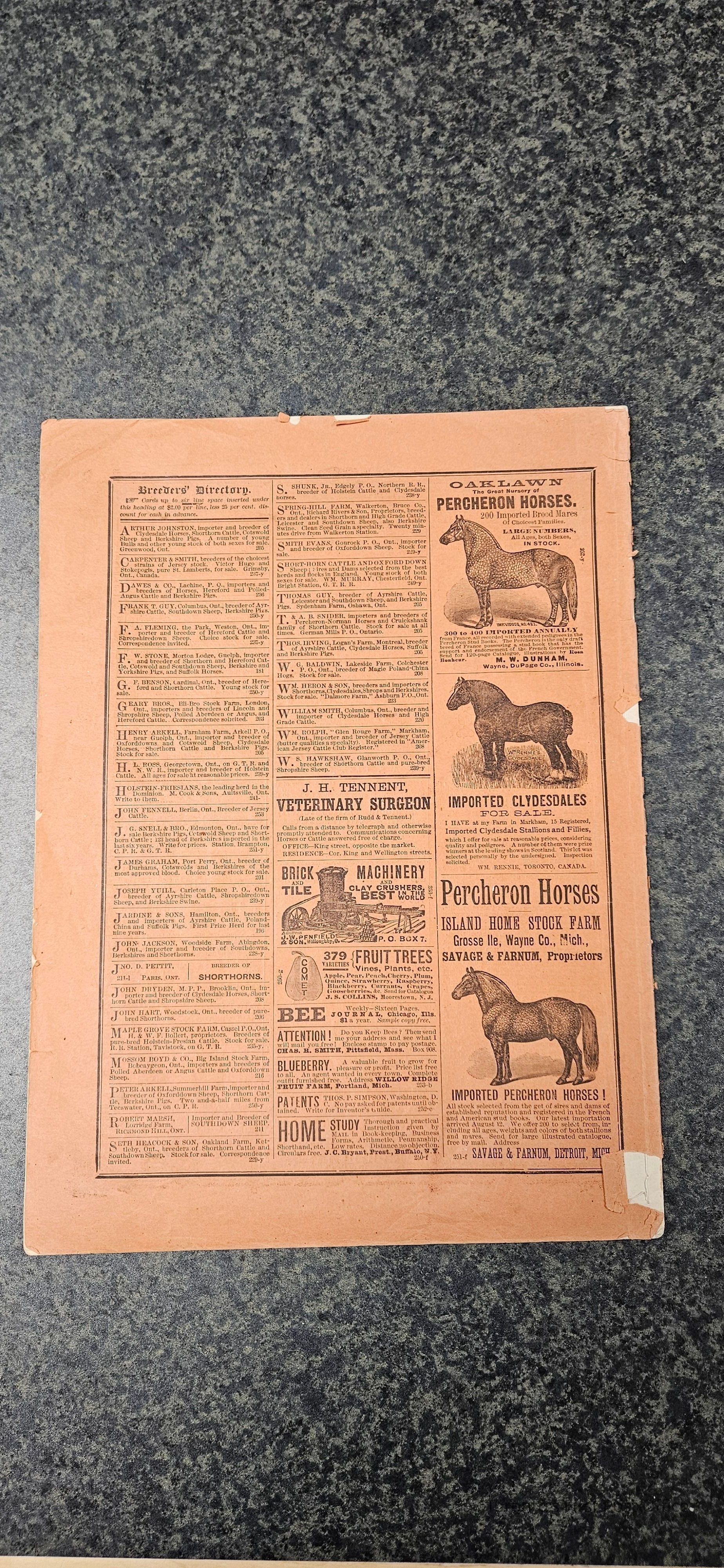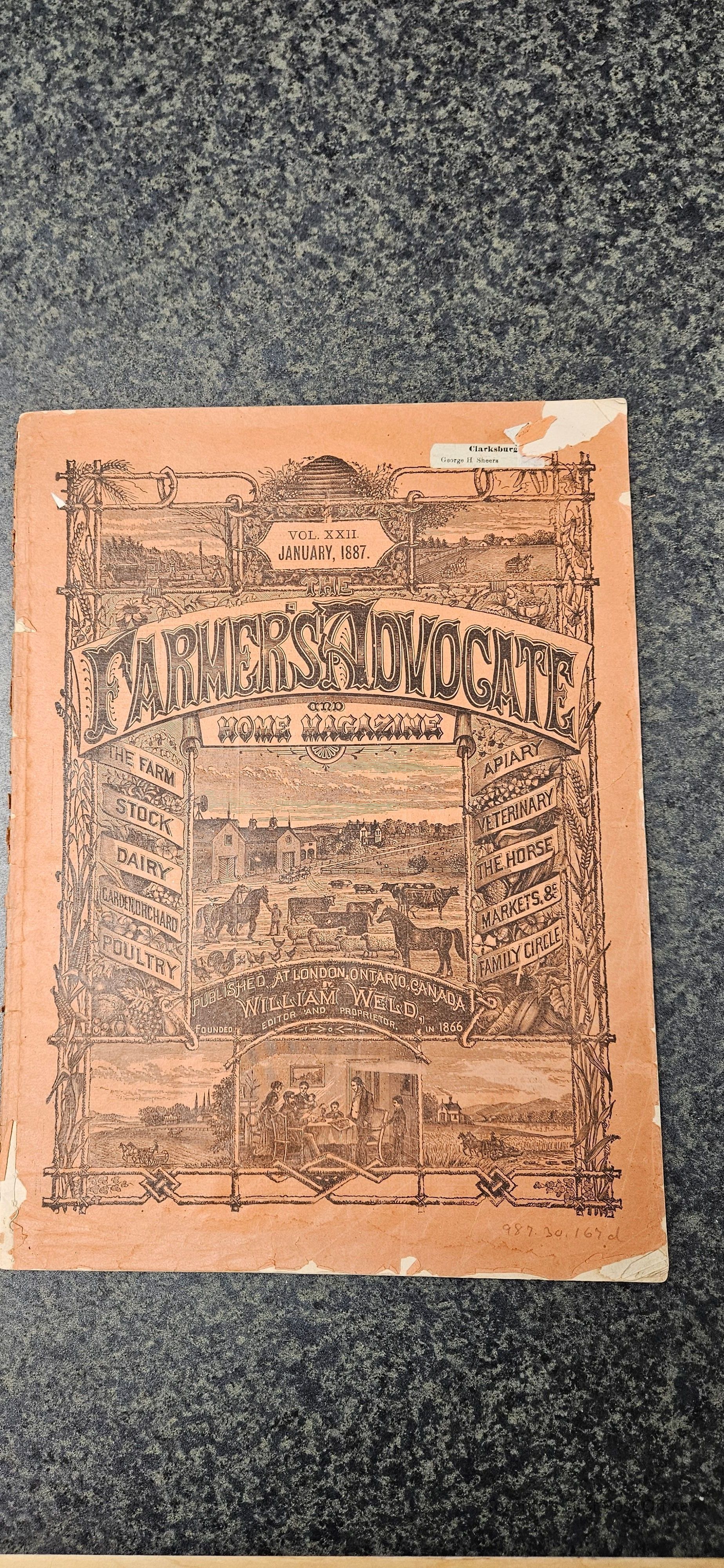 Book: "The Farmer's Advocate and Home Magazine Vol. XX January 1887"; publisher: "London, Ontario Canada, William Weld, Editor and Proprietor, Founded in 1866"; a farm magazine-style book; orange part-cover with farm scene including cows, cattle, and sheep in a barnyard; cotton thread bound; unbleached paper; black and white etching; topics include: farm advice, international farm news, entertainment page, advertisements.Dimensions