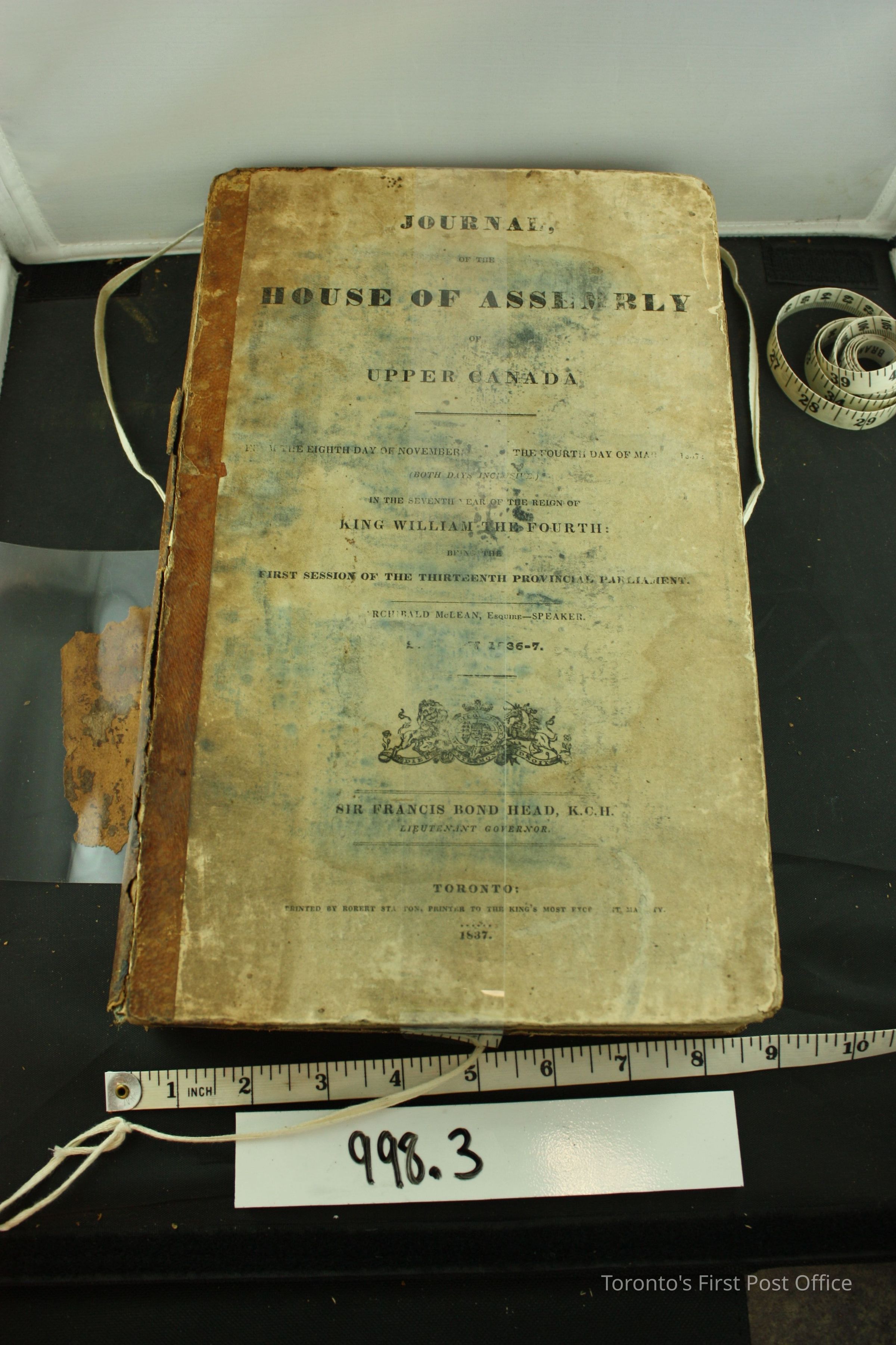 Book: "Journal of the House of Assembly of Upper Canada from the Eighth day of November, 1836, To the Fourth Day of March 1837 (Both Days Inclusive); in the seventh year of the reign of King William the Fourth"; leather spine; printed by Robert Stanton, Printer to the King's Most Excellent Majesty 1837; red ink stamp on inside cover; 644 pp.Dimensions