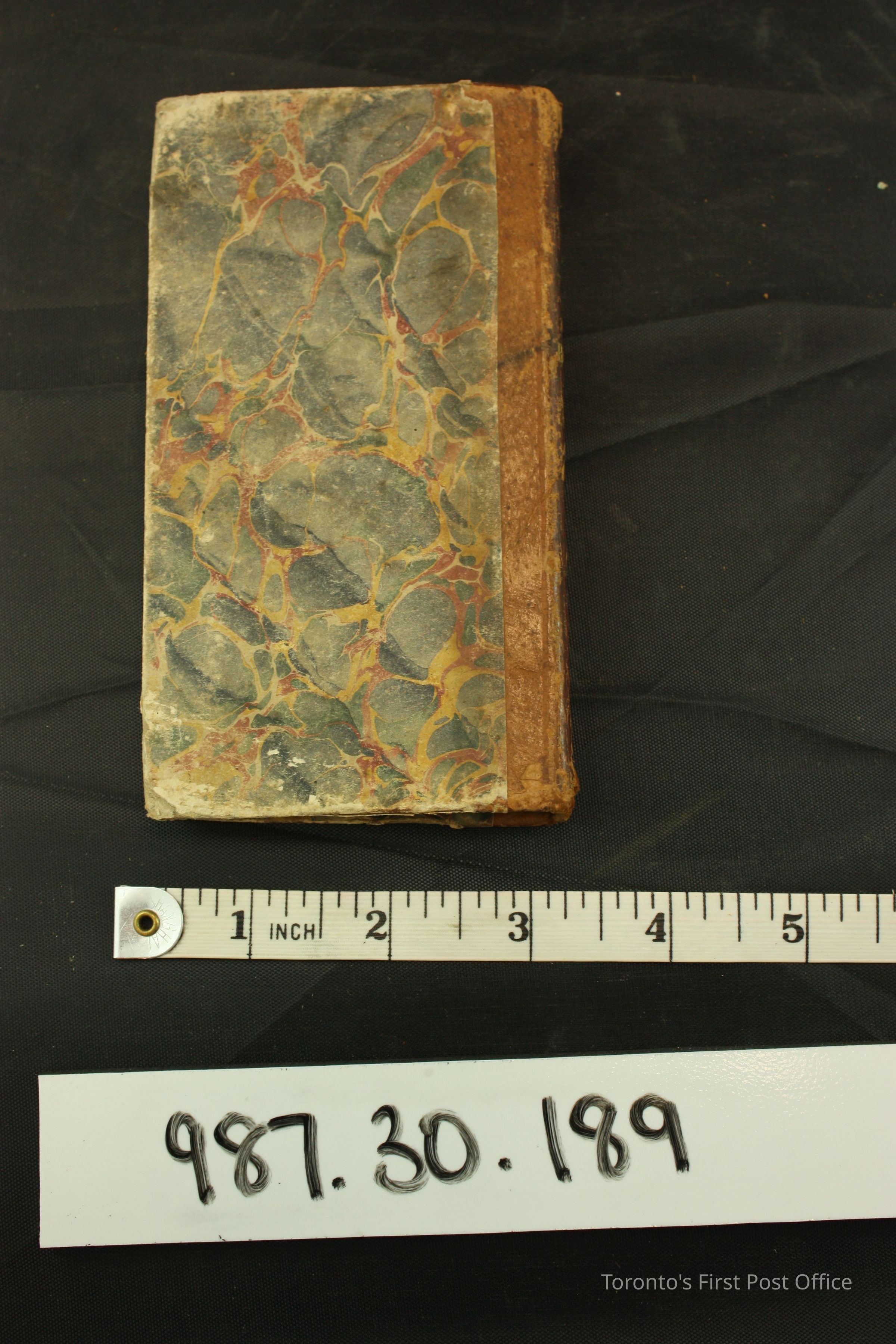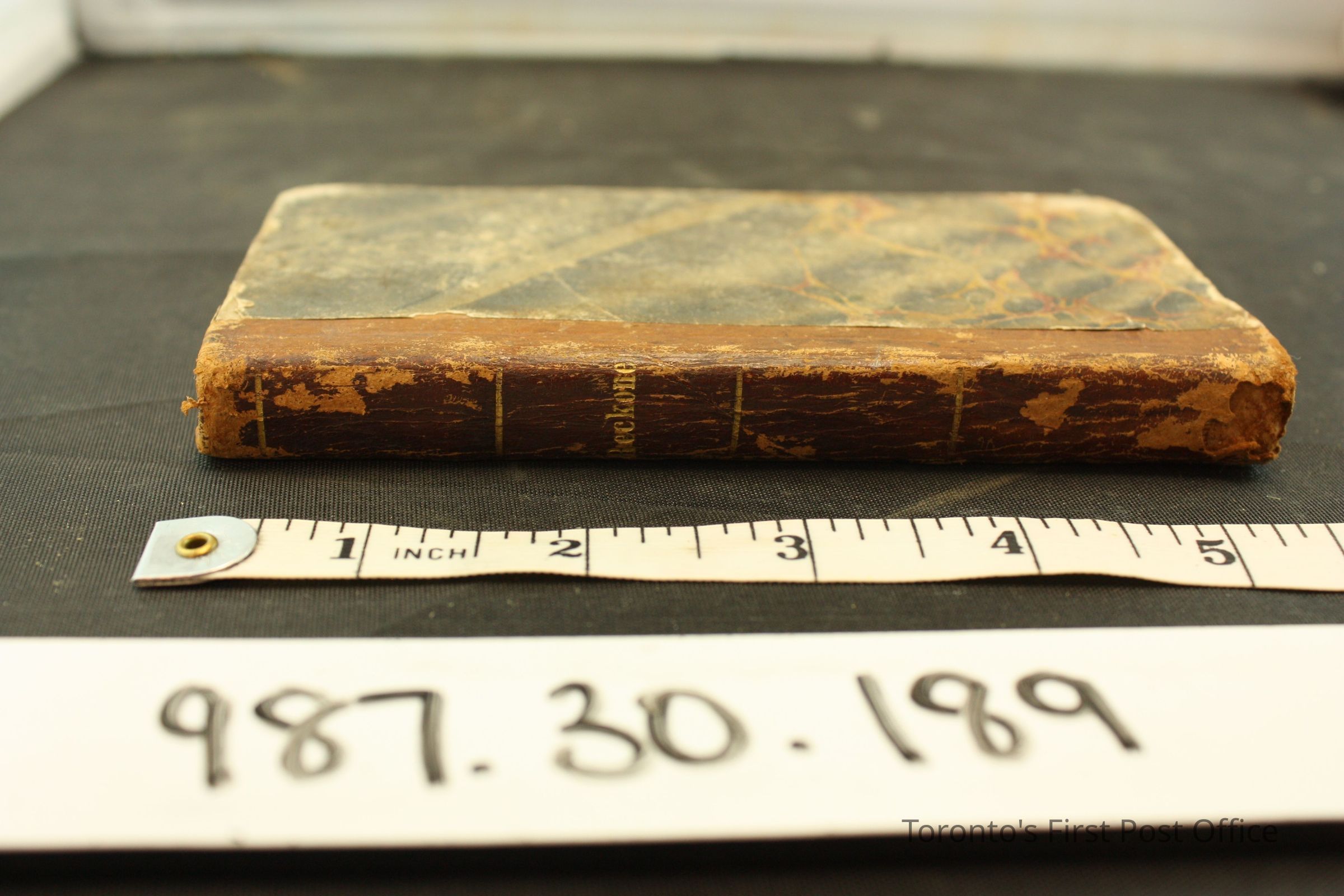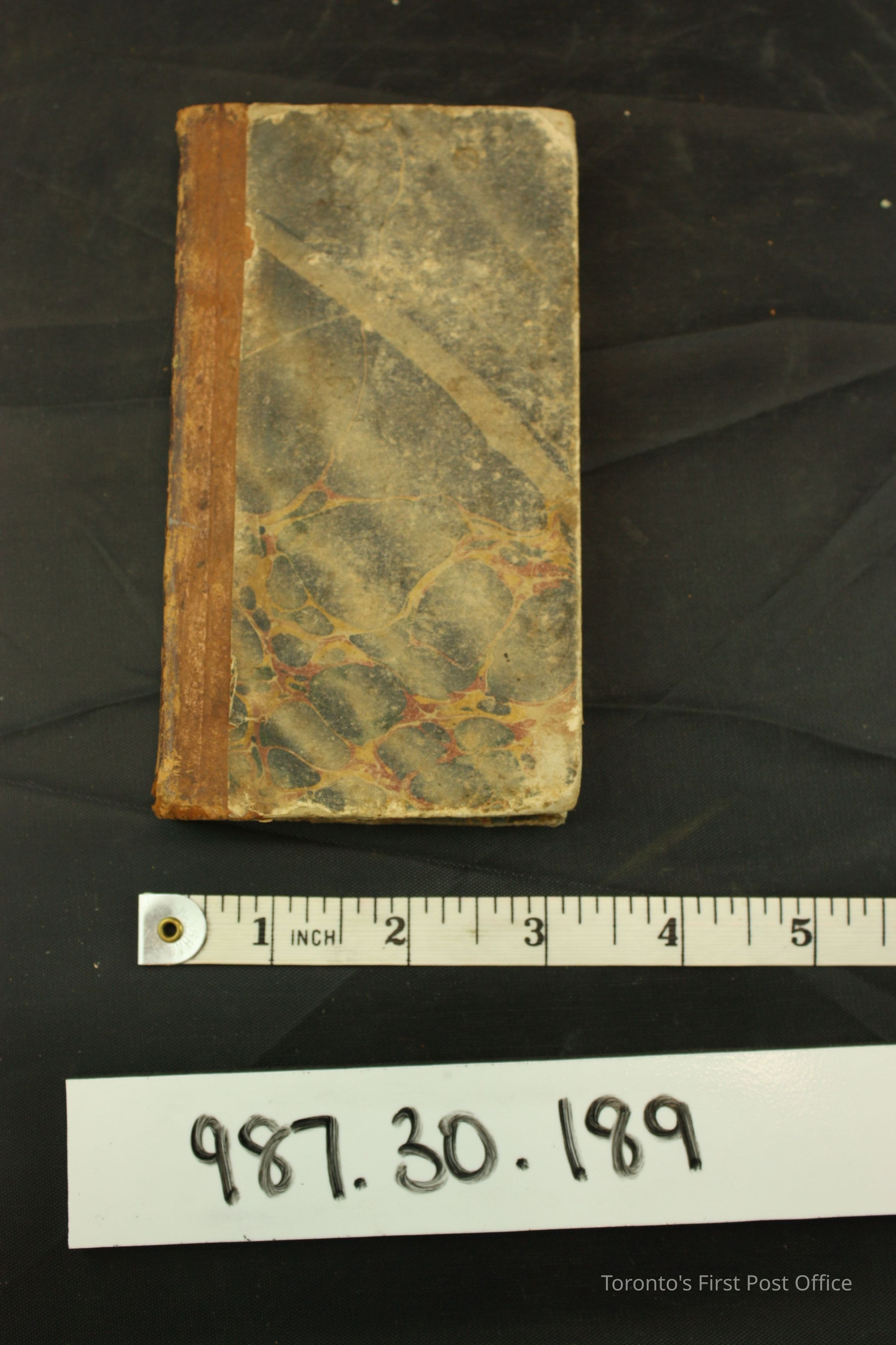 Book: "A Complete Ready Reckoner in Dollars and Cents"; published: Philadelphia: W.A. Leary, New York: Nafis and Cornish; 178 pp.; cardboard cover, covered with grey and yellow marbled paper; brown spine cover; cotton thread binding.Dimensions