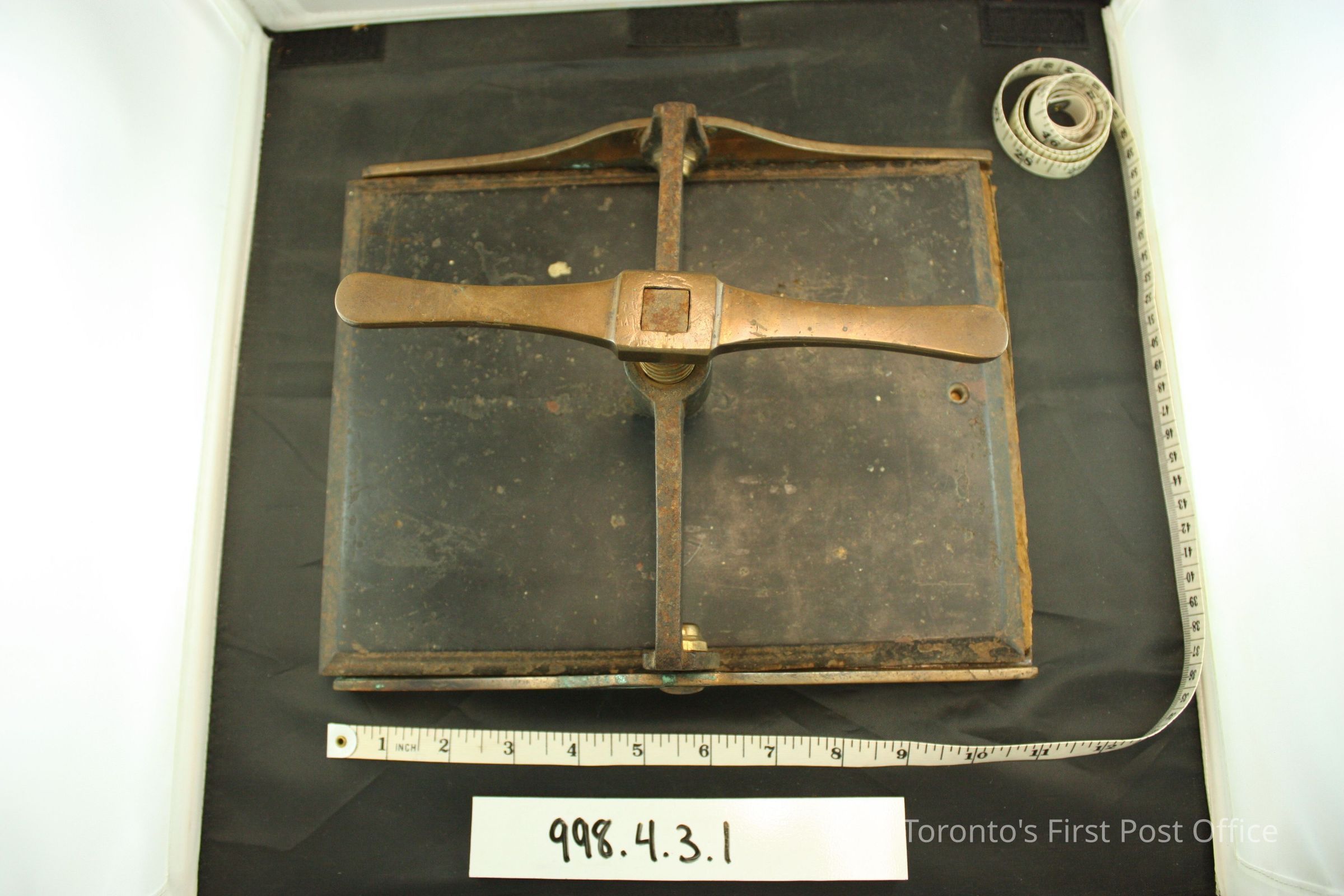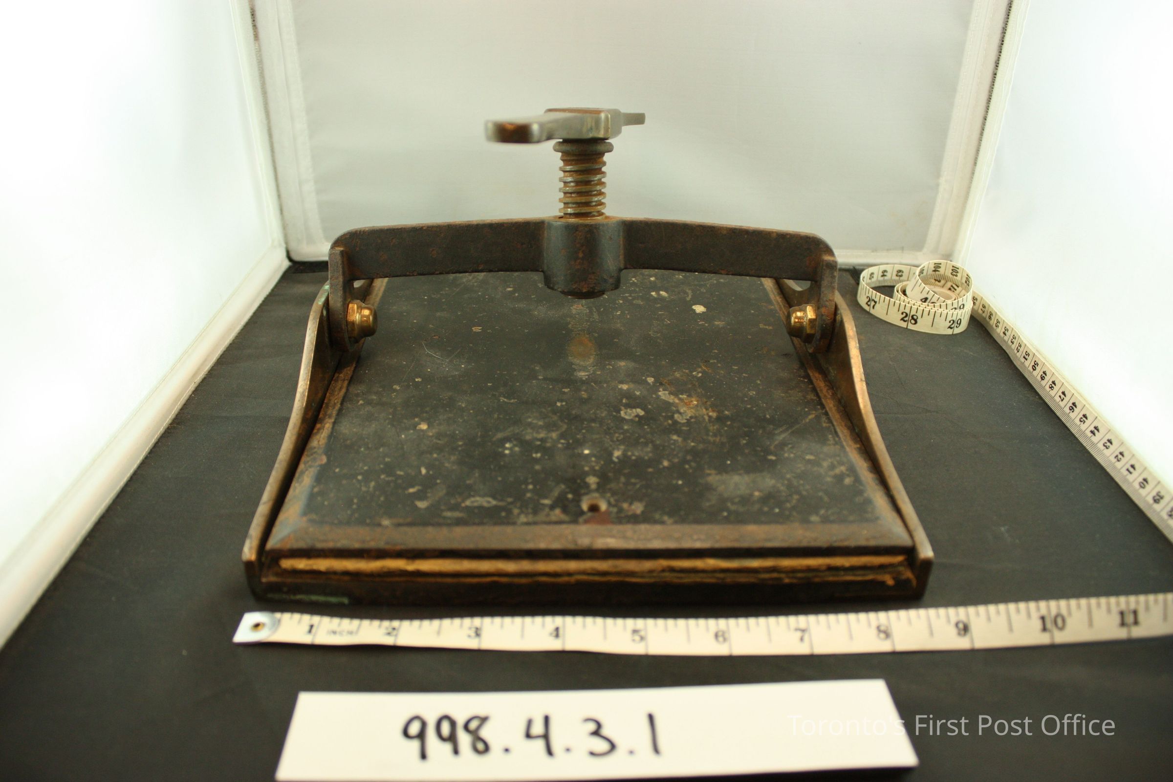 Book press; flat bottom attached to raised sides which meet at centre of press and ending with a wing nut and screw mechanism; top plate is cast iron; two felt covered cardboard pieces between plates.Dimensions