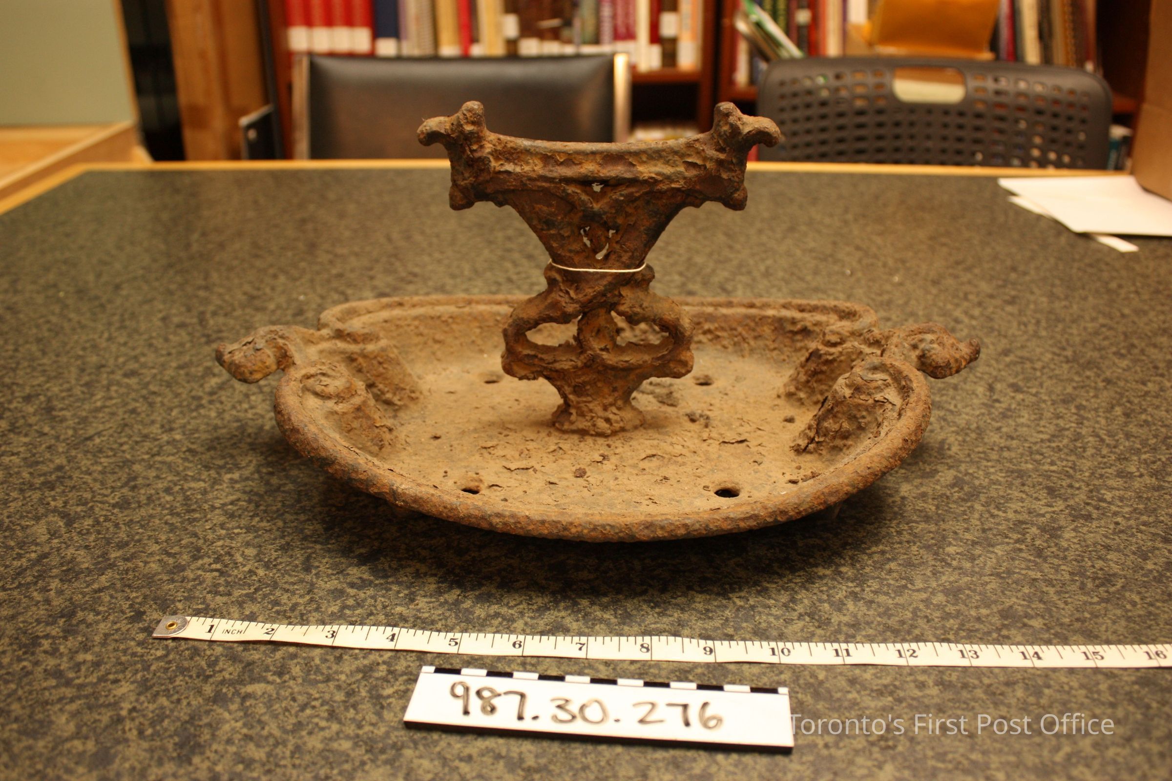 Bootscraper; cast iron; ornate floral pattern; with basin; four screw holes to attach to floor.Dimensions