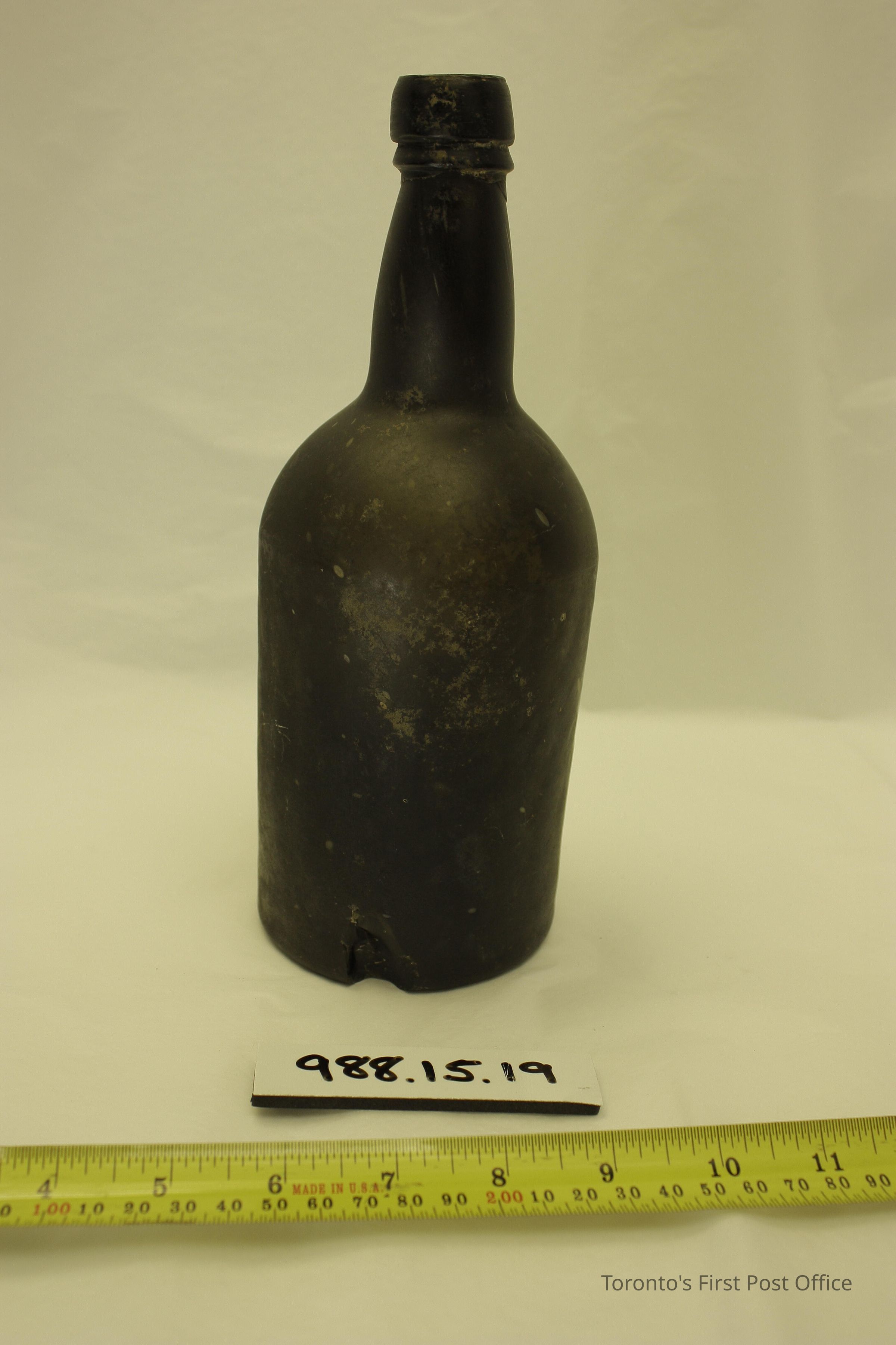 Bottle for beer or port; frosted glass bottle with tapered neck and applied top; green glass with air bubbles; push up base.