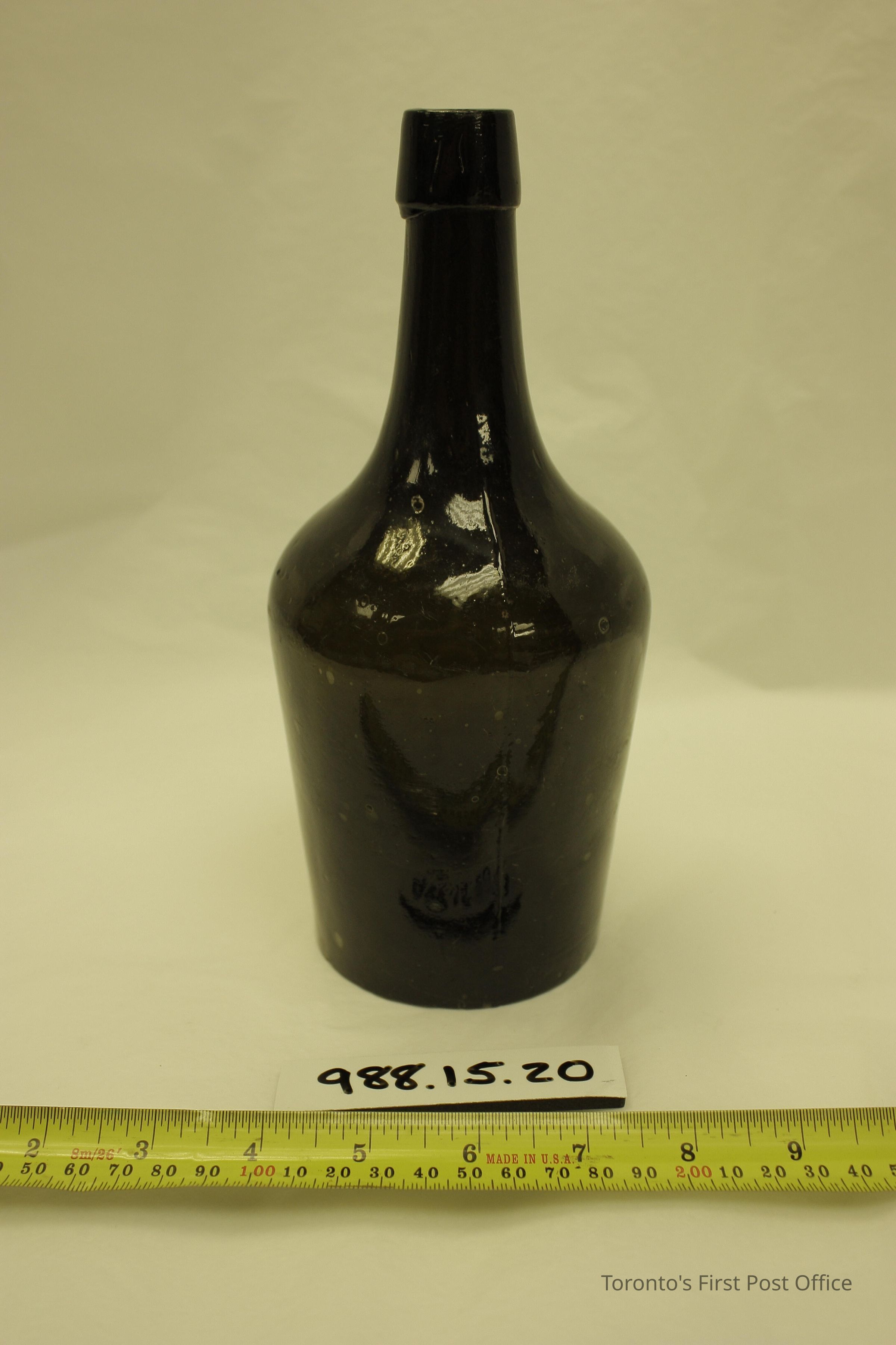 Bottle for brandy; two mould; green glass bottle with applied top; push-up bottom with pontil mark; air bubbles and linear and circular indentations on glass.Update Date