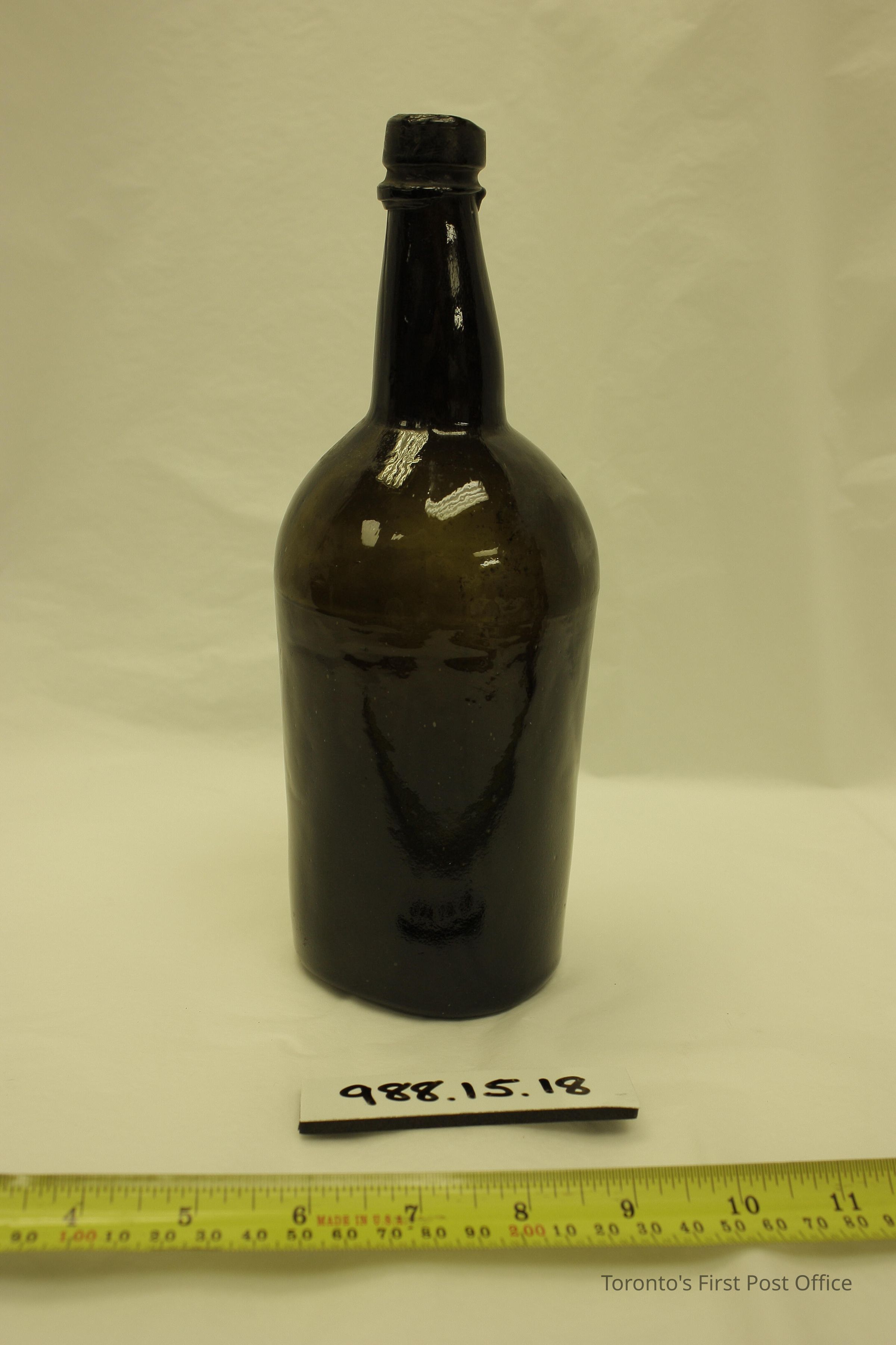 Bottle; green glass; three part mould with tapered neck; push-up base; applied to with uneven fitting; slight curve on one side of opening; cork remnant inside; poor quality glass with air bubbles and indentations on neck.Update Date