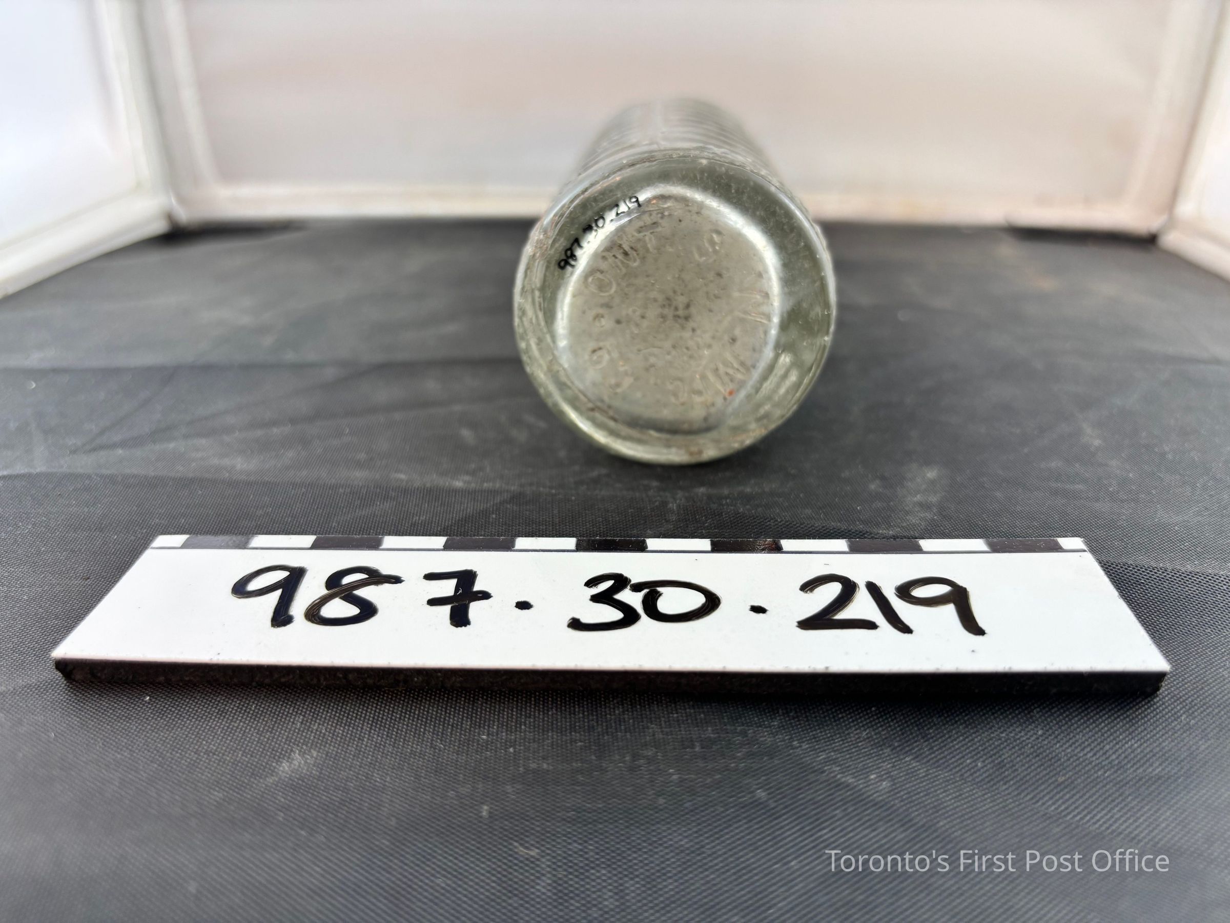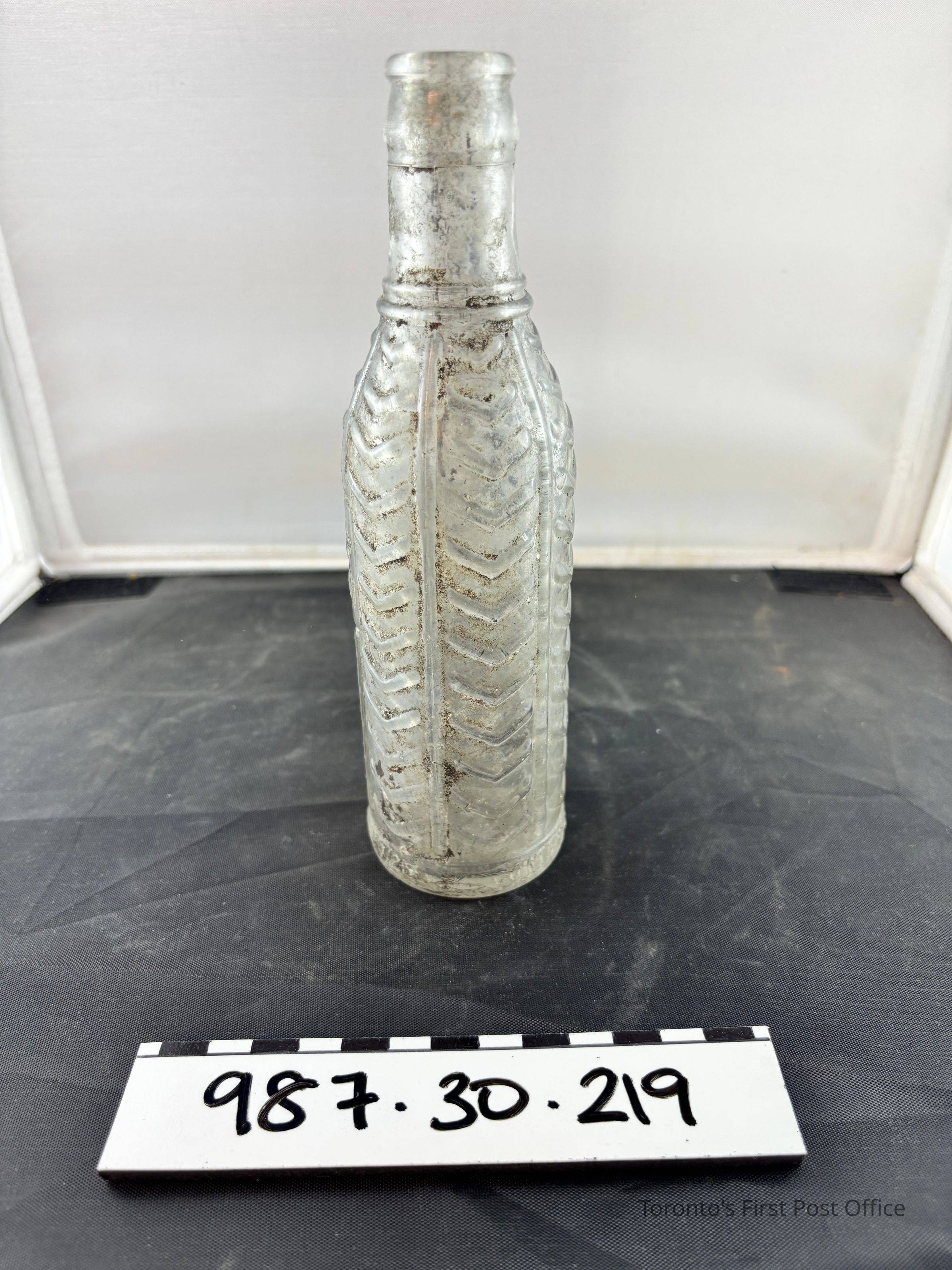 Bottle; clear glass; herringbone design in glass between six vertical lines; inscription: "ORANGE DELIGHT", "Design Regd May 7/25", "Contents 7 Fl.oz", "S.W. MFG. Co. ONT."; circa 1925; excavated from Cumberland addition 1981.Dimensions