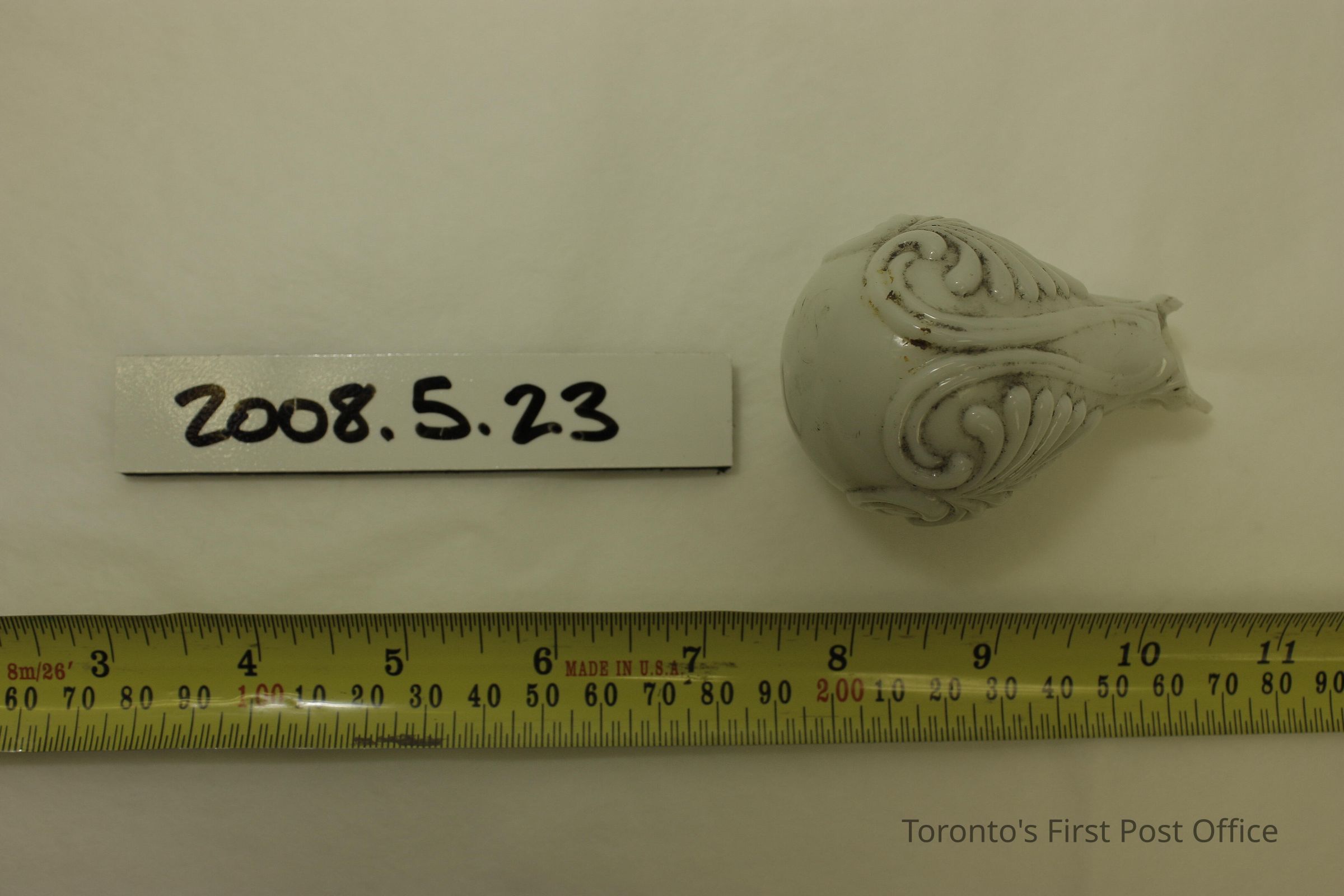 Bottle stopper; partial; milk glass; light-bulb-shaped with raised decoration.Dimensions