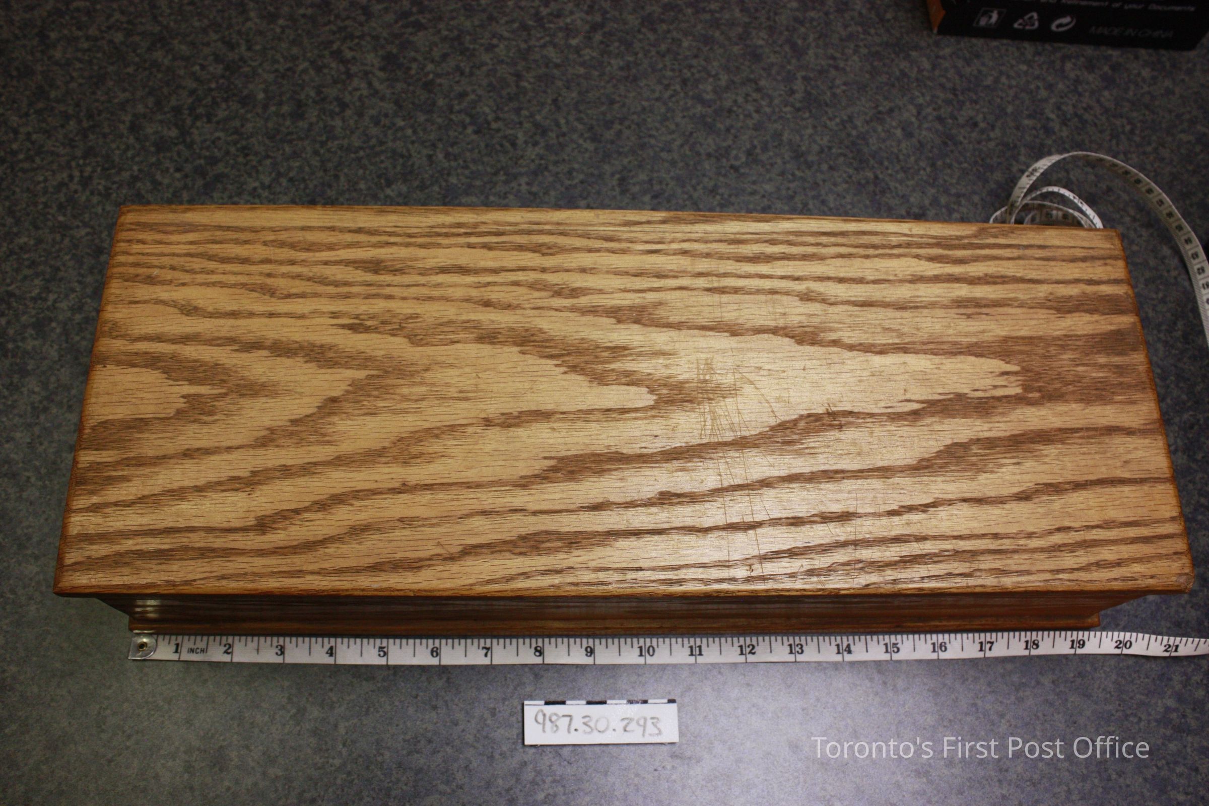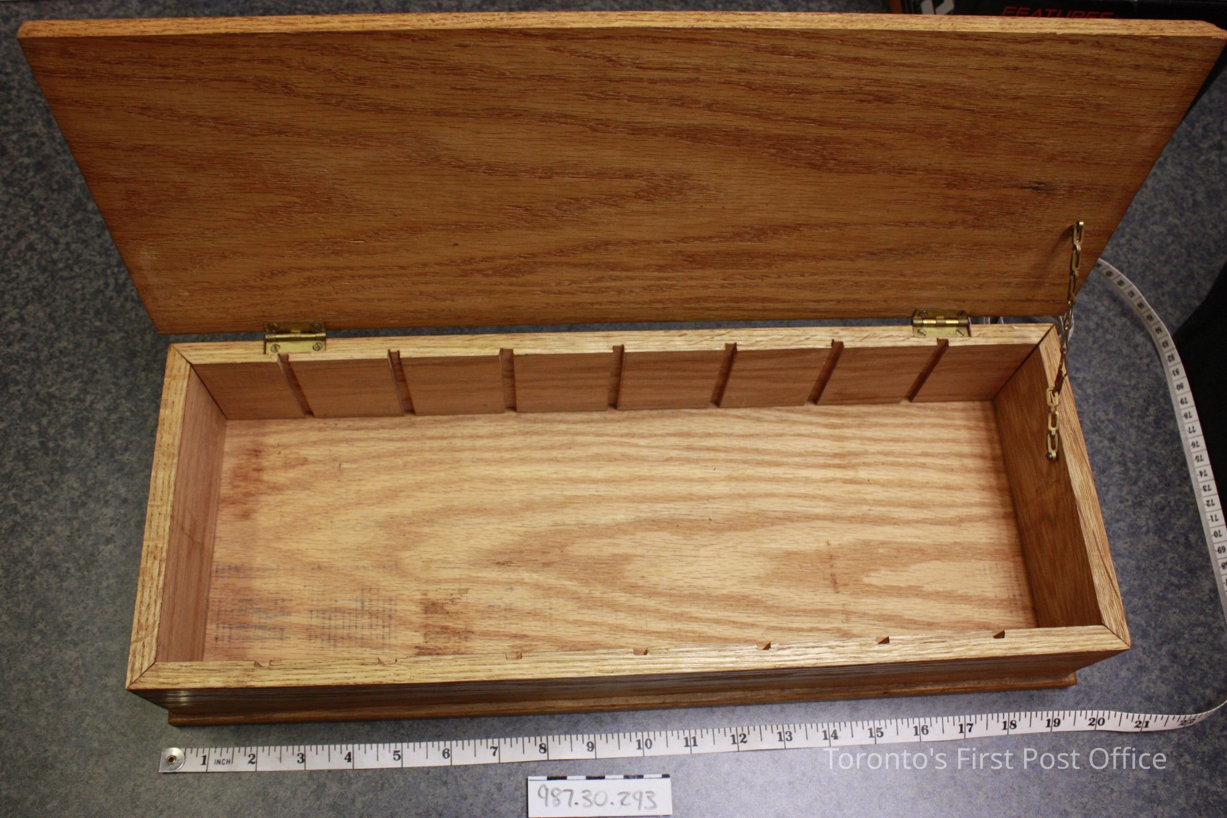 Box; oak; hinged lid with brass chain; varnished; "Quills" faintly ledgible on interior; felt lined.Dimensions