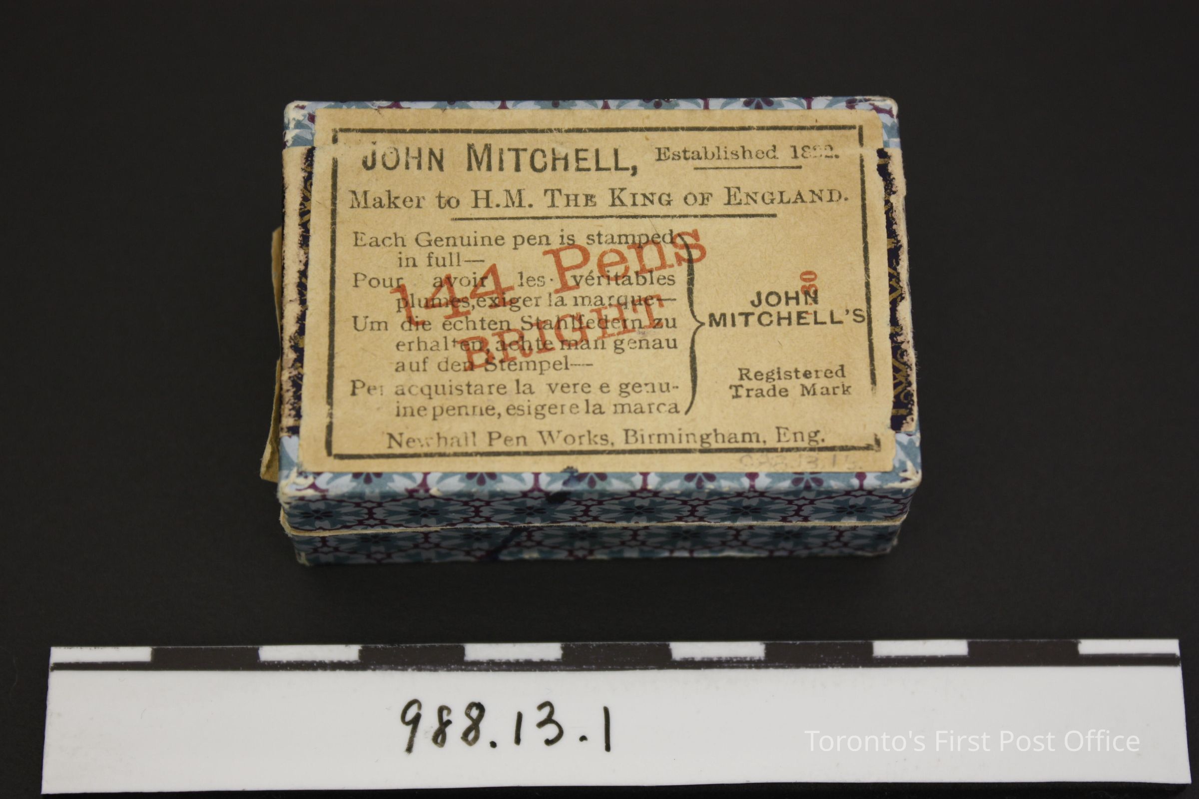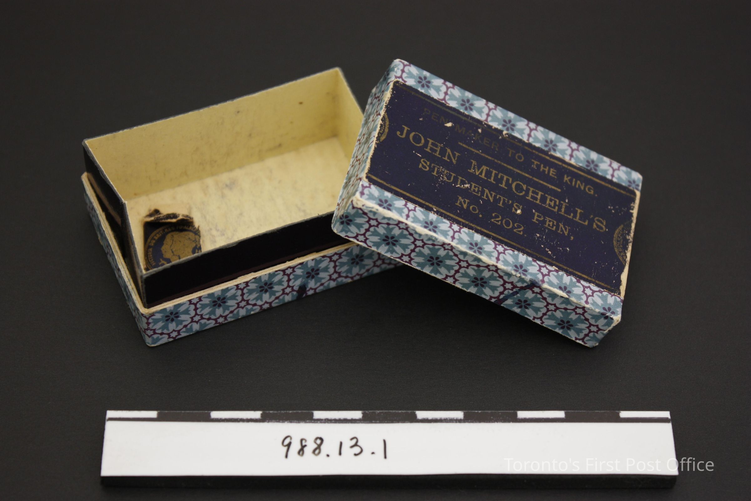 Box and lid for pen nibs; cardboard; rectangular; box and lid covered in blue floral pattern; navy label on lid reads: "Penmaker to the King, John Mitchell's Student's Pen, No. 202"; label on bottom of box: "Est. 1822, England".Parts