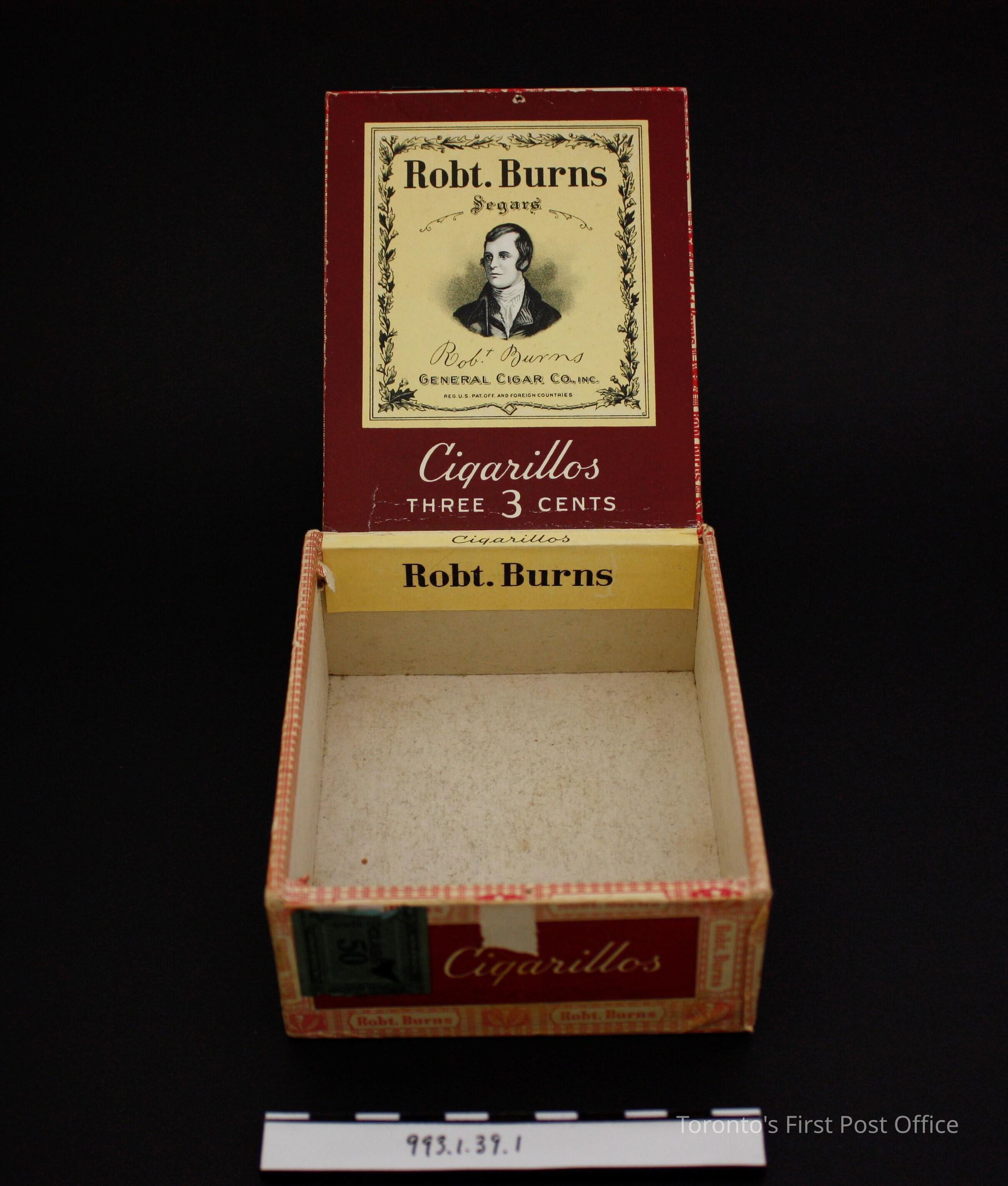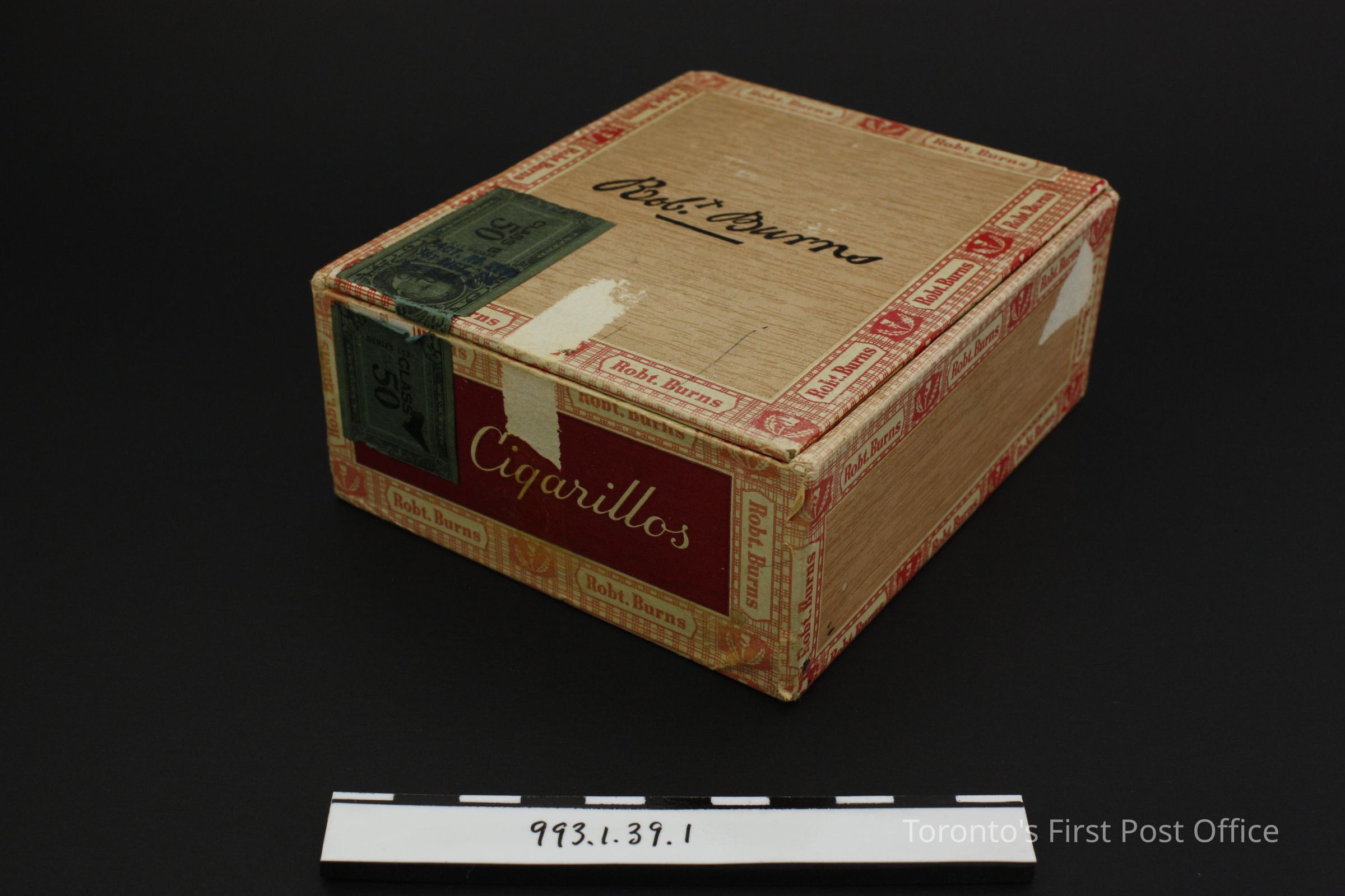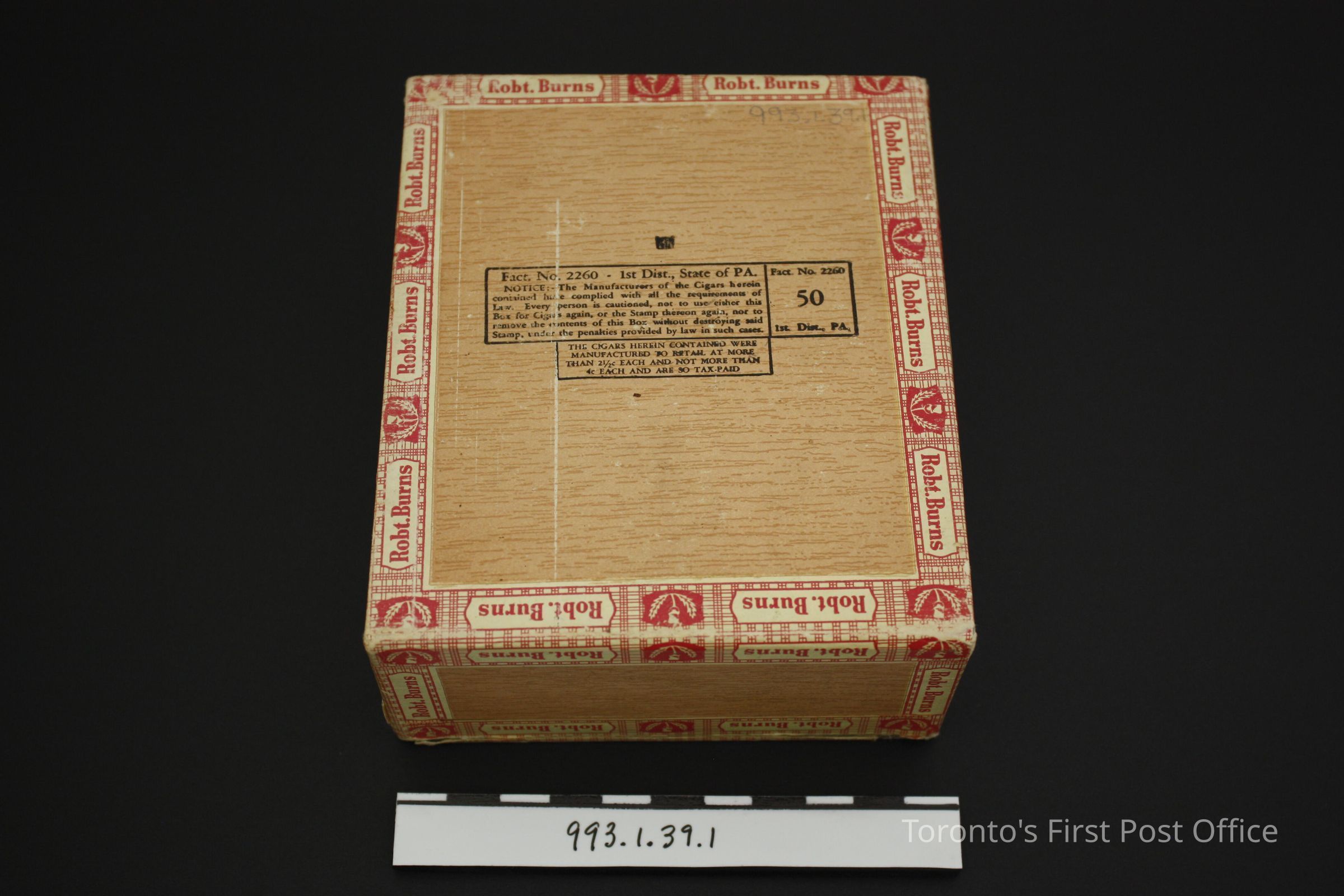 Box used to contain ten seals; originally a cigar box; cardboard; covered in paper printed with wood grain design and "Robt.Burns Cigarillos" and "United States Internal Revenue Class B 50"; manufacturers seal of approval and purity at bottom of box; hinged lid.Dimensions