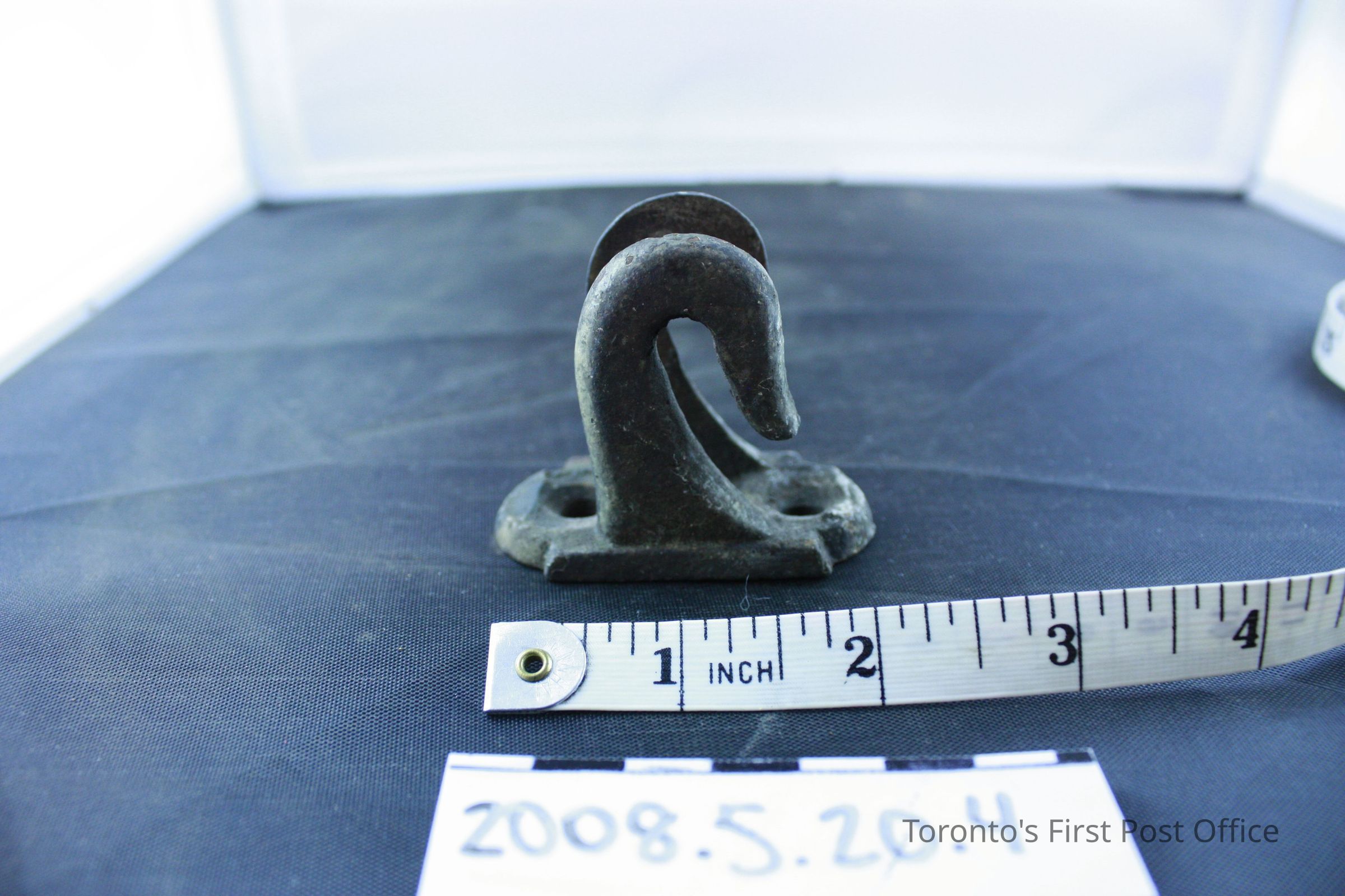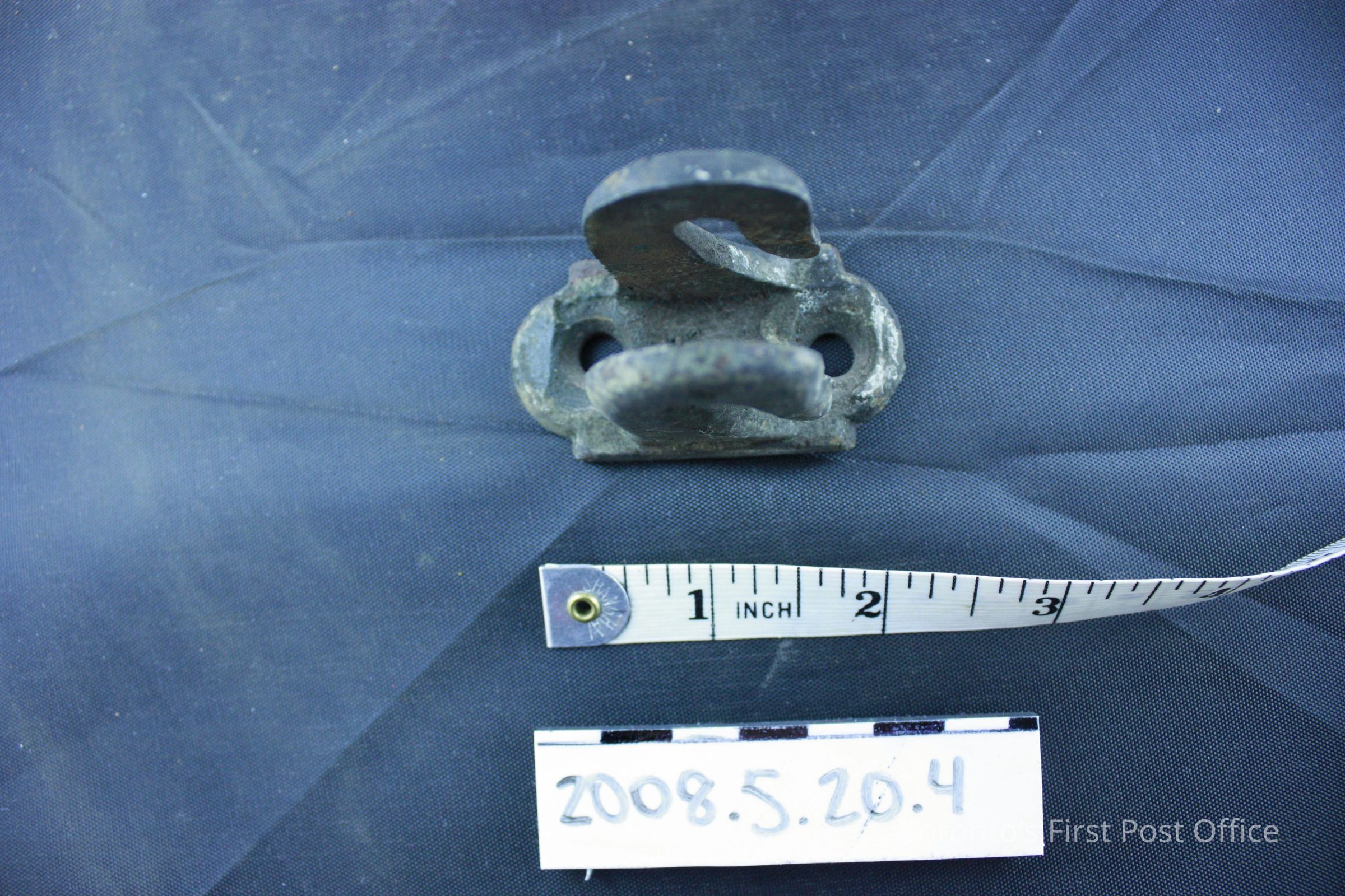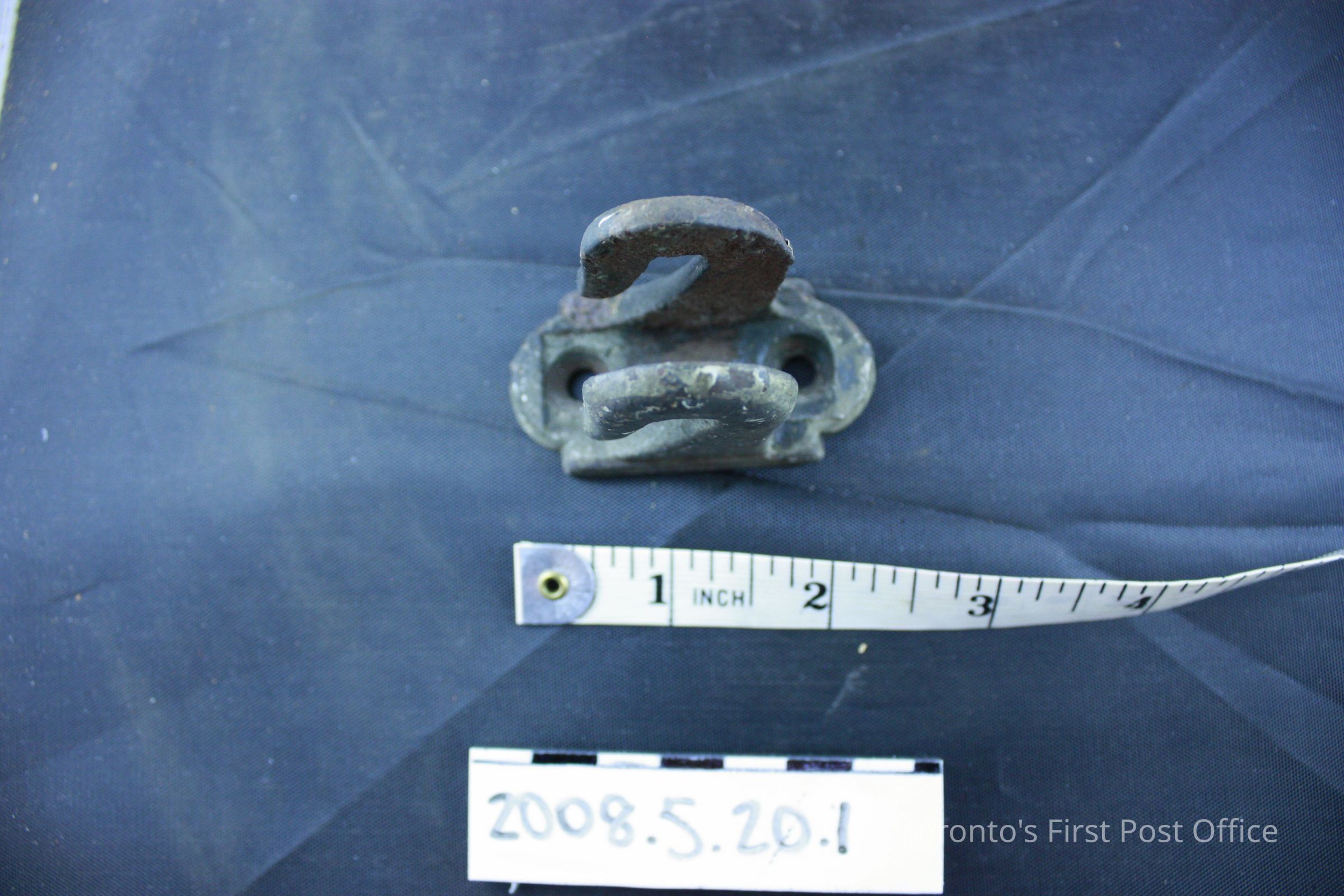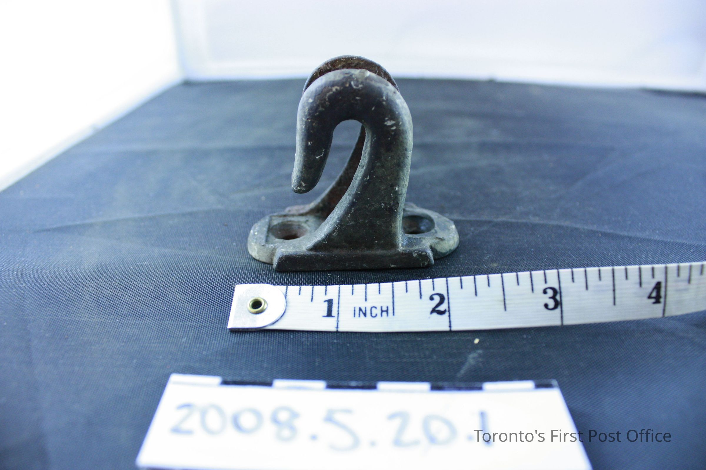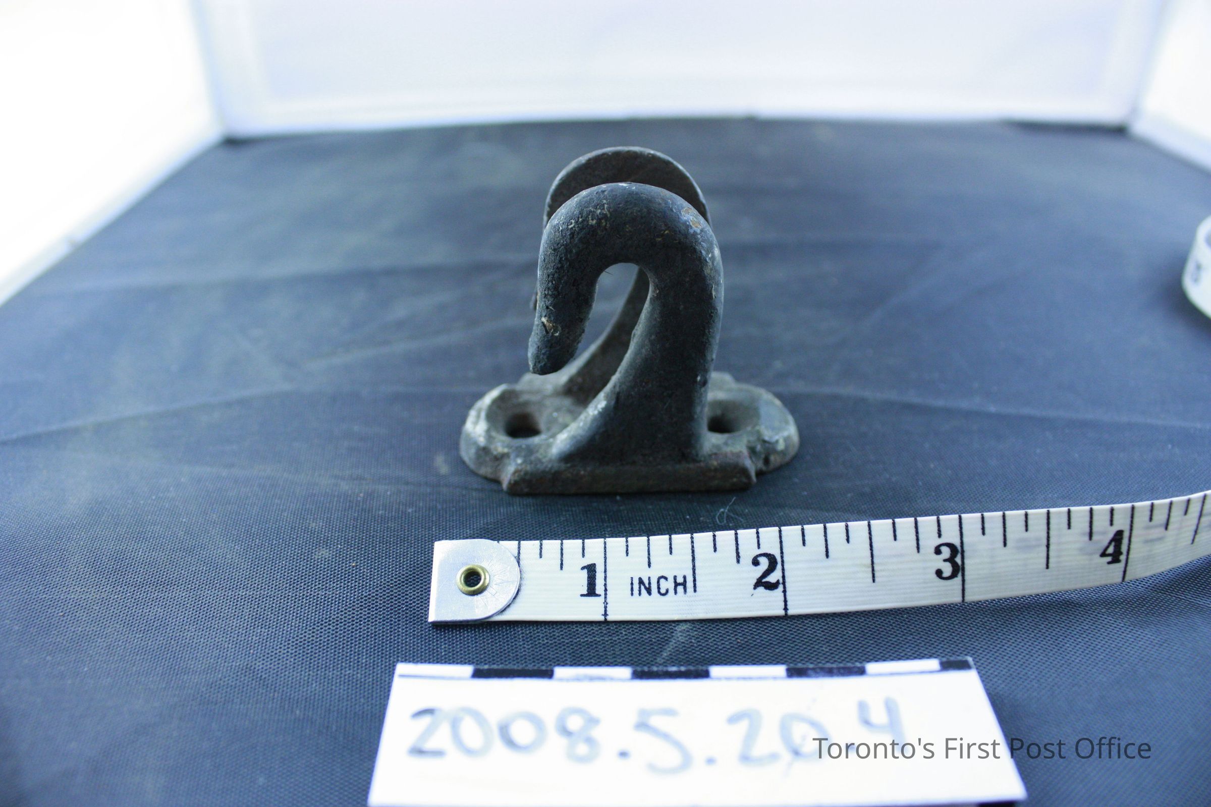 Four brackets; resemble two hooks on one base; iron; base has two holes for screws.Dimensions
