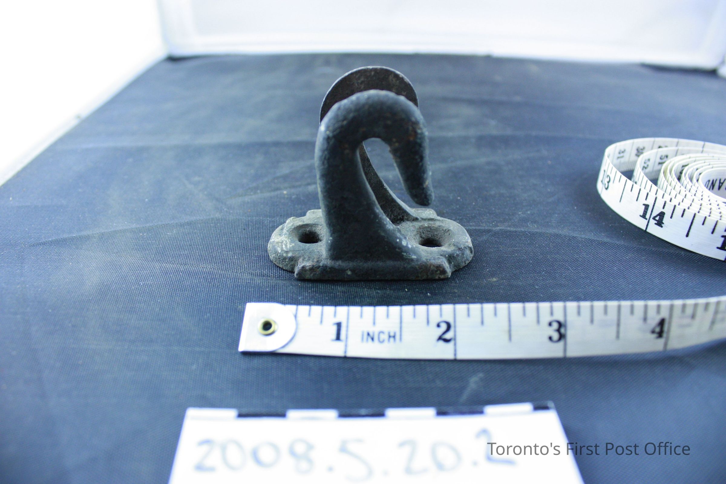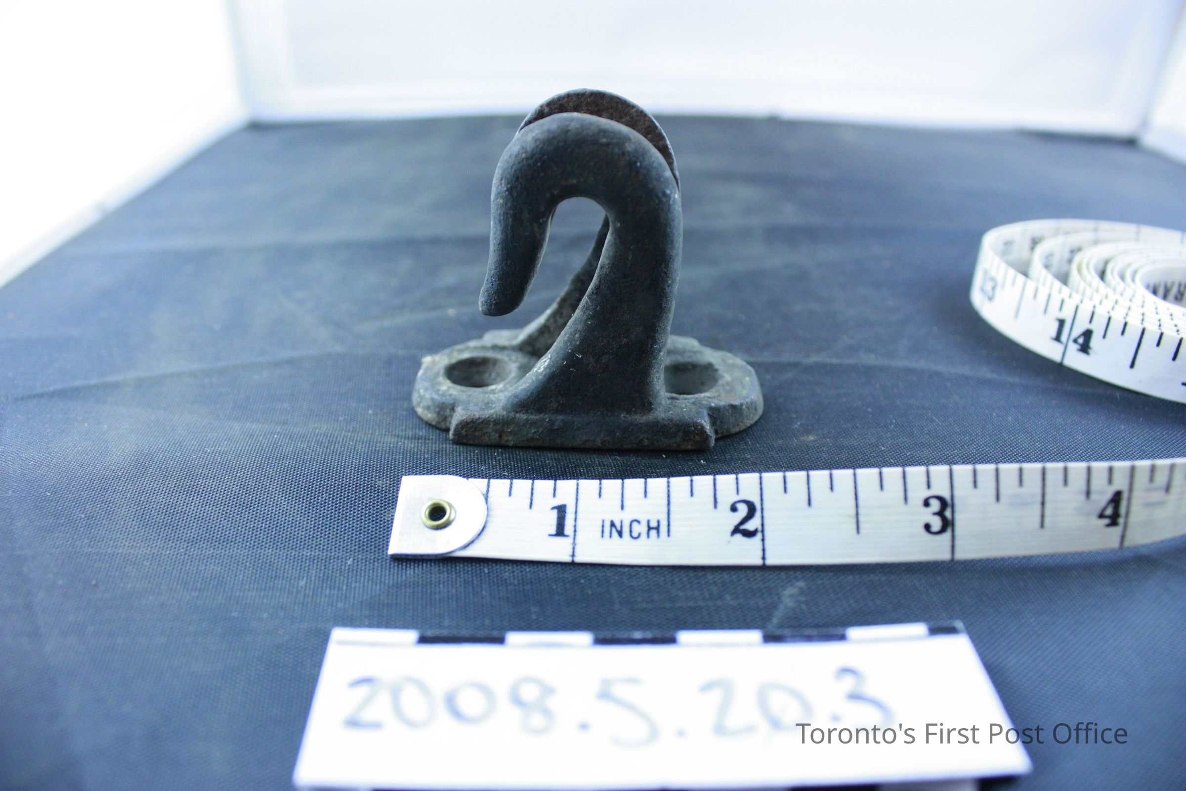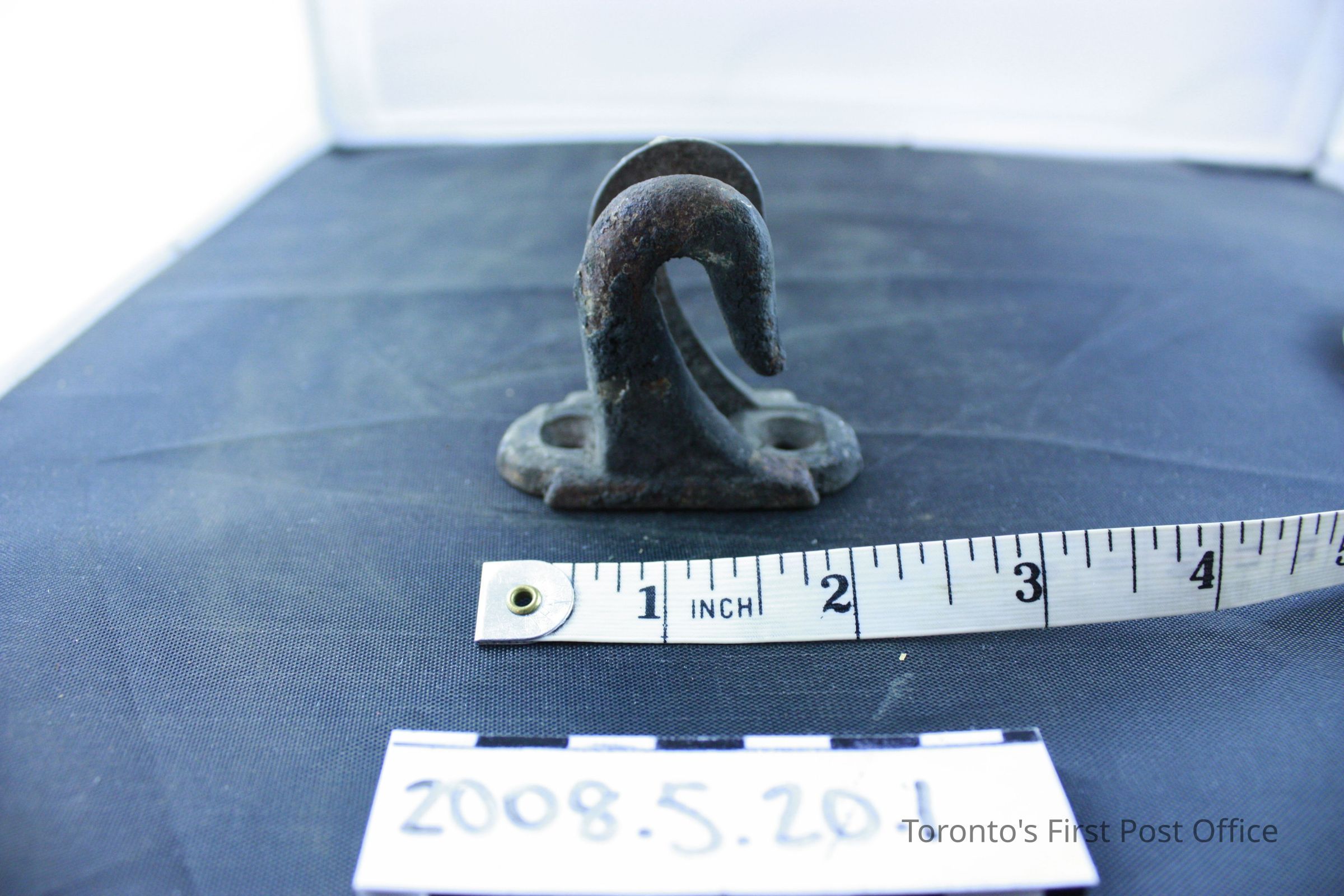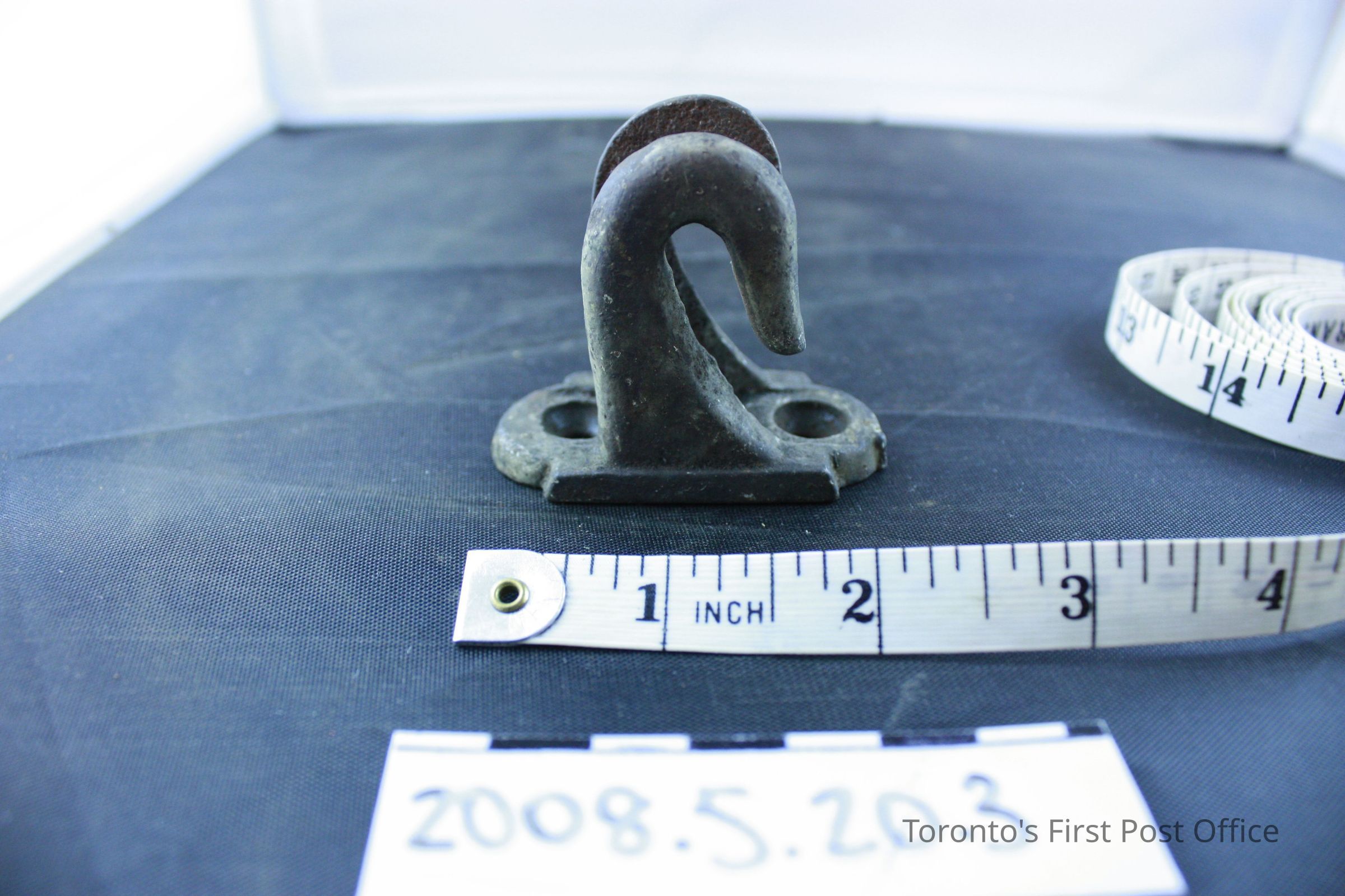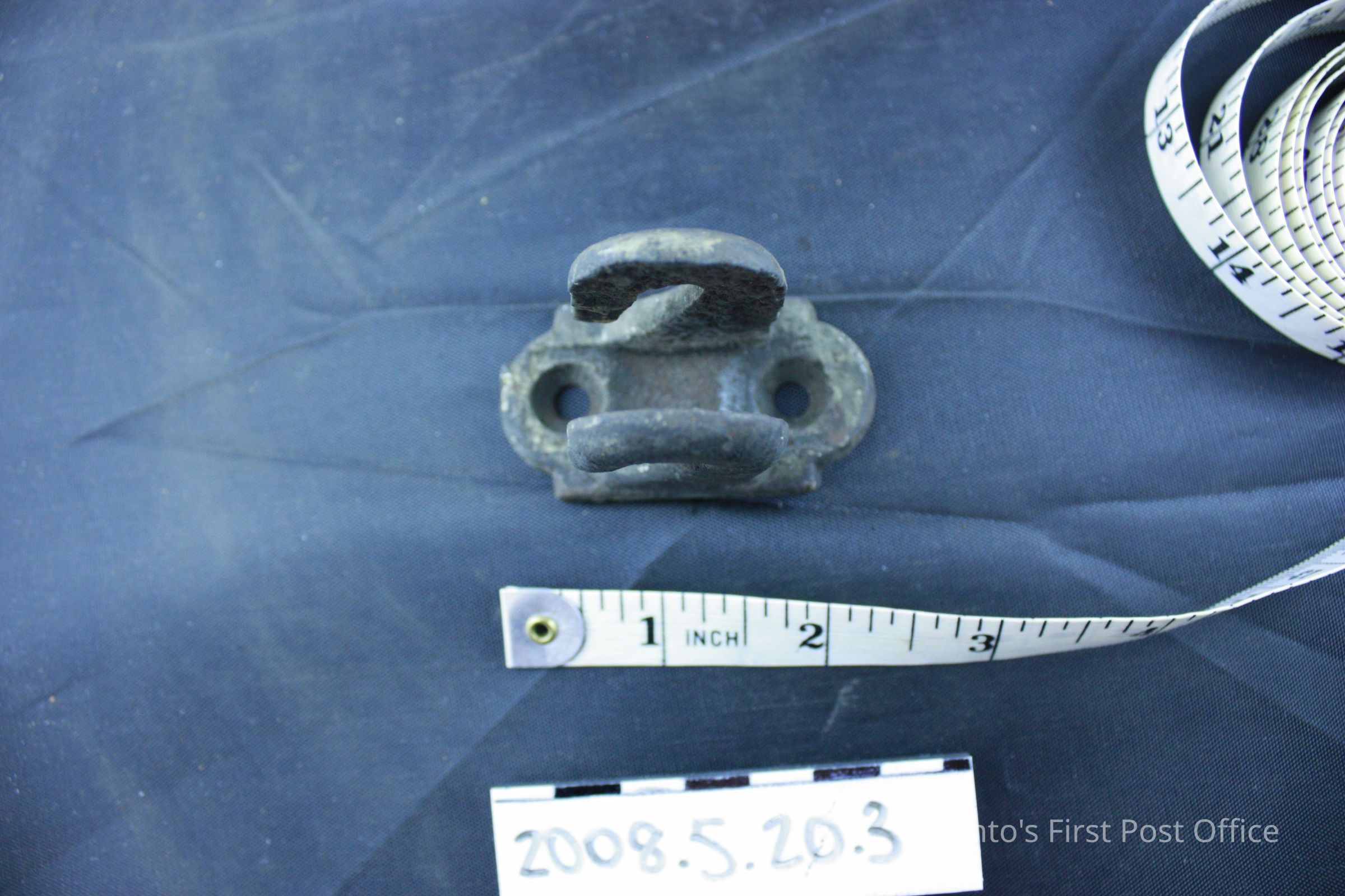 Four brackets; resemble two hooks on one base; iron; base has two holes for screws.Dimensions