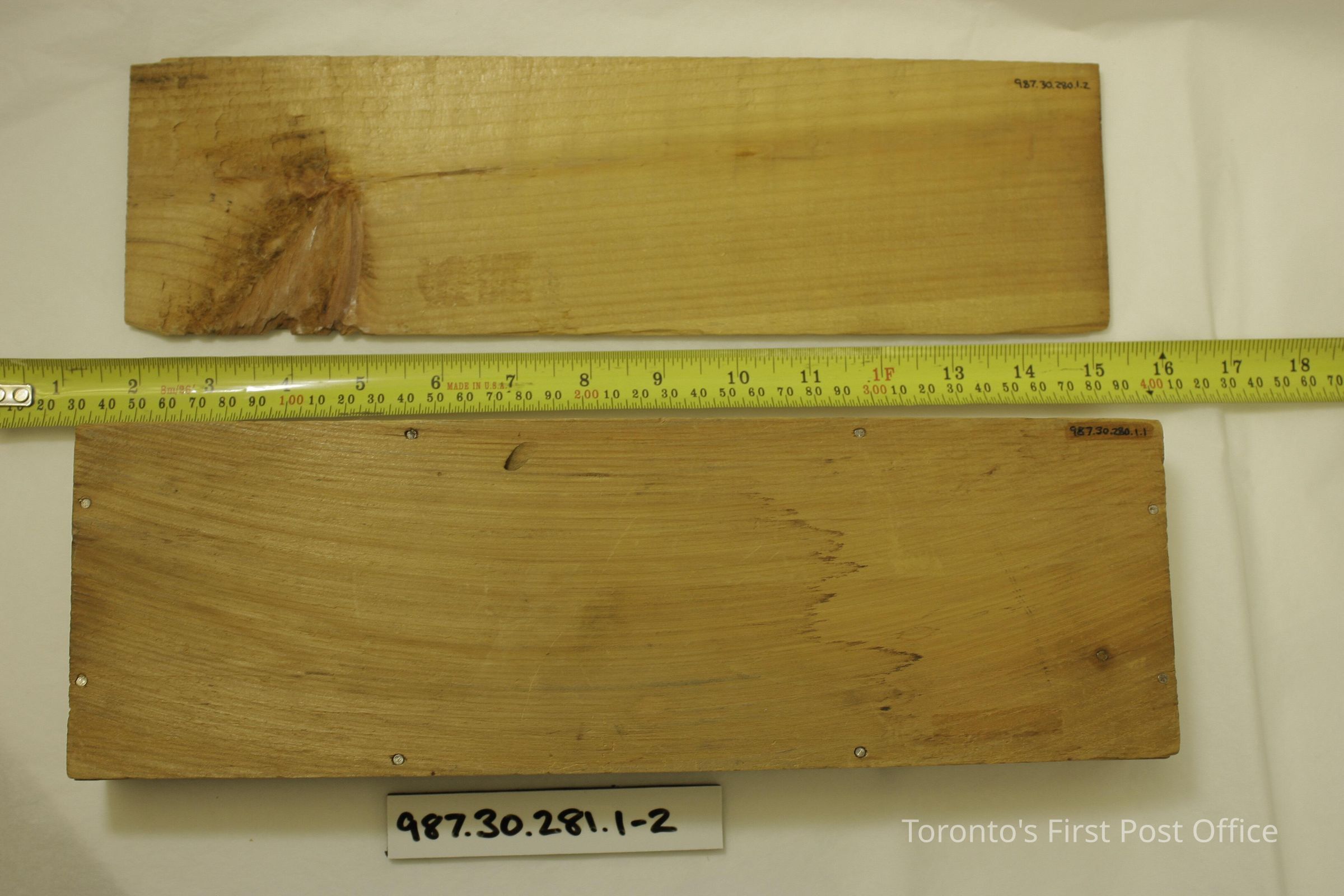 Two wooden brackets; dark stain and gloss; machine-made; 2 screw holes for wall attachment; was used as a pistol rack for R987.30.266 (deaccessioned).Dimensions