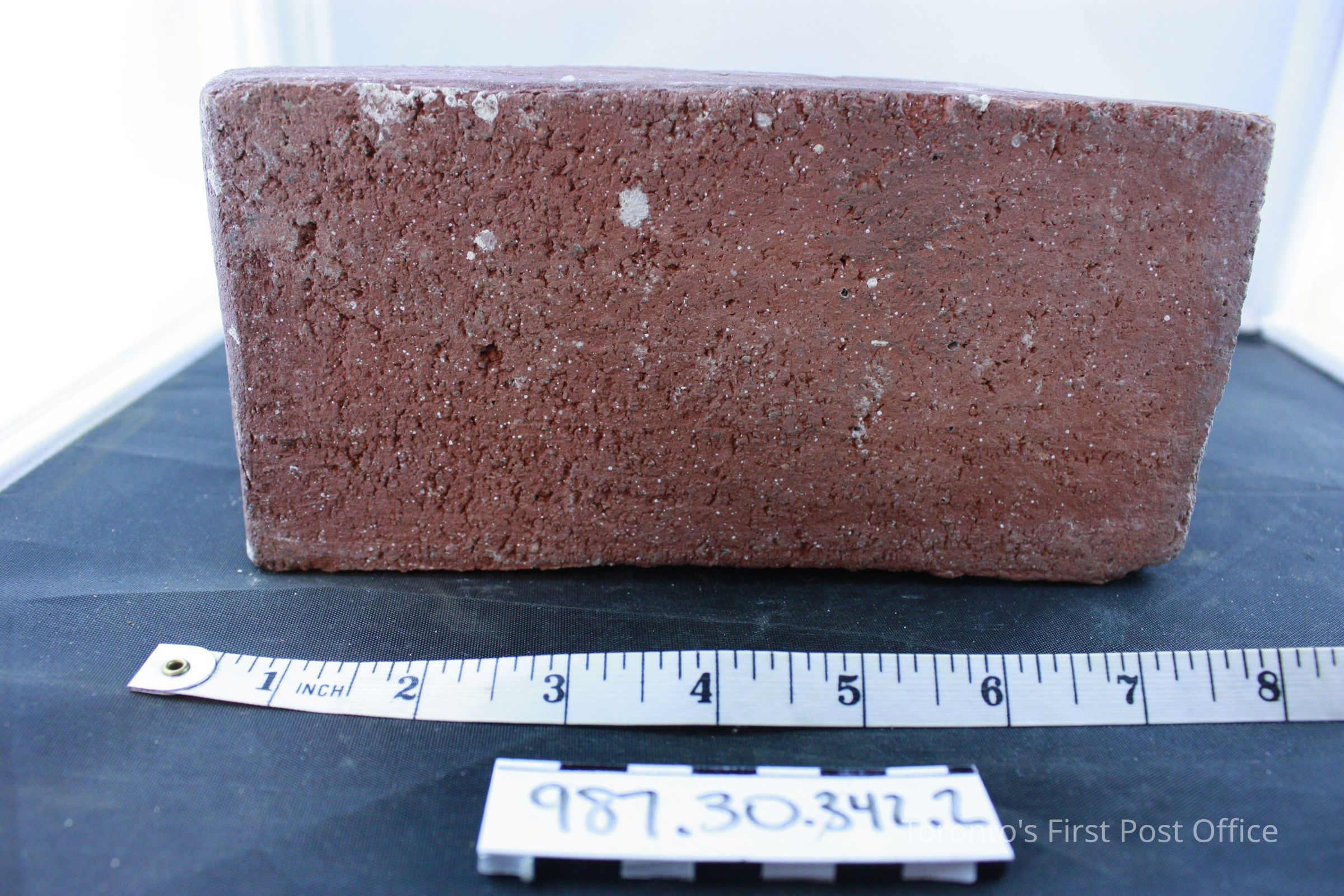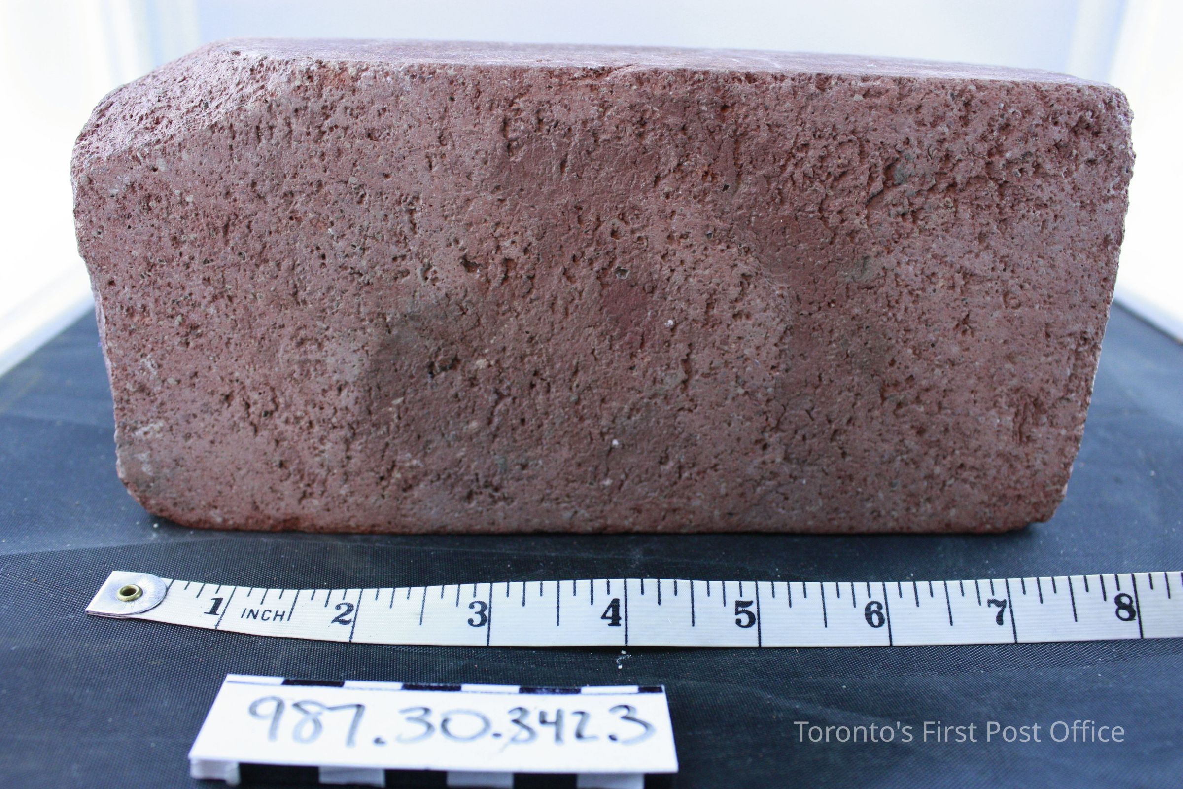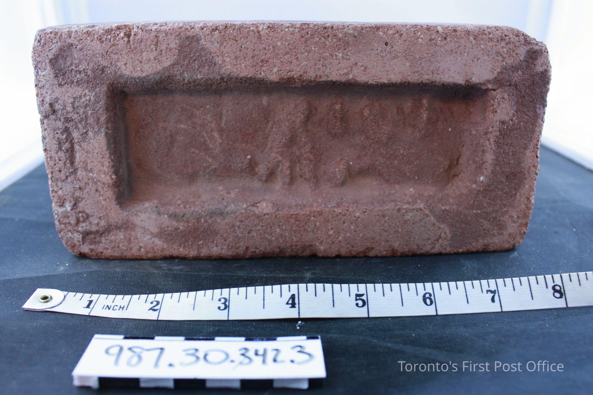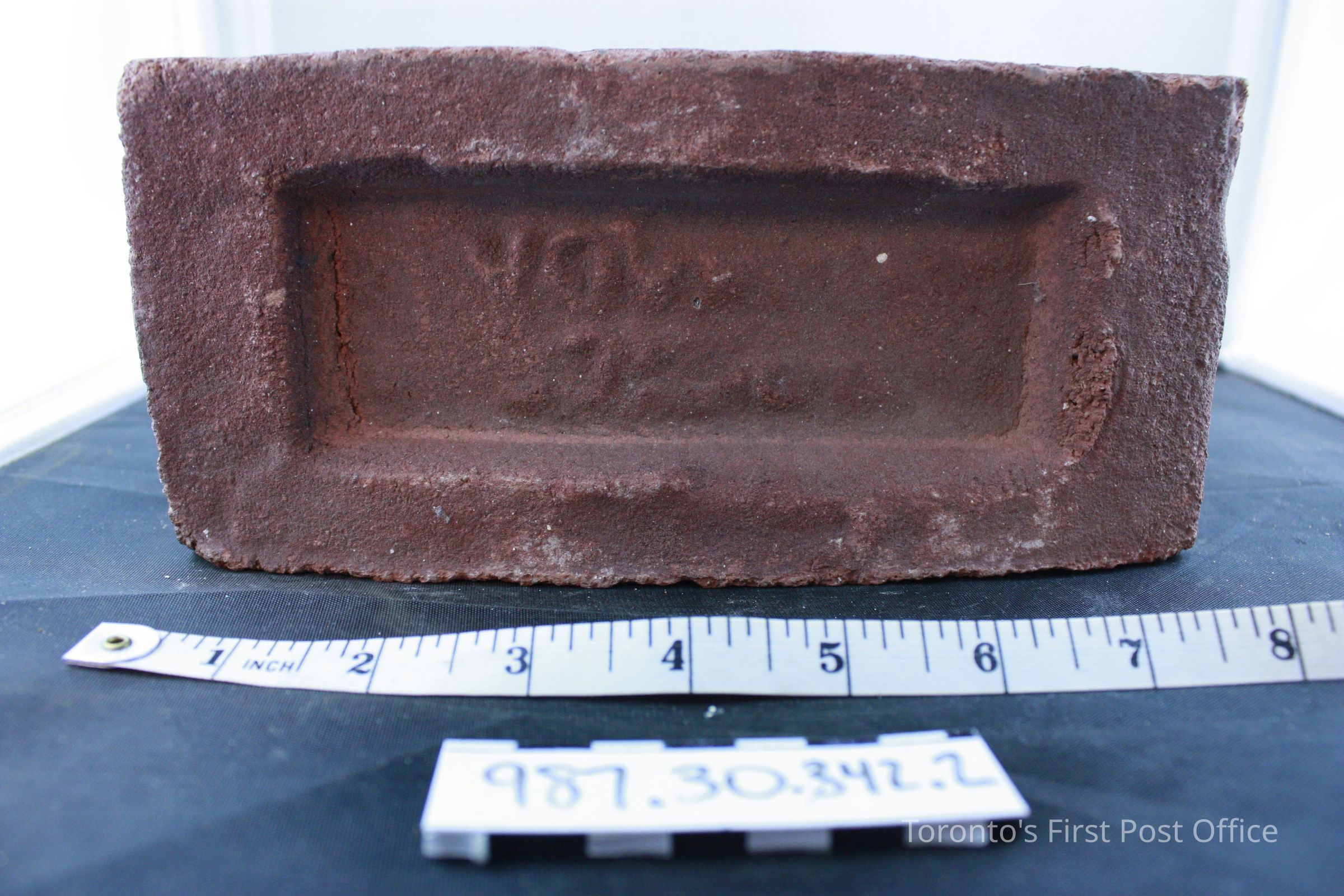 Four bricks; each has one flat side; one side with ridge and identification of maker (not legible); .1 = yellow brick, from De La Salle Institute, circa 1871; .2-.4 = red bricks, from Post Office, circa 1833.Dimensions