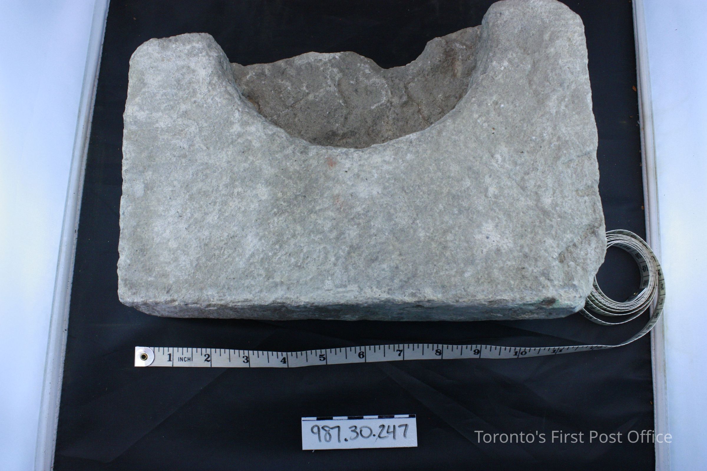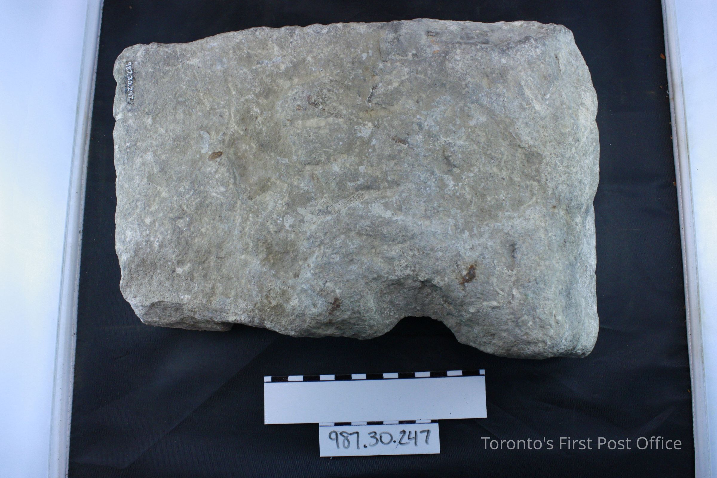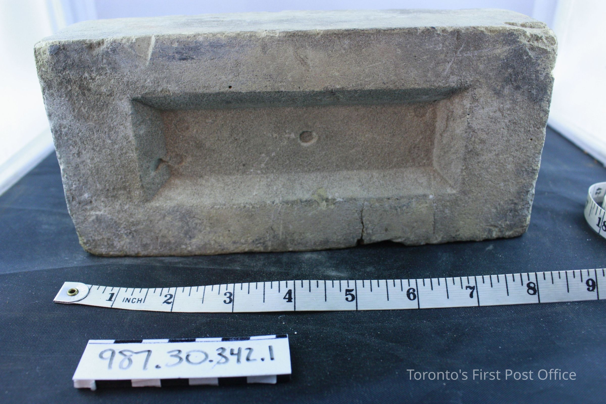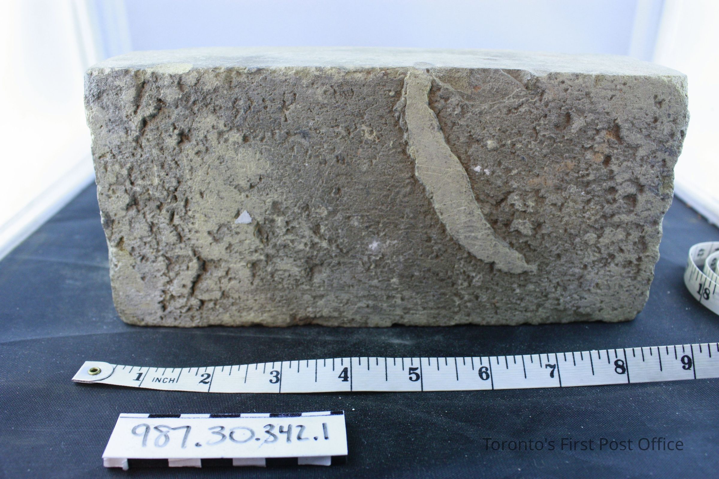 Four bricks; each has one flat side; one side with ridge and identification of maker (not legible); .1 = yellow brick, from De La Salle Institute, circa 1871; .2-.4 = red bricks, from Post Office, circa 1833.Dimensions