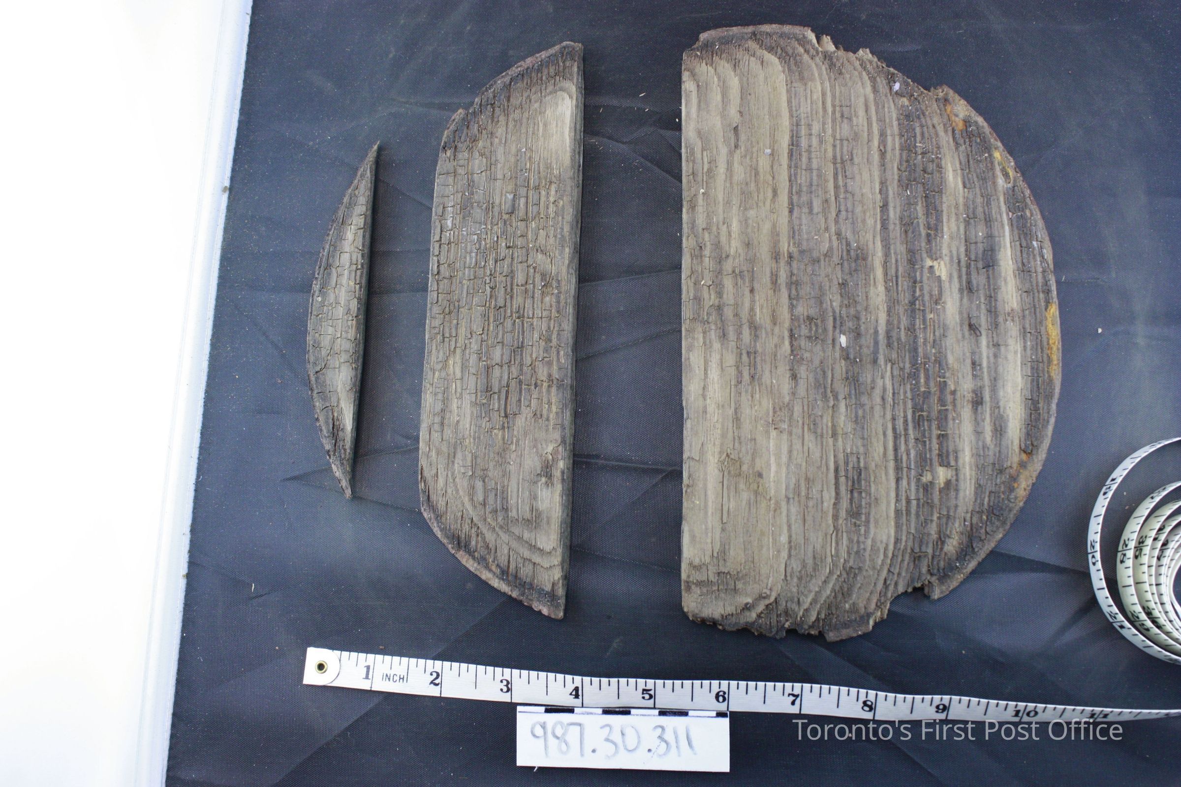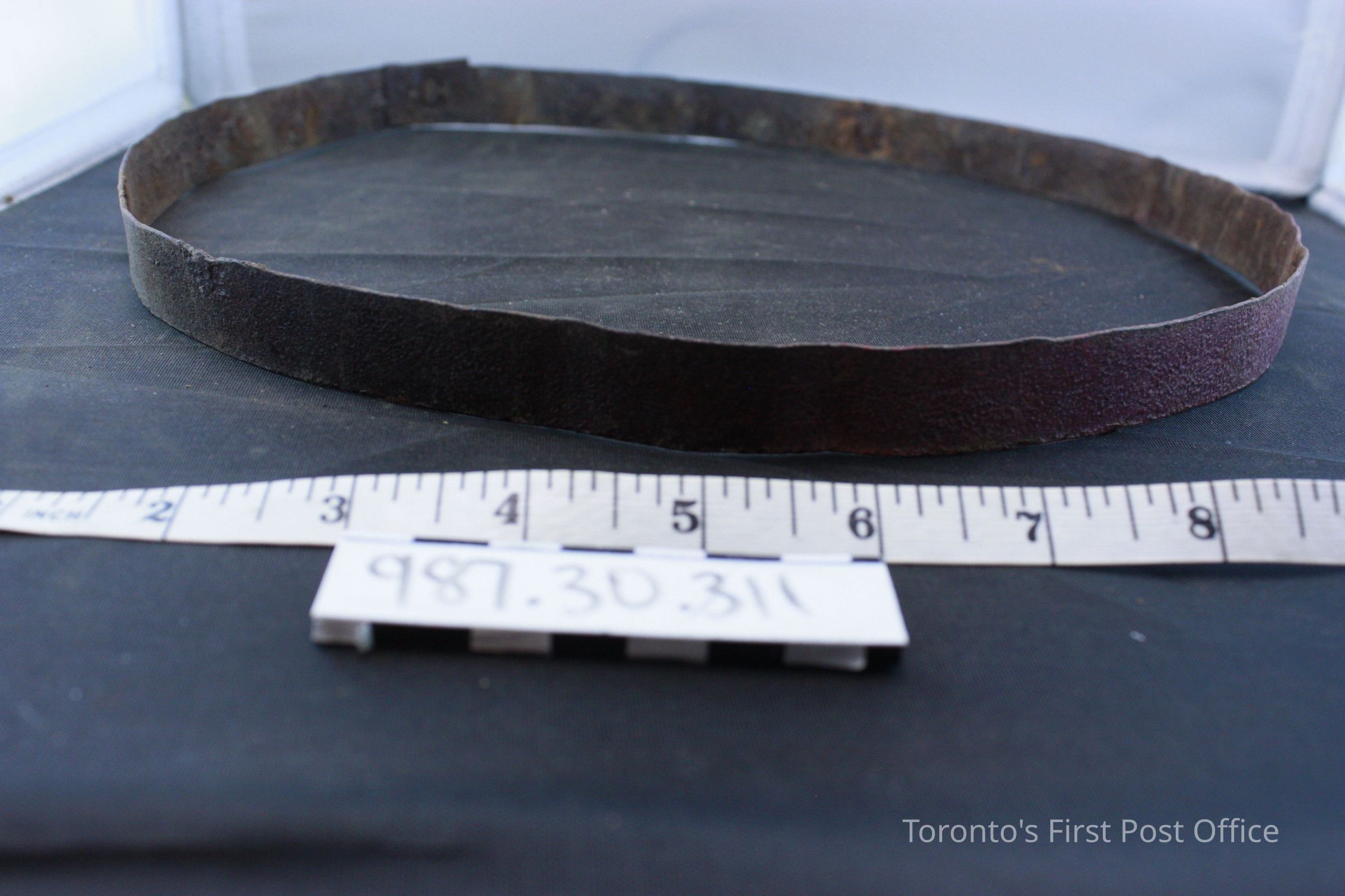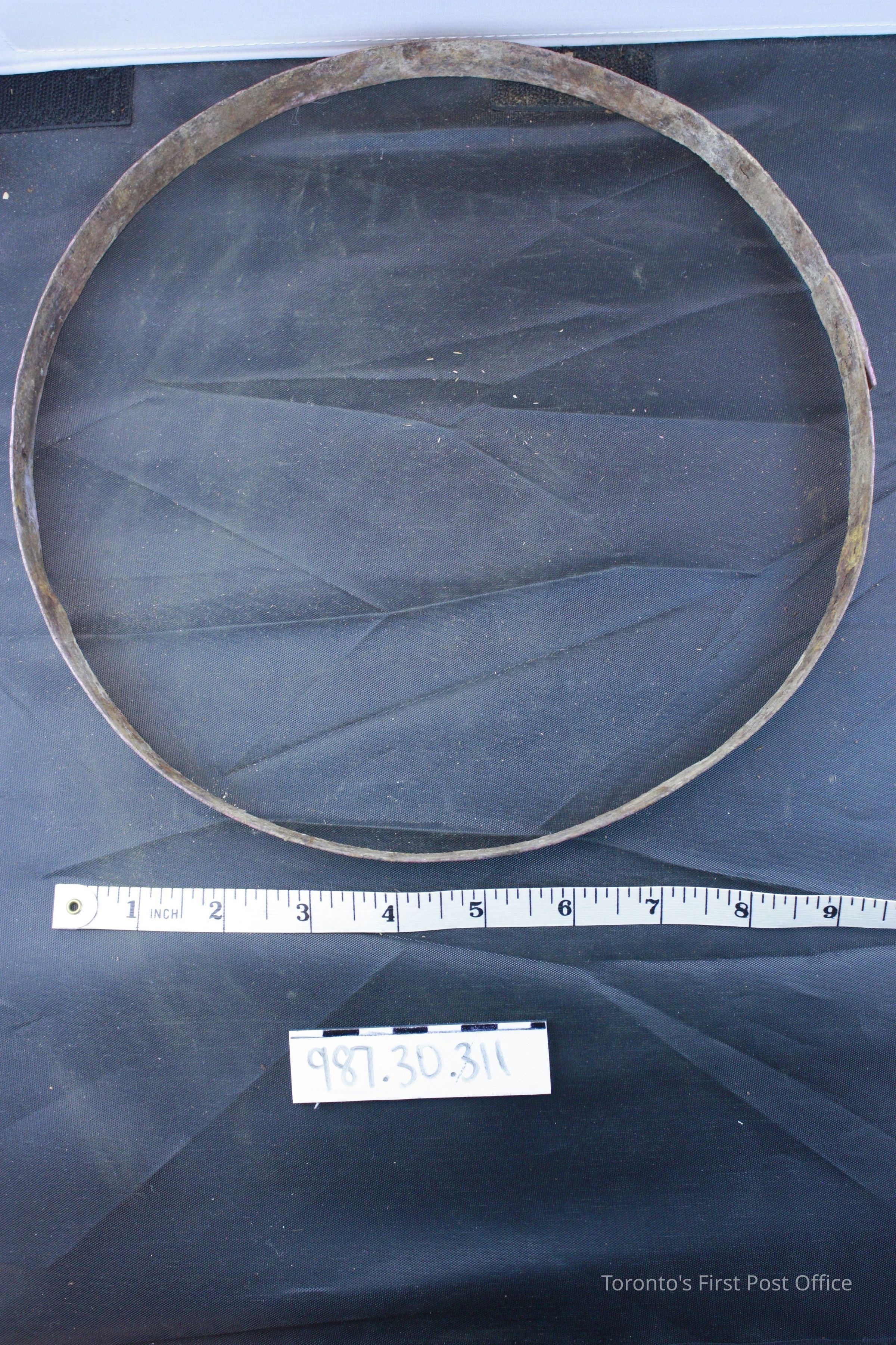 Wooden staves held together by 2 metal rings; rings held together by rivets; no handle. Found damaged and in pieces Oct 2005.