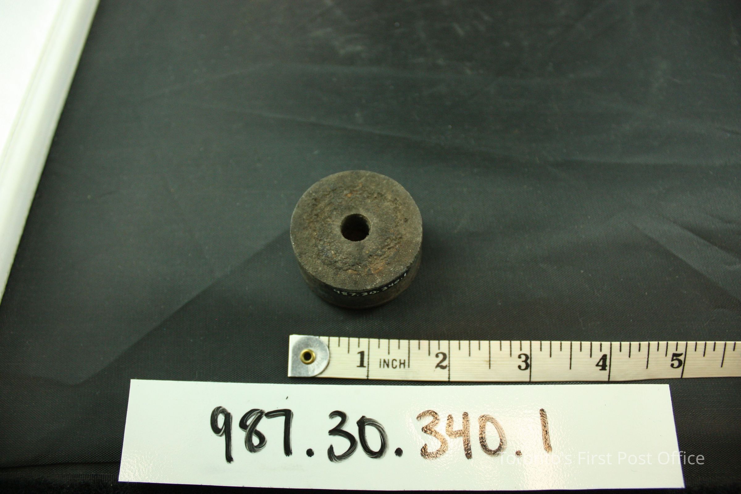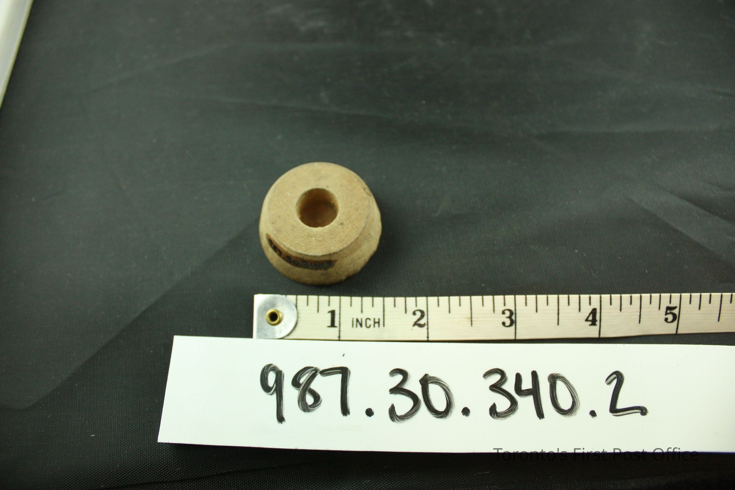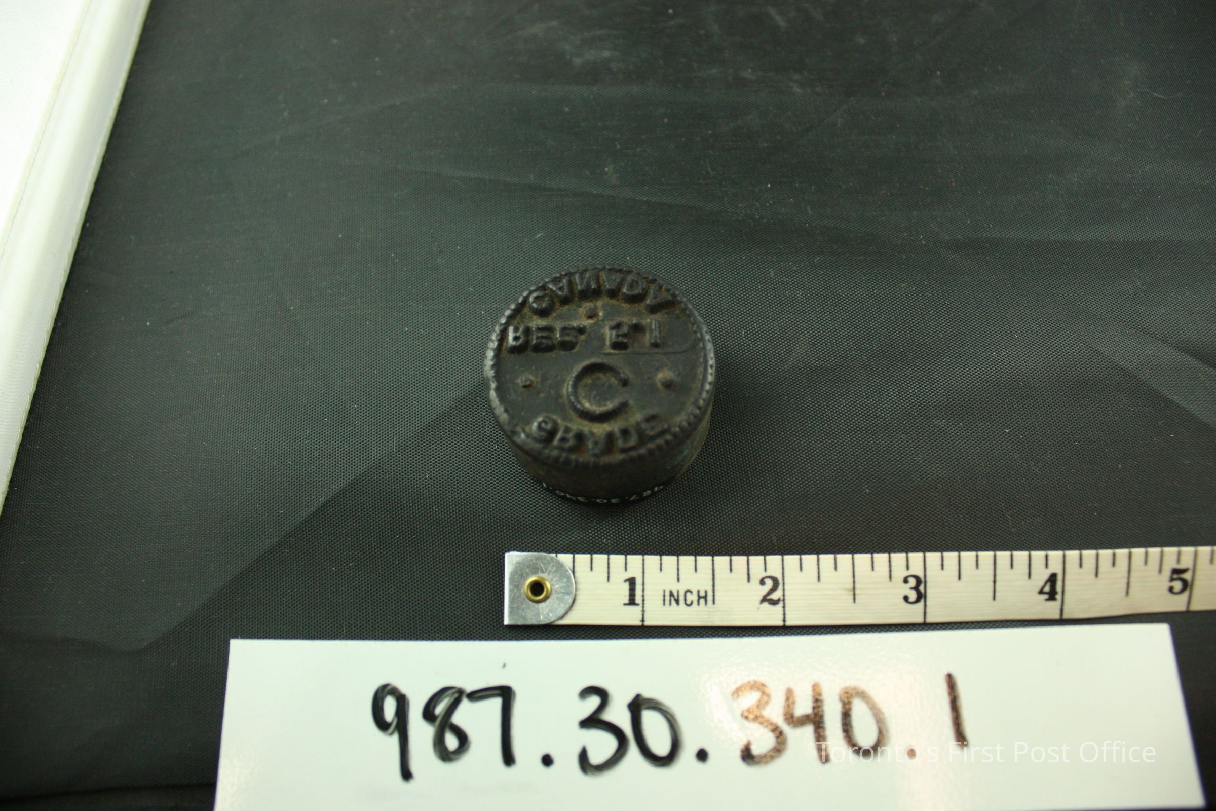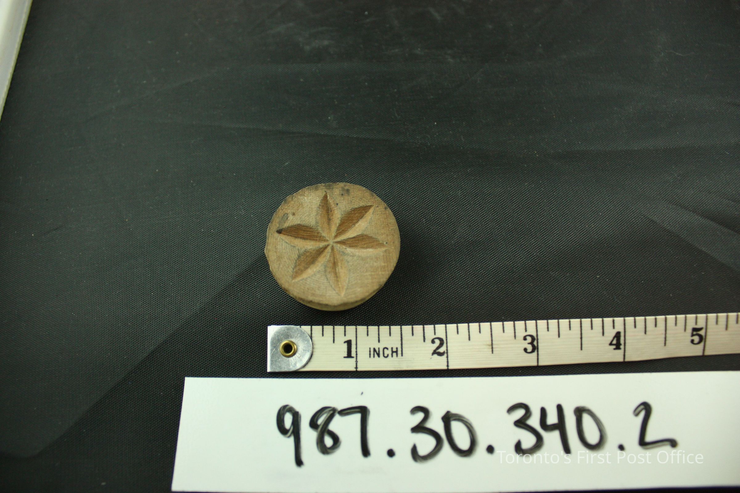 Wooden butter press; relief in circular pattern: "GRADE C REC. 5.1 CANADA"; hole on opposite side, probably for a handle; found in 1980 in debris left after 1978 fire on second floor of De La Salle Institute.Dimensions